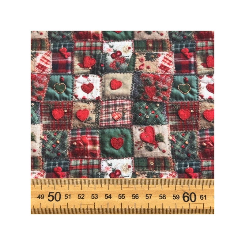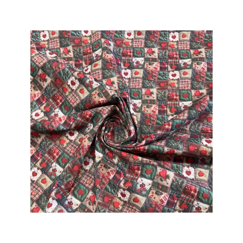 Tela 100% algodón tipo patchwork, con estampados variados.