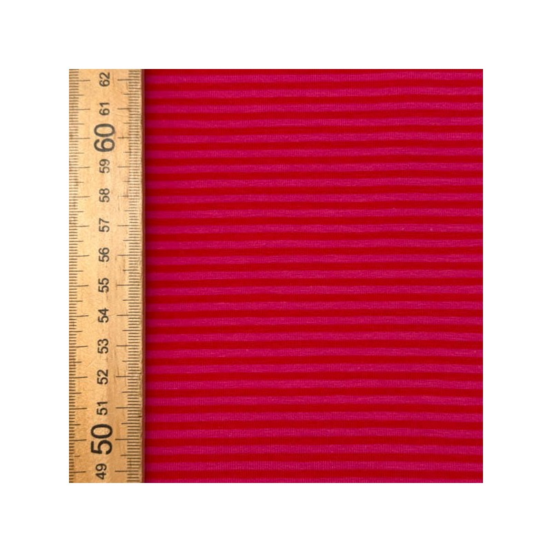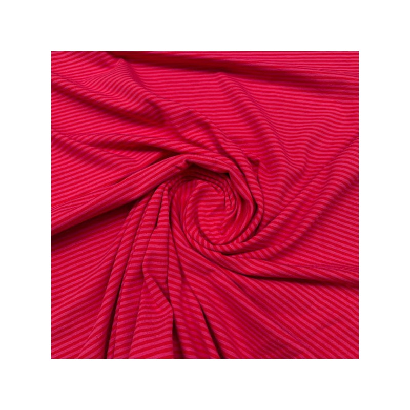 Punto de camiseta elástico en ambas direcciones. Esta tela tiene certificado OEKO-TEX Standard 100. Las rayas de 3 mm de ancho están tejidas no estampadas.
