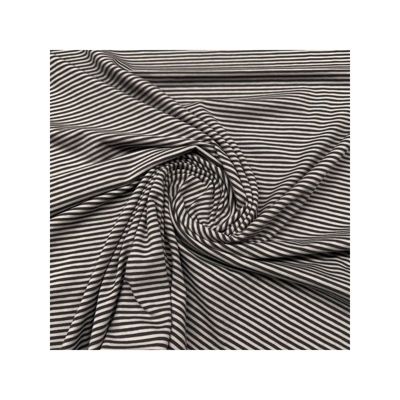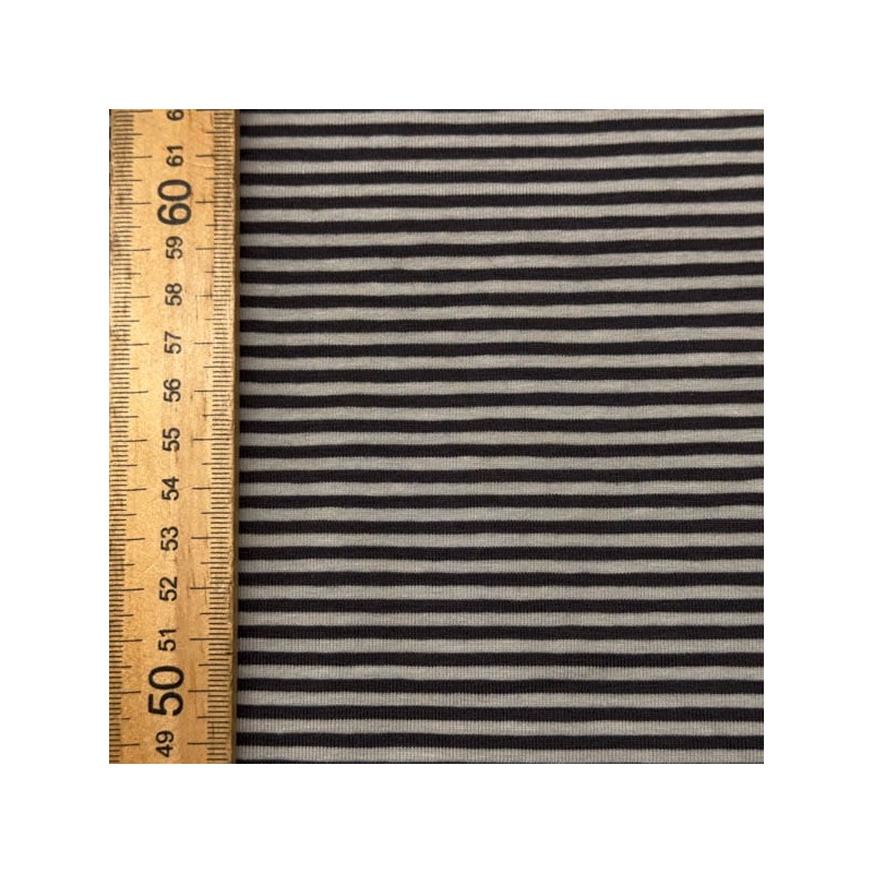 Punto de camiseta elástico en ambas direcciones. Esta tela tiene certificado OEKO-TEX Standard 100. Las rayas de 3 mm de ancho están tejidas no estampadas.