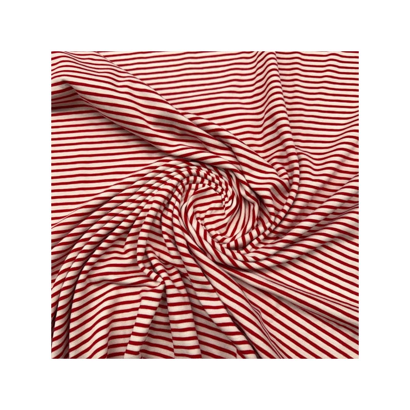 Punto de camiseta elástico en ambas direcciones. Esta tela tiene certificado OEKO-TEX Standard 100. Las rayas de 3-5 mm de ancho están tejidas no estampadas.