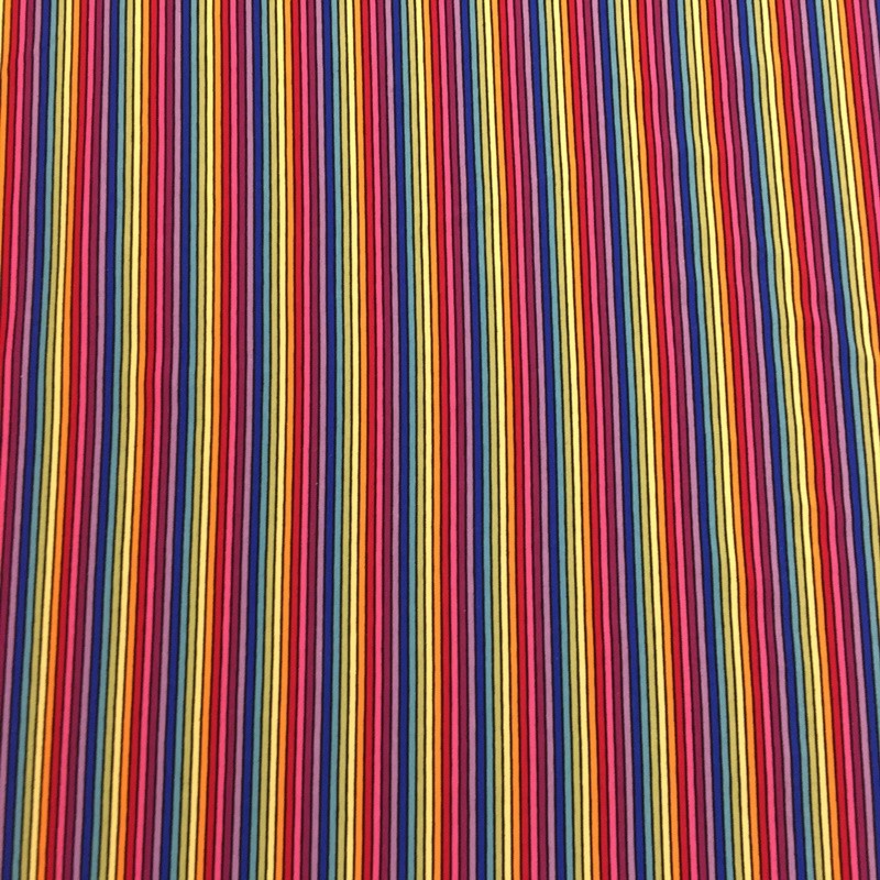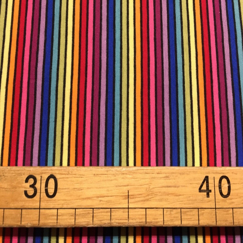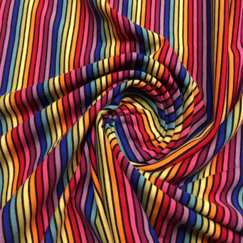 Punto de camiseta elástico en ambas direcciones. Esta tela tiene certificado OEKO-TEX Standard 100. Las rayas de 3-5 mm de ancho están tejidas no estampadas.