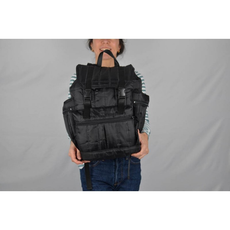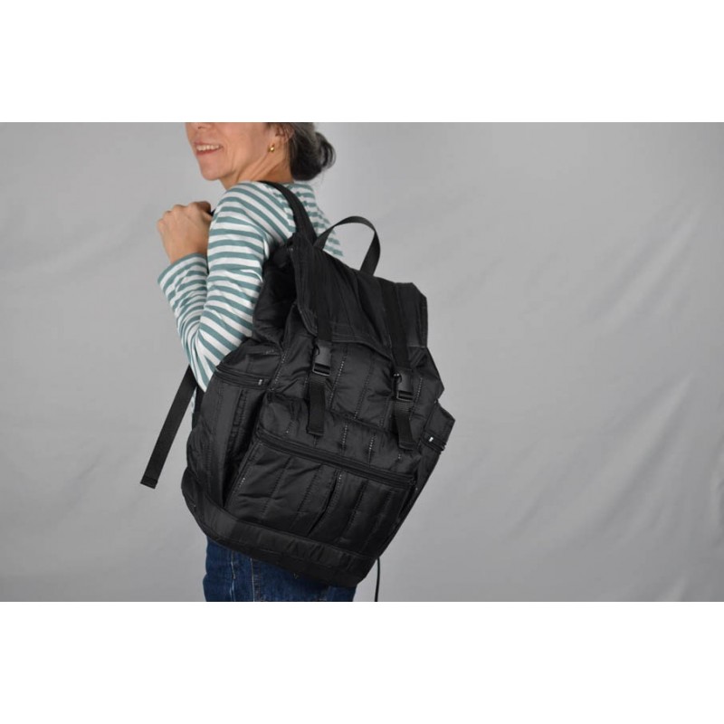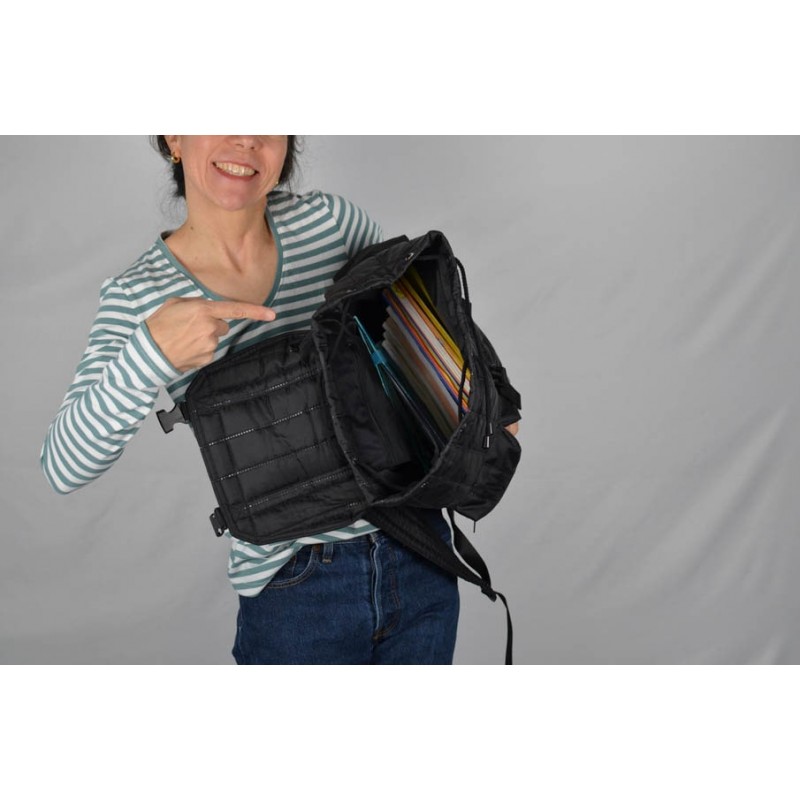 Telas medianas a gruesas con cuerpo, sin caída y sin elasticidad, preferentemente impermeables, como acolchadas, lona encerada, 3D, vaquero, canvas ... Asegúrate de que tu máquina puede coserlo. Para forro telas medianas tipo nylon o popelin. Necesitarás materiales específicos: broche a presión, cremallera, cinta de mochila, hebilla, tensor, ojetes, cordón.