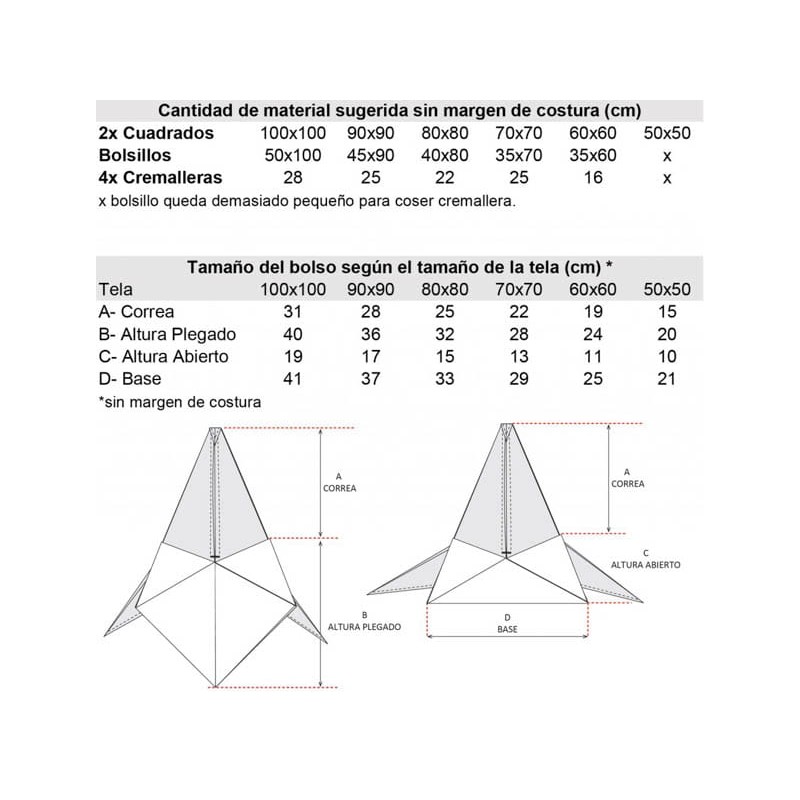 Tamaños: El tamaño del bolso depende del cuadrado de la tela, puedes hacer cualquier tamaño, ver tabla