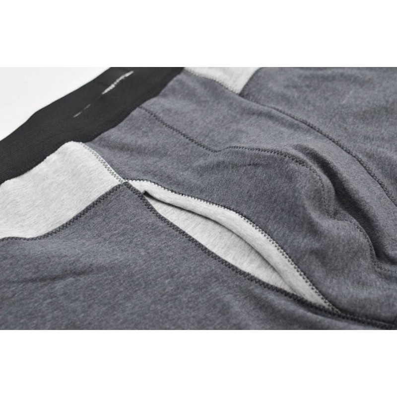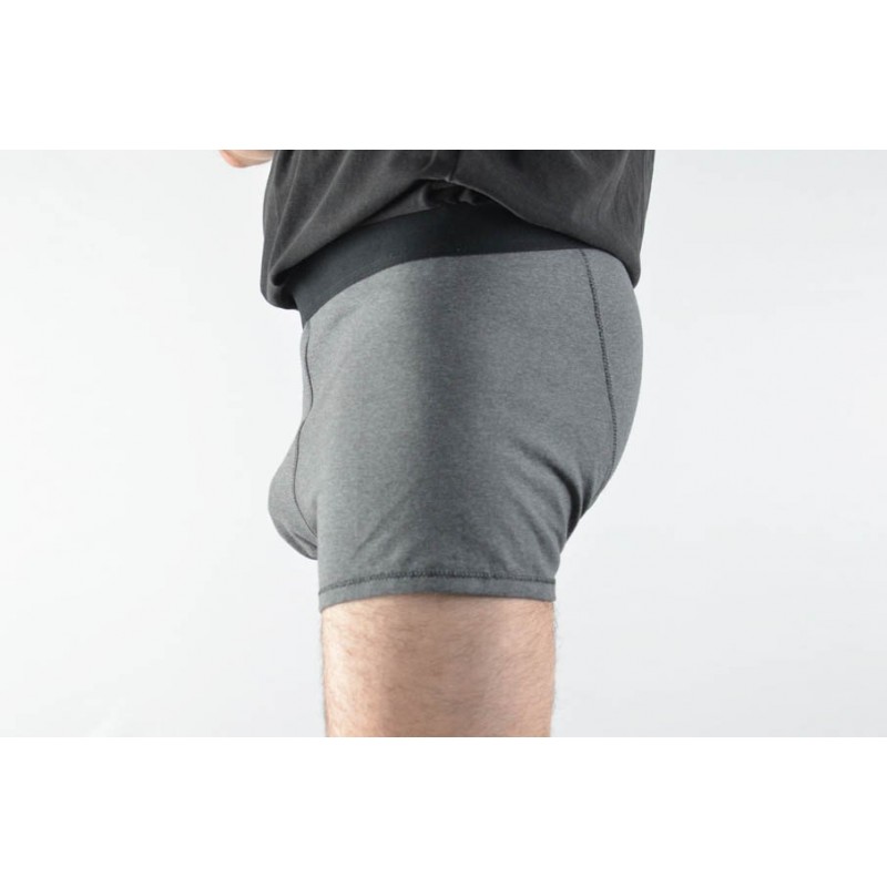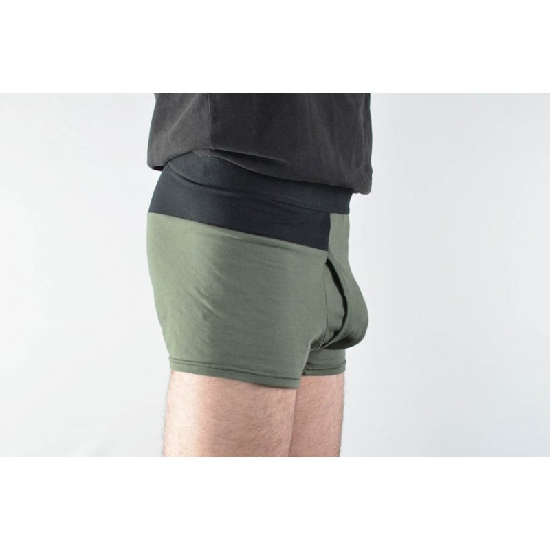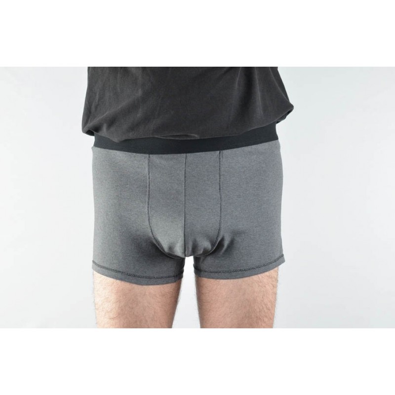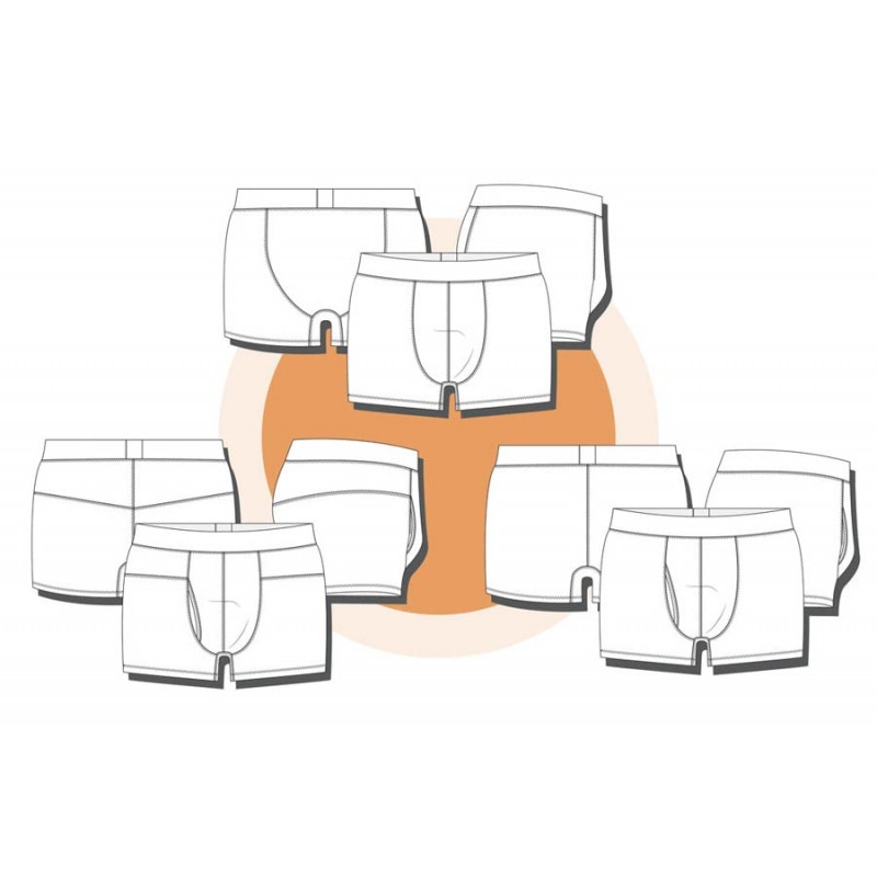 Patrón de los calzoncillos tipo bóxer adulto. Calzón ajustado al cuerpo, abertura opcional en el delantero, dobladillo en el bajo y cinturilla elástica con el elástico a la vista o dentro de la tela.