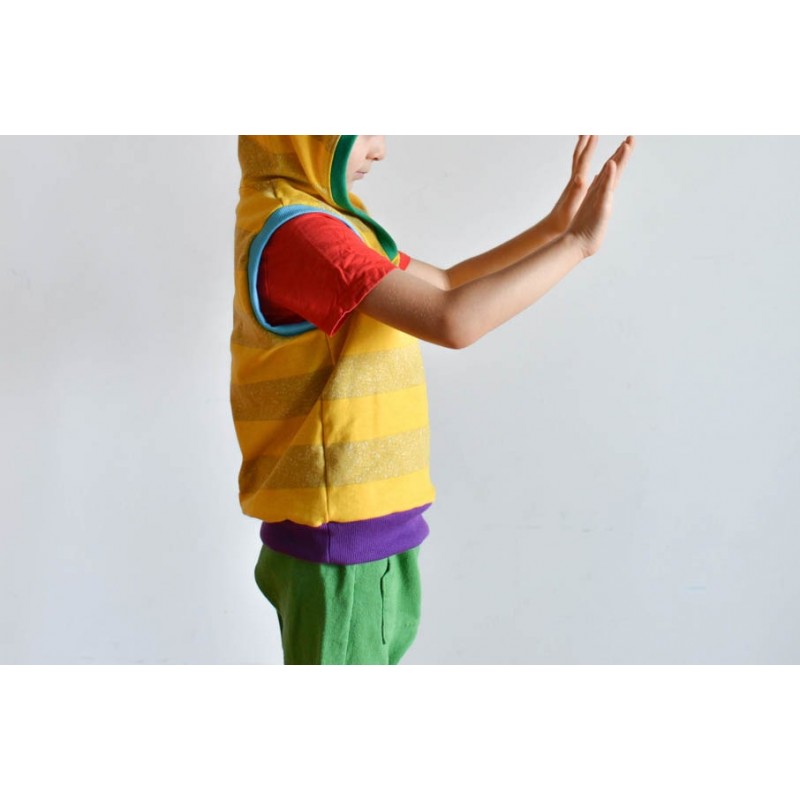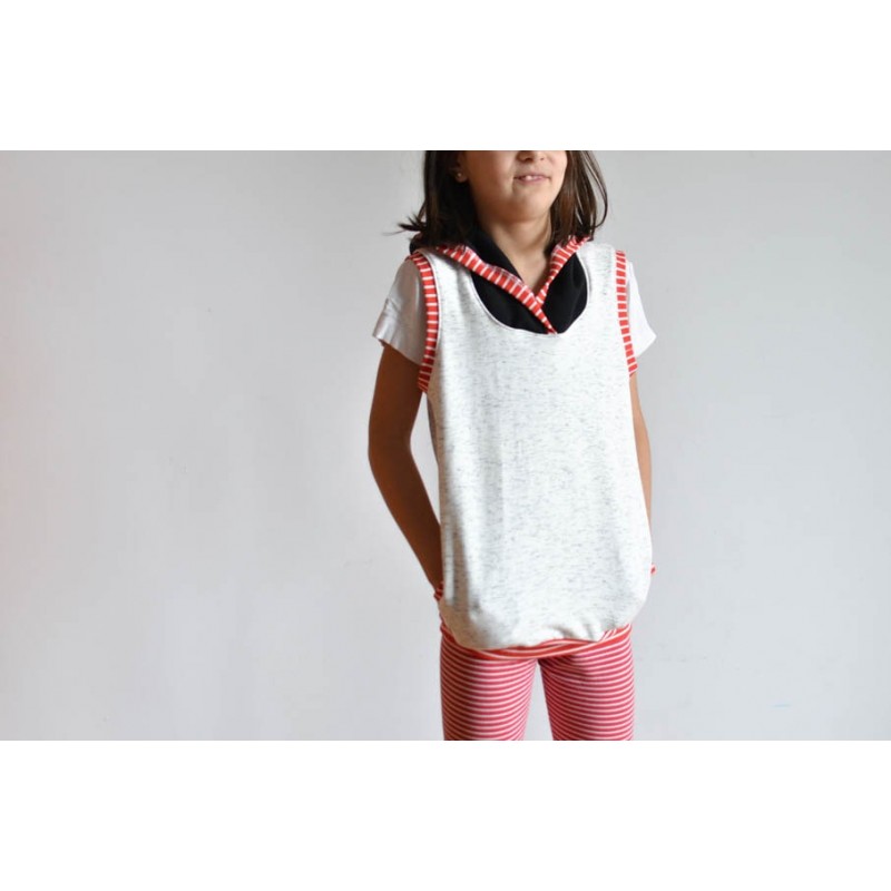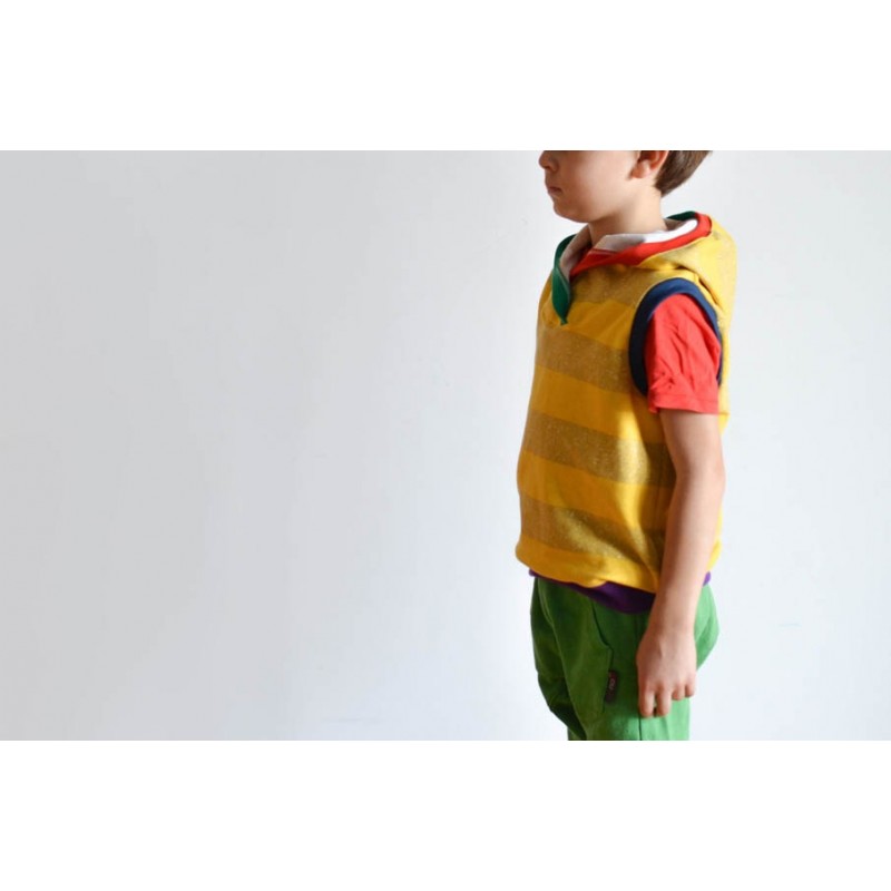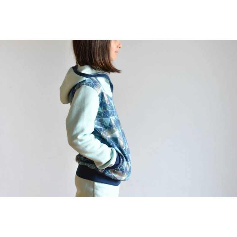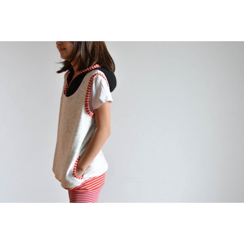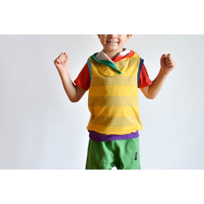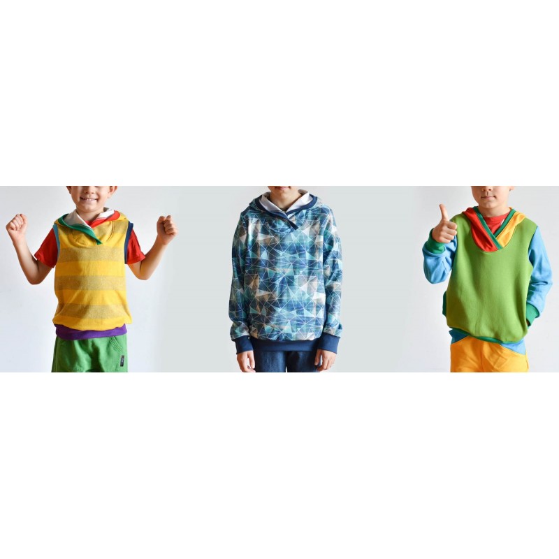 Patrón de sudadera o chaleco infantil Ese. Sudadera con capucha y bolsillos laterales. Puedes coser como sudadera con manga larga o chaleco. Remates de sisa, mangas y bajo con puños.