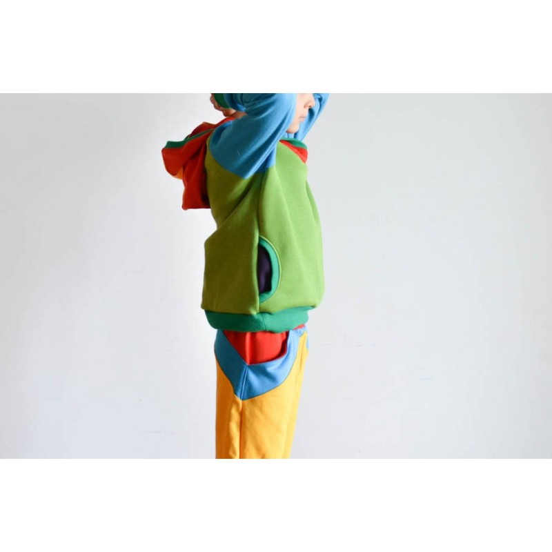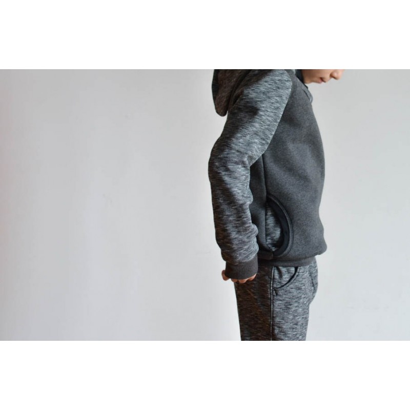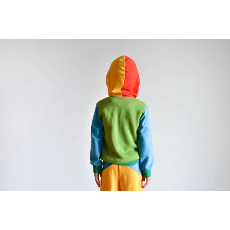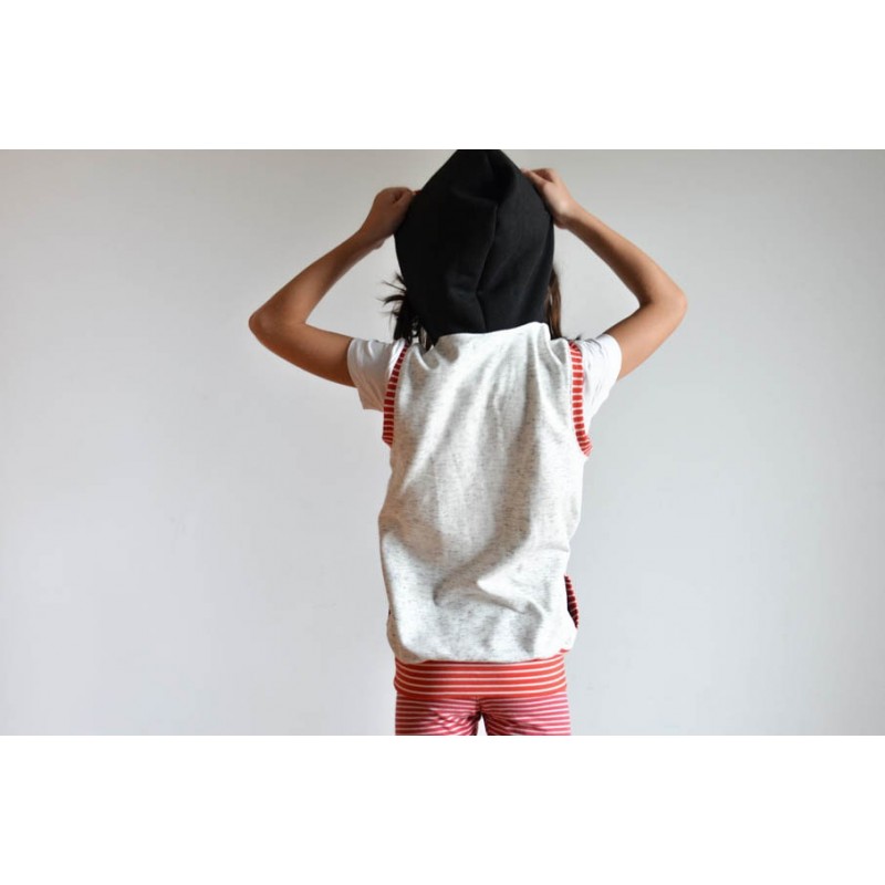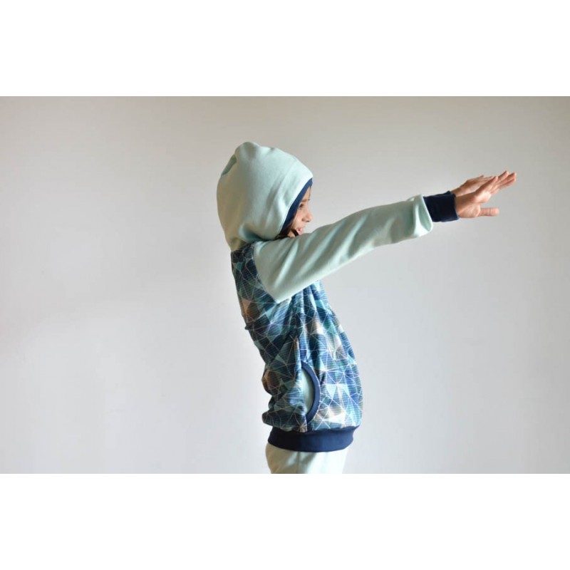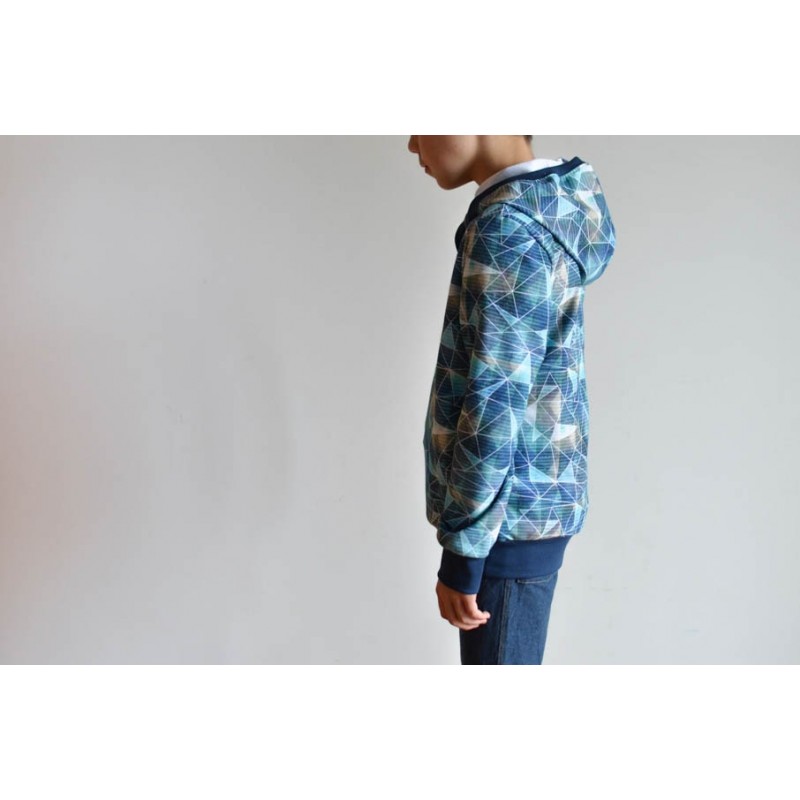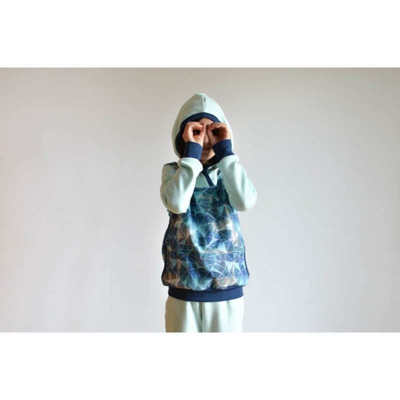 Patrón de sudadera o chaleco infantil Ese. Sudadera con capucha y bolsillos laterales. Puedes coser como sudadera con manga larga o chaleco. Remates de sisa, mangas y bajo con puños.