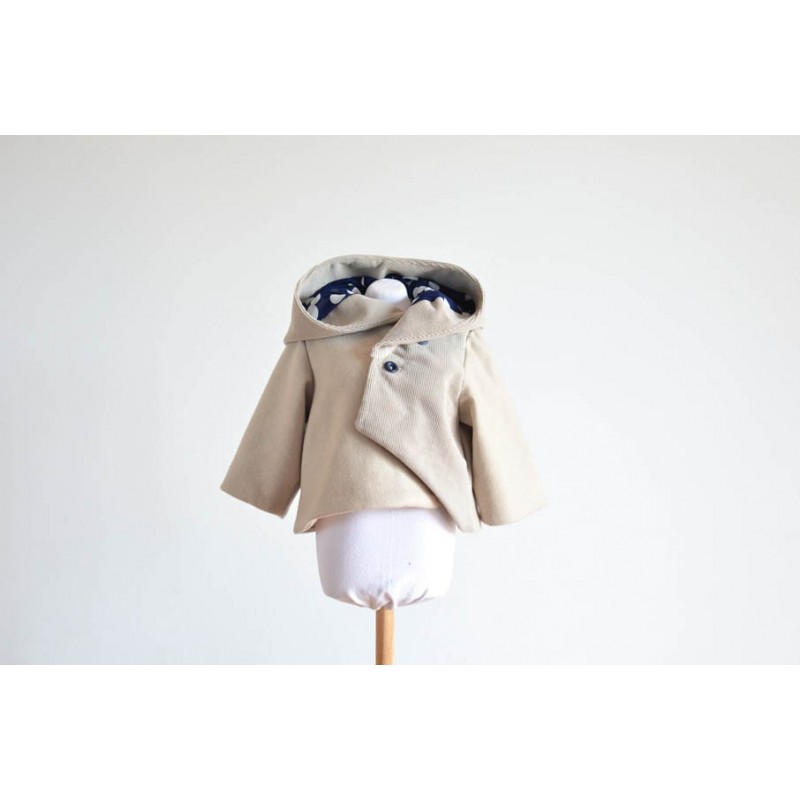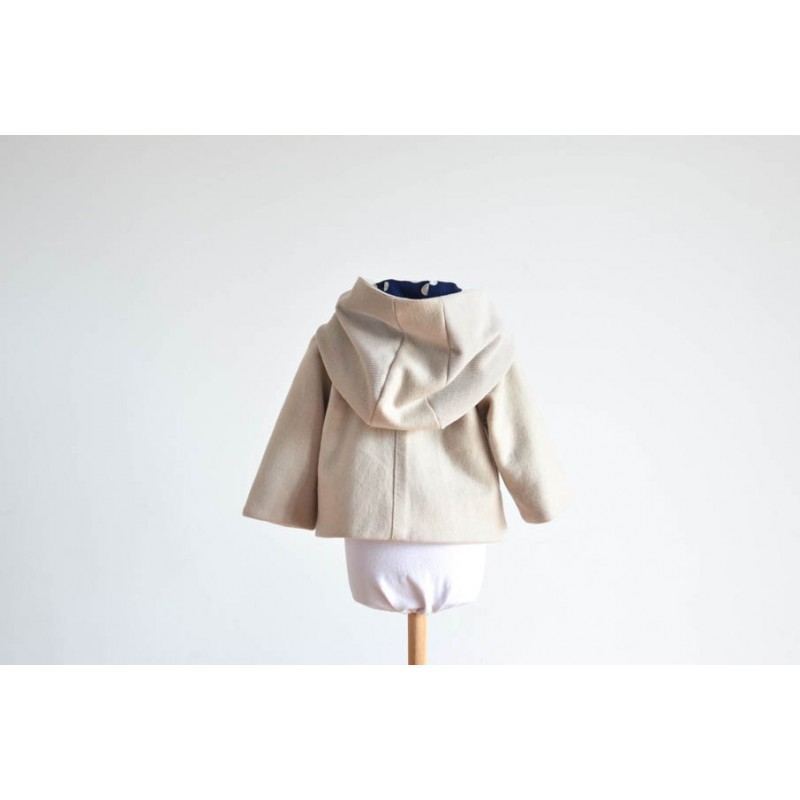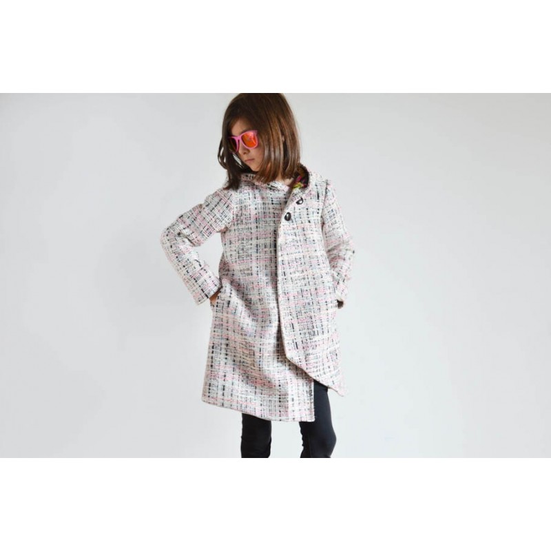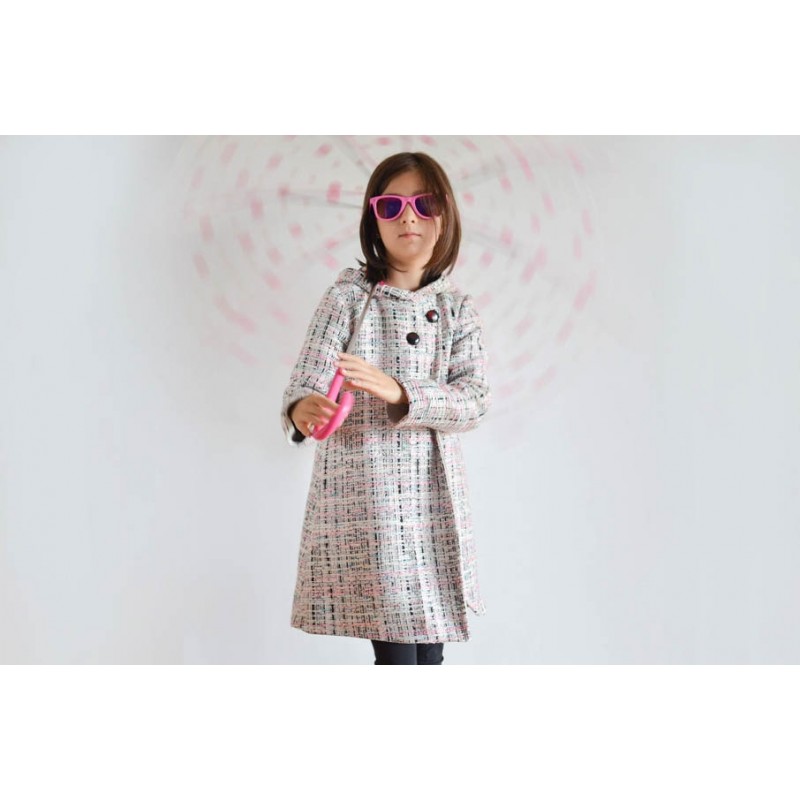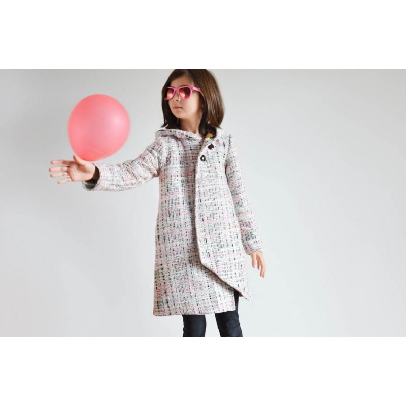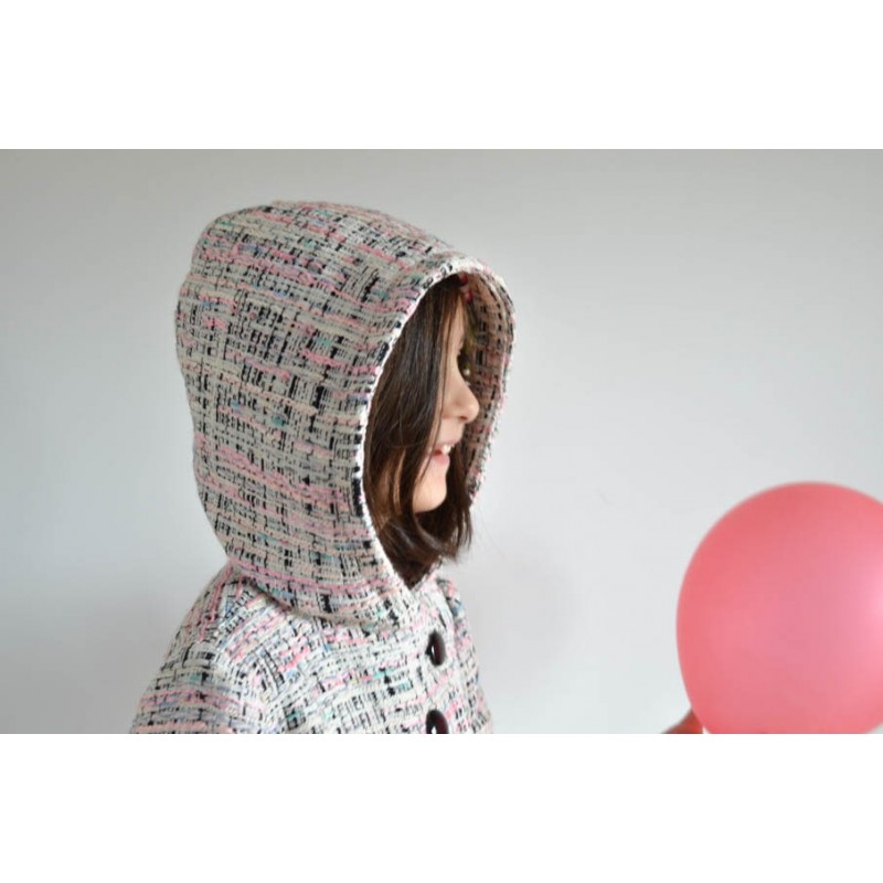 Patrón de abrigo infantil Iris. Abrigo forrado, asimétrico y cerrado con botones. Opción con o sin cuello o capucha. Bolsillos en los costados.