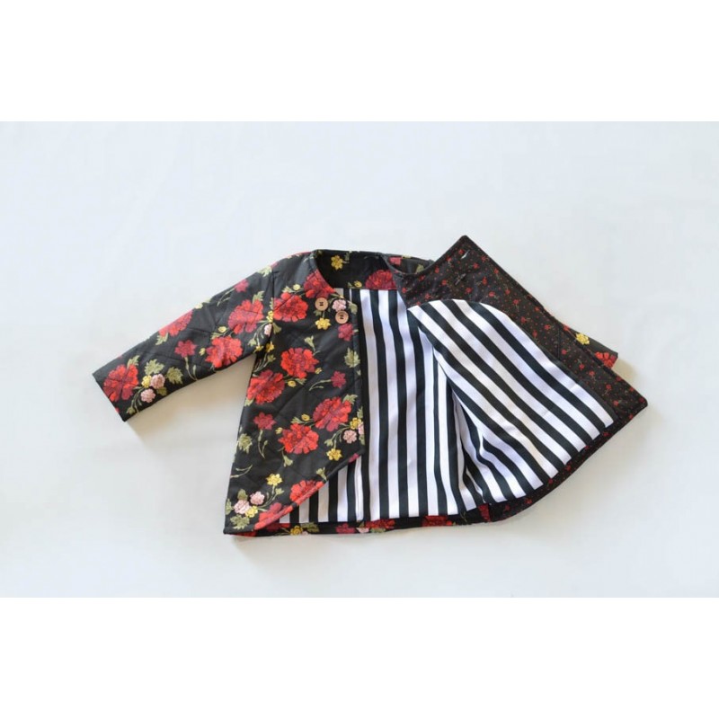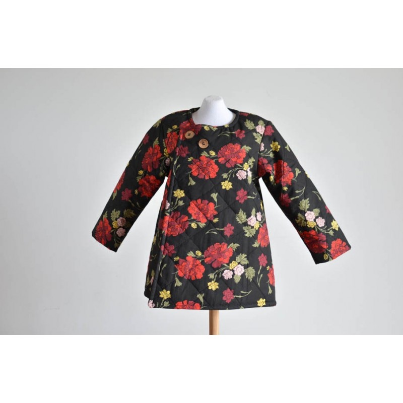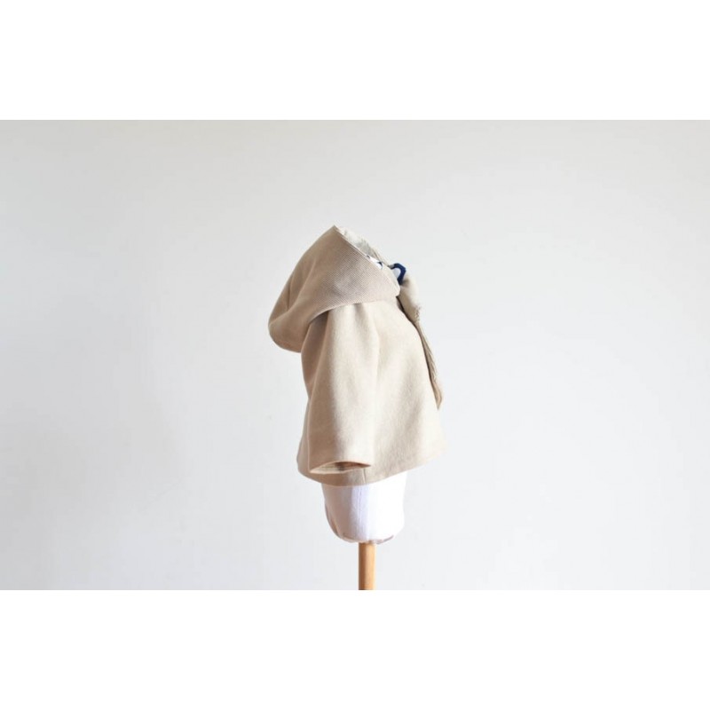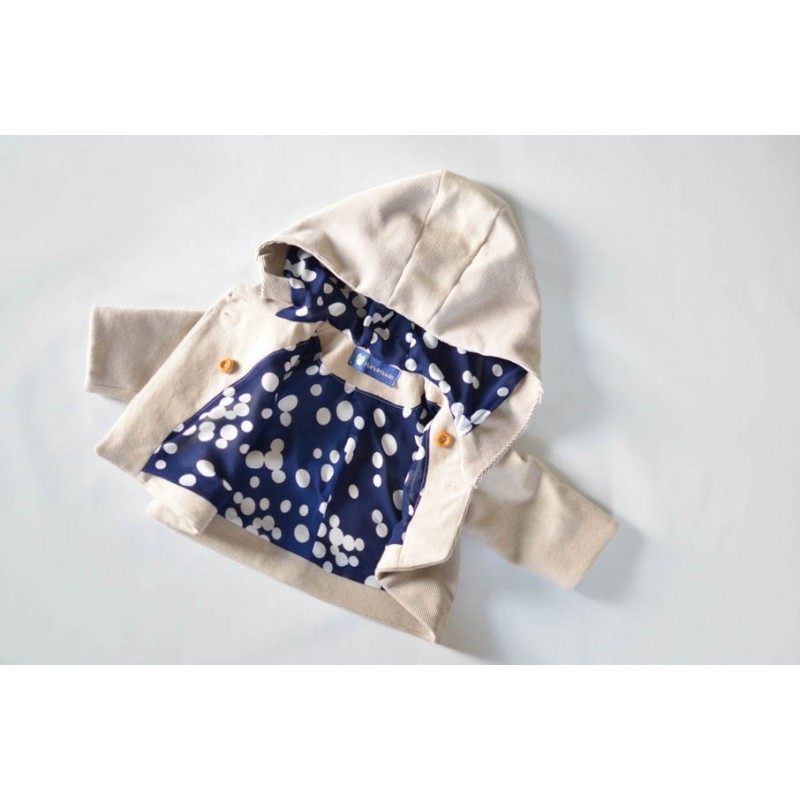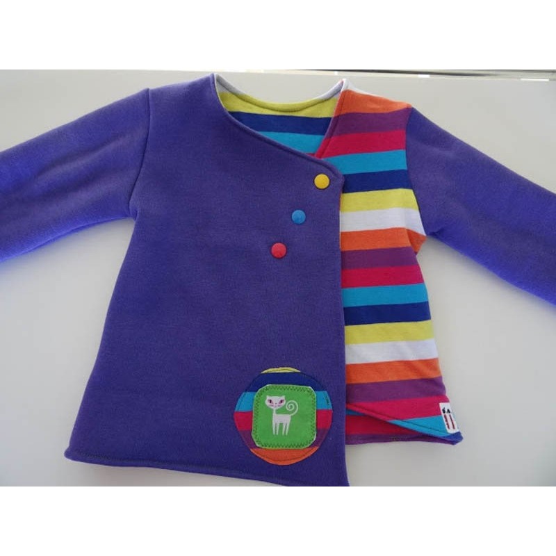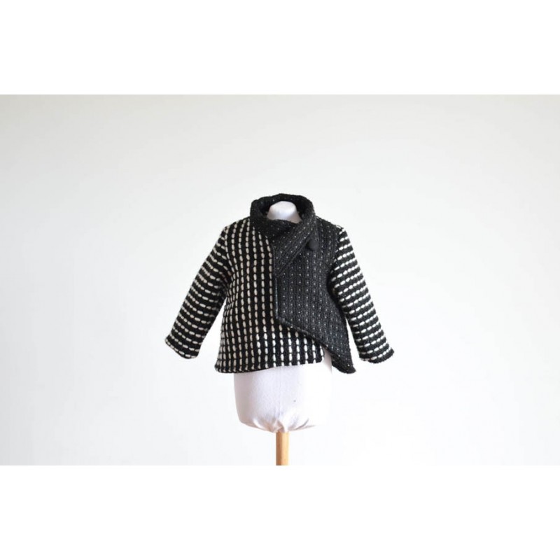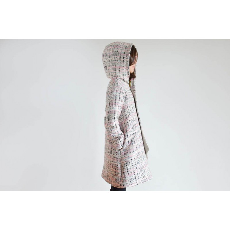 Patrón de abrigo infantil Iris. Abrigo forrado, asimétrico y cerrado con botones. Opción con o sin cuello o capucha. Bolsillos en los costados.