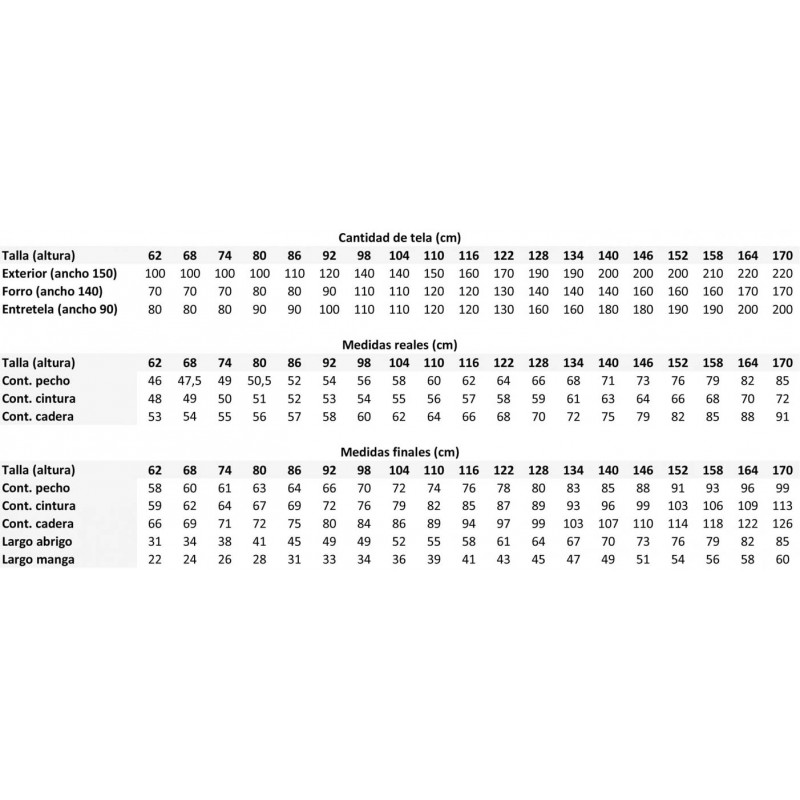 Tallas: de 62 a 92 y de 98 a 170 cm de altura aprox.