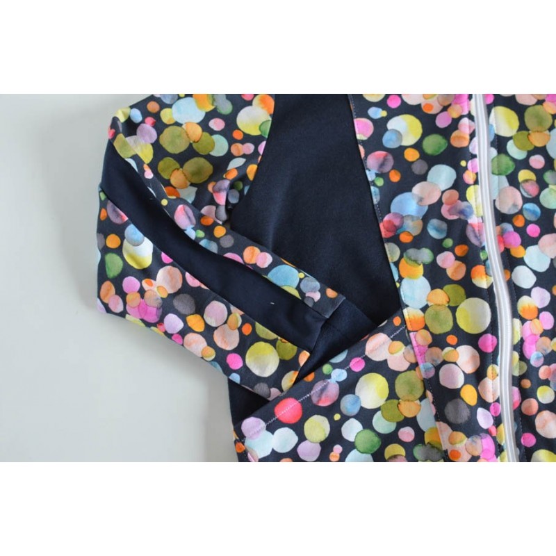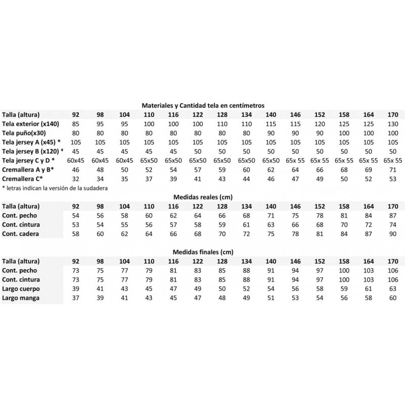 Para confeccionar esta sudadera puedes utilizar telas de sudadera con o sin elastan y para el interior y detalles, jersey con o sin elastan. Puño para bajo y bocamanga. Cremallera para las versiones A, B y C. Entretela solo para las versiones A y B.