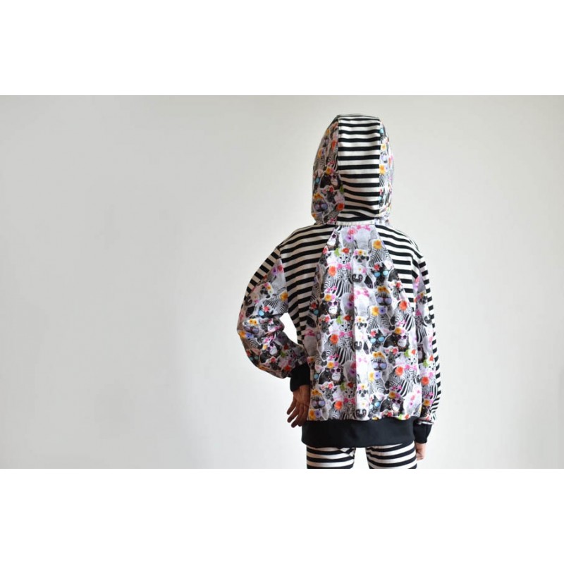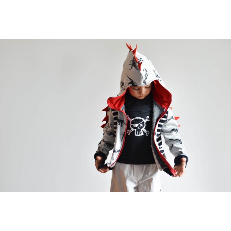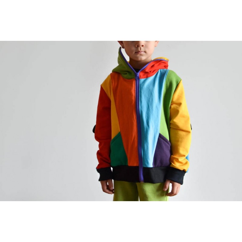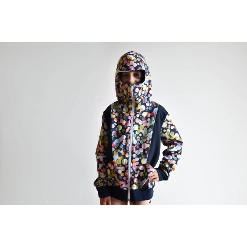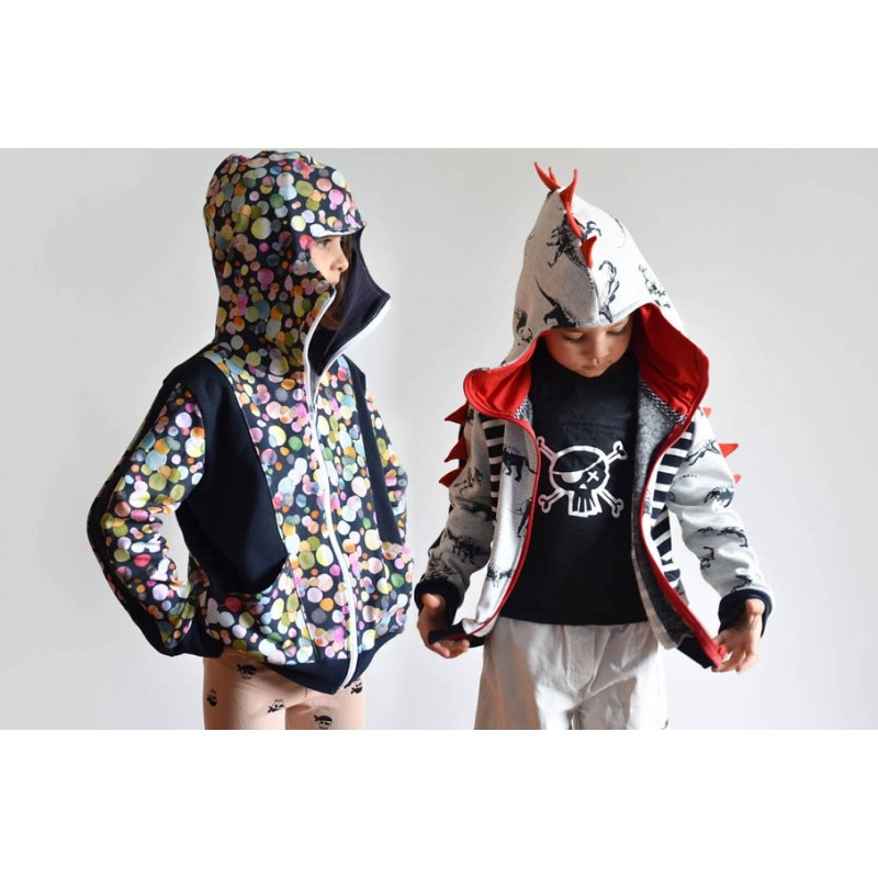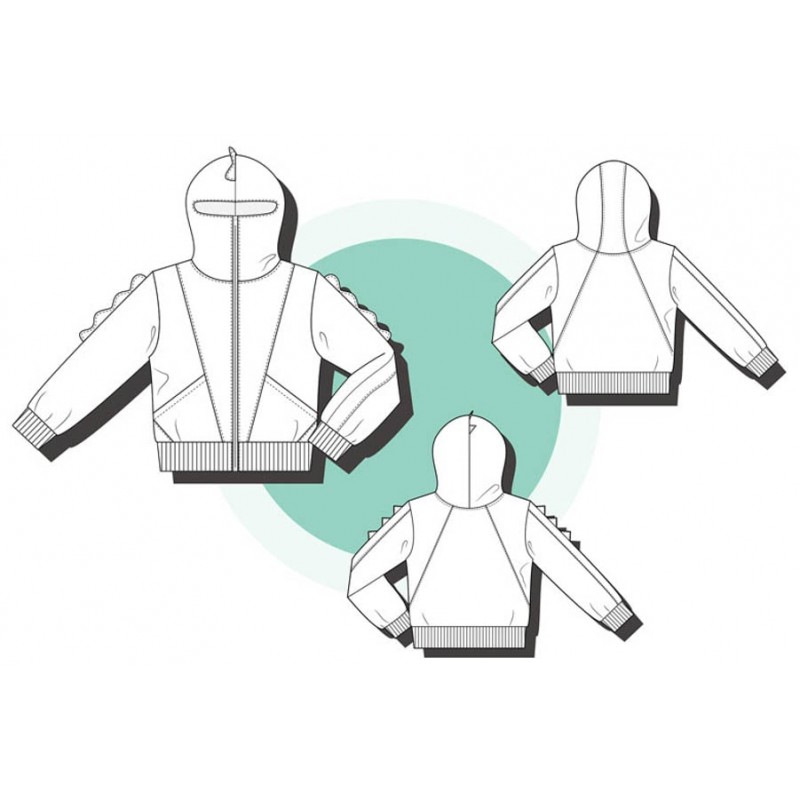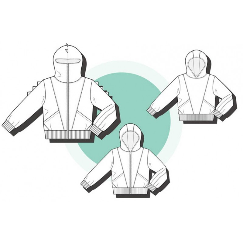 Patrón de sudadera infantil Alpha. Sudadera con capucha y bolsillos frontales. Sudadera divertida con patronaje peculiar. Capucha forrada de dos tipos: cerrada, tipo antifaz, o normal. Pareja perfecta de los Pantalones Alpha. Varias posiciones para coser. Dos versiones con cremallera y capucha antifaz: la versión A con detalles triangulares en la capucha y la versión B con detalles en ondas. Otras dos versiones con capucha normal: la versión C con cremallera y la versión D sin cremallera.