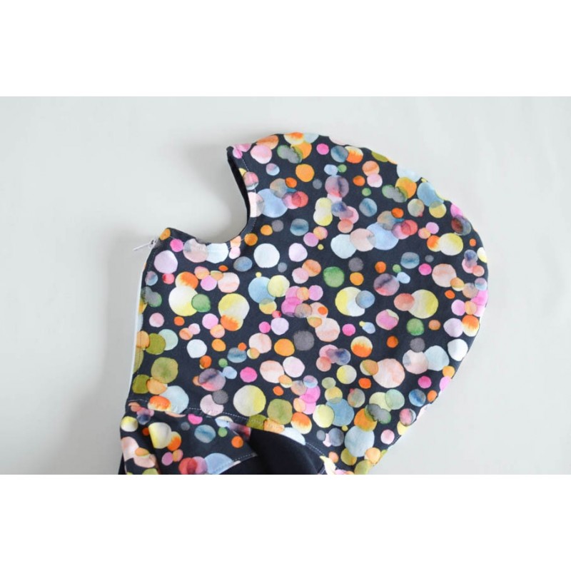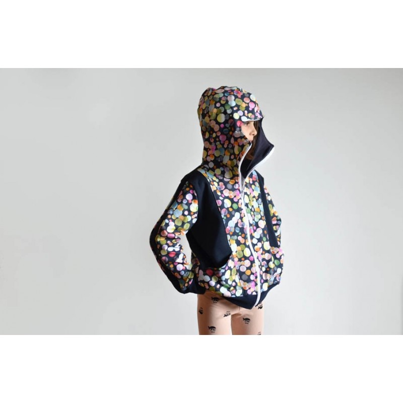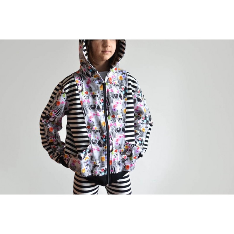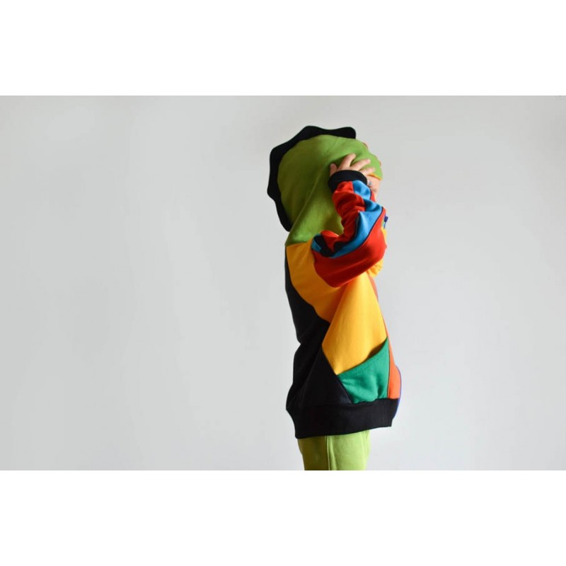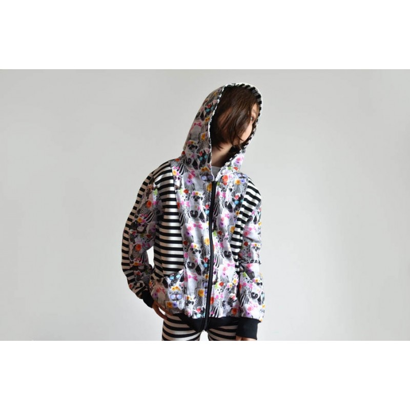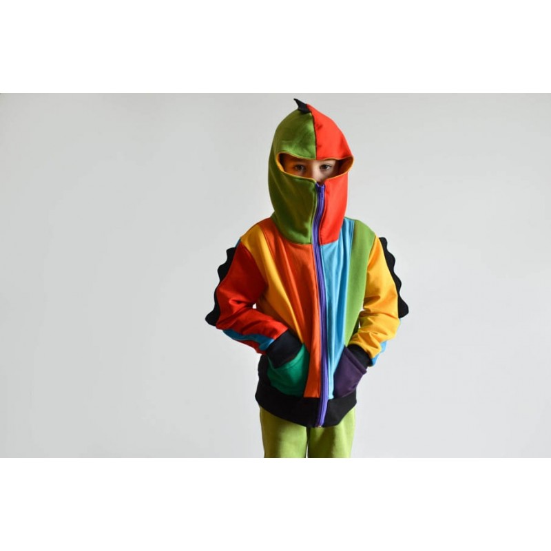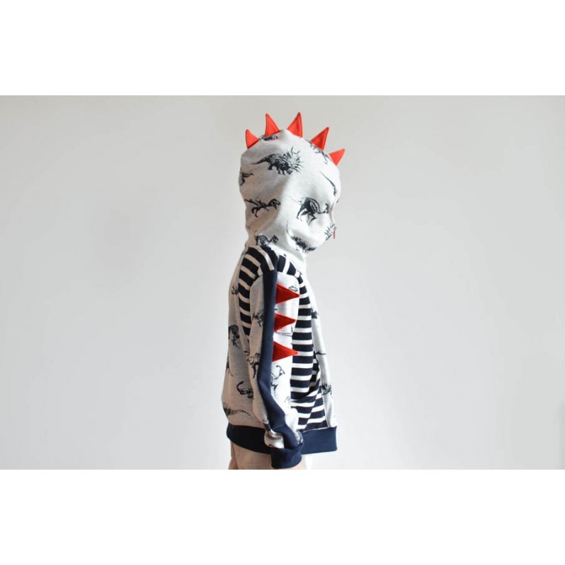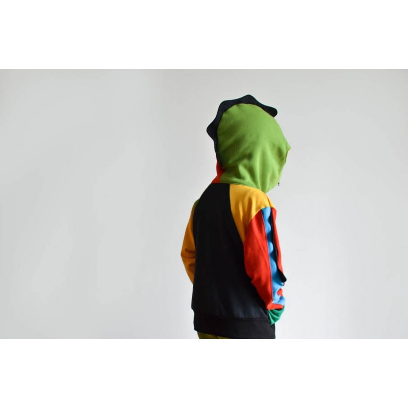 Patrón de sudadera infantil Alpha. Sudadera con capucha y bolsillos frontales. Sudadera divertida con patronaje peculiar. Capucha forrada de dos tipos: cerrada, tipo antifaz, o normal. Pareja perfecta de los Pantalones Alpha. Varias posiciones para coser. Dos versiones con cremallera y capucha antifaz: la versión A con detalles triangulares en la capucha y la versión B con detalles en ondas. Otras dos versiones con capucha normal: la versión C con cremallera y la versión D sin cremallera.