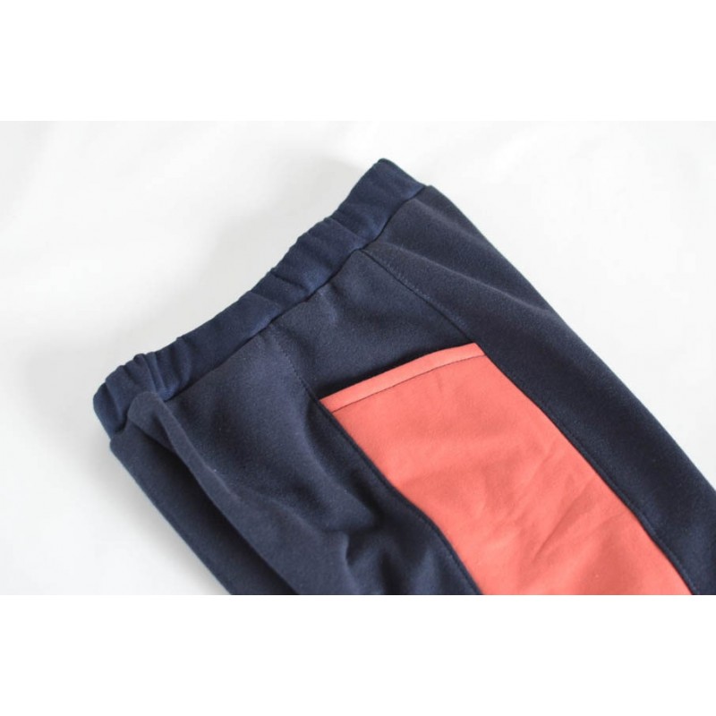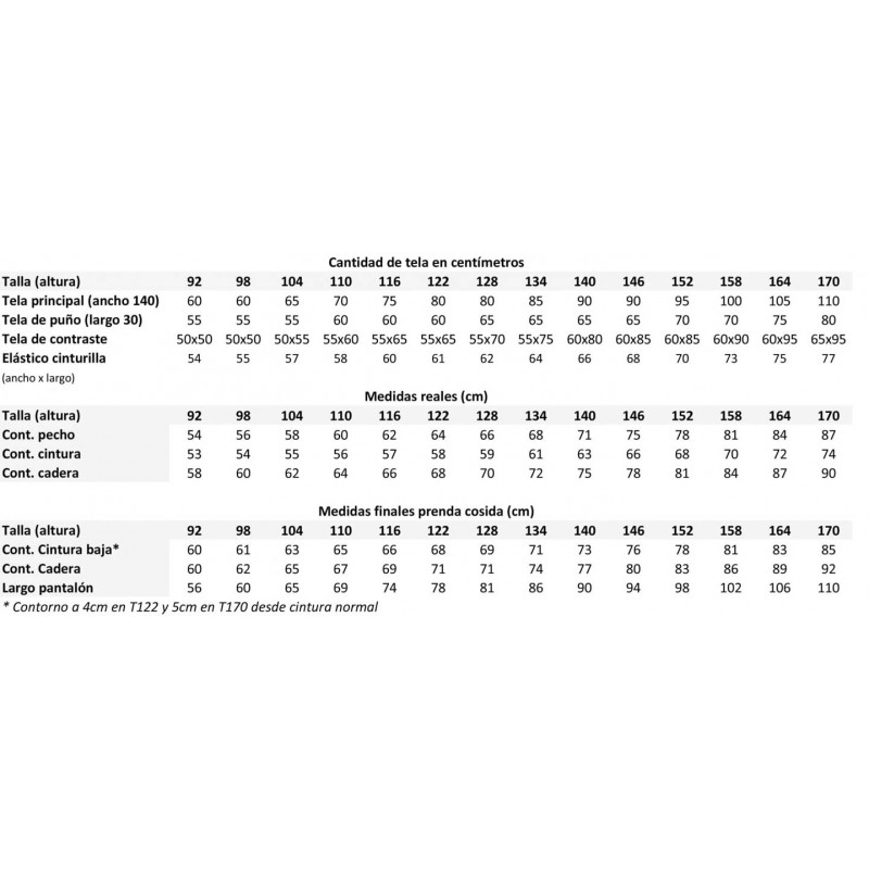 Para confeccionar este pantalón puedes usar de tela exterior y de contraste telas de sudadera con o sin elastan. Para la cinturilla un elástico de 2.5 a 3 cm de ancho, Tela de puño para la cinturilla y los bajos.