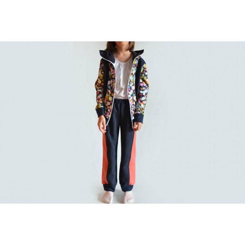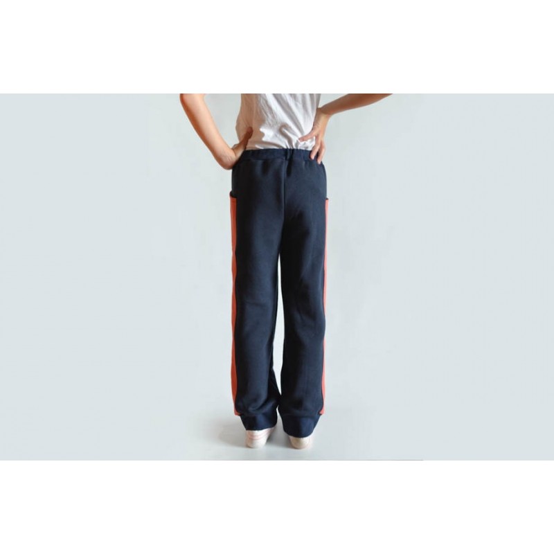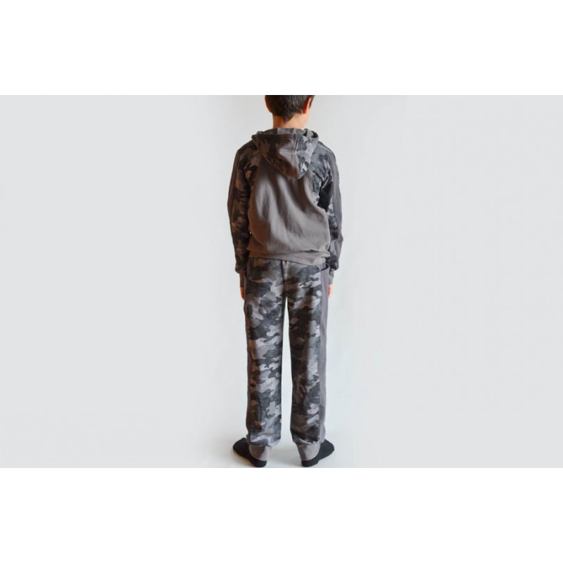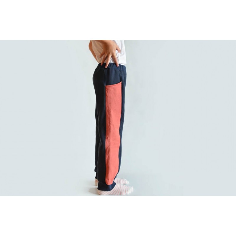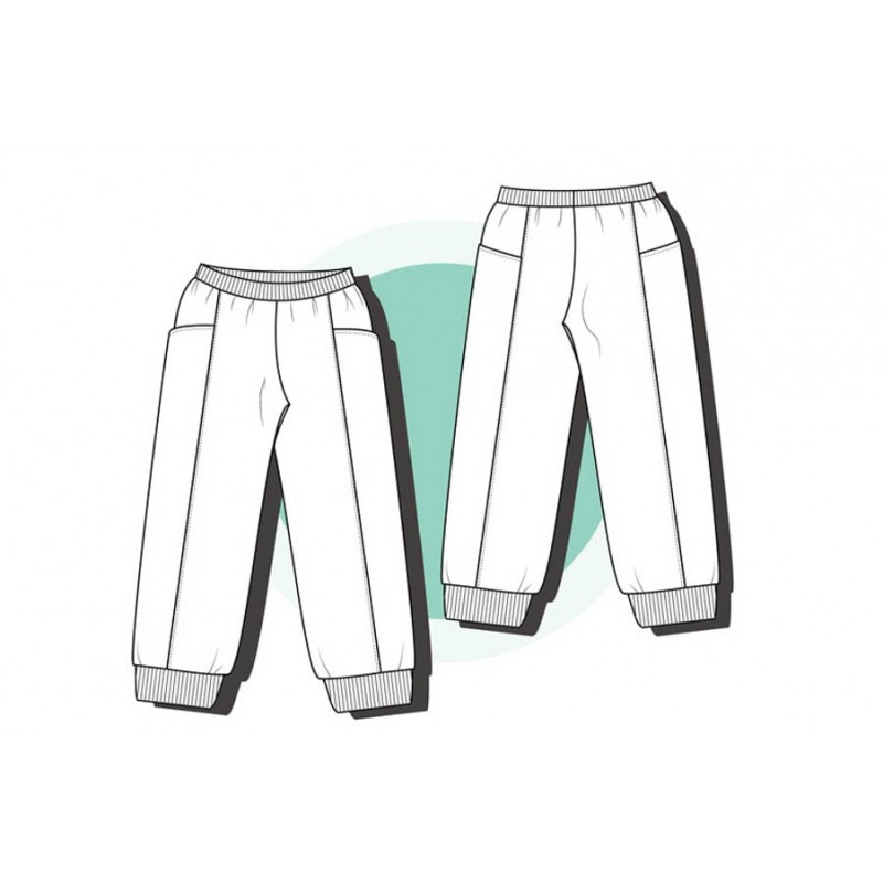Patrón de los pantalones infantiles Alpha. Pantalones con bolsillos laterales. Bajos y cinturilla con puños. Pareja de la Sudadera Alpha.