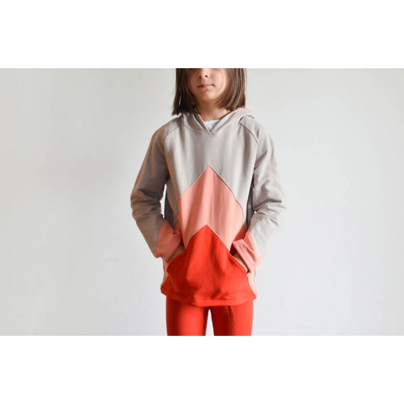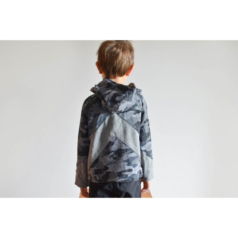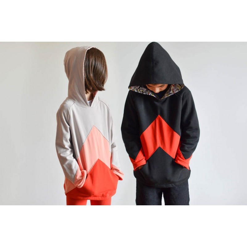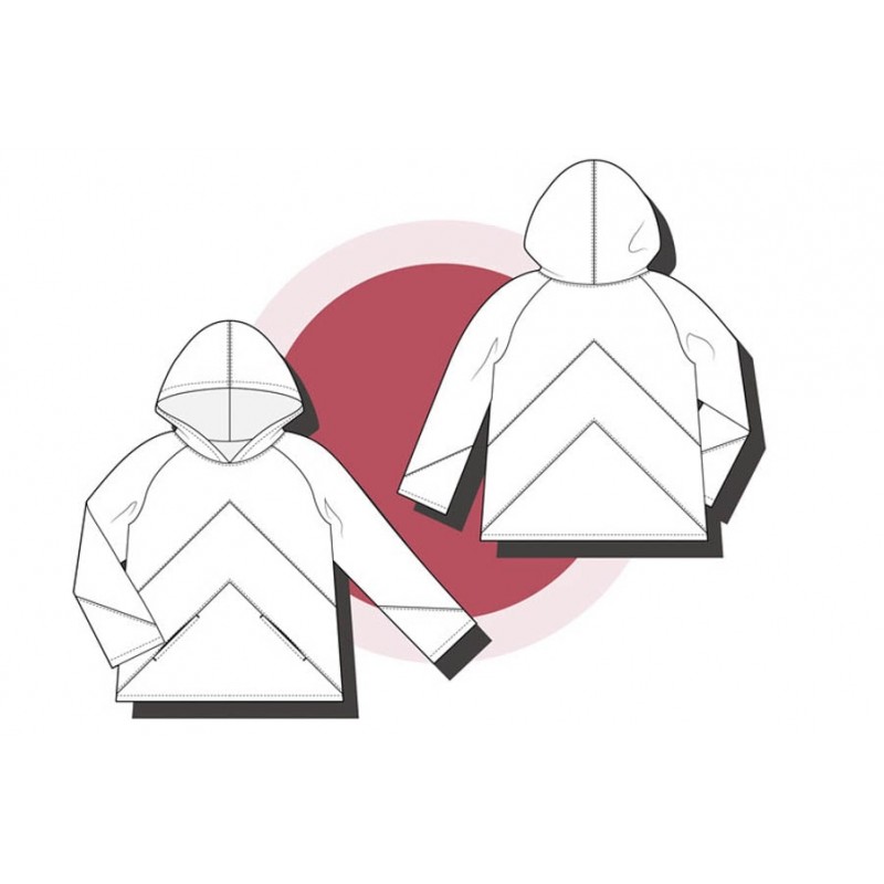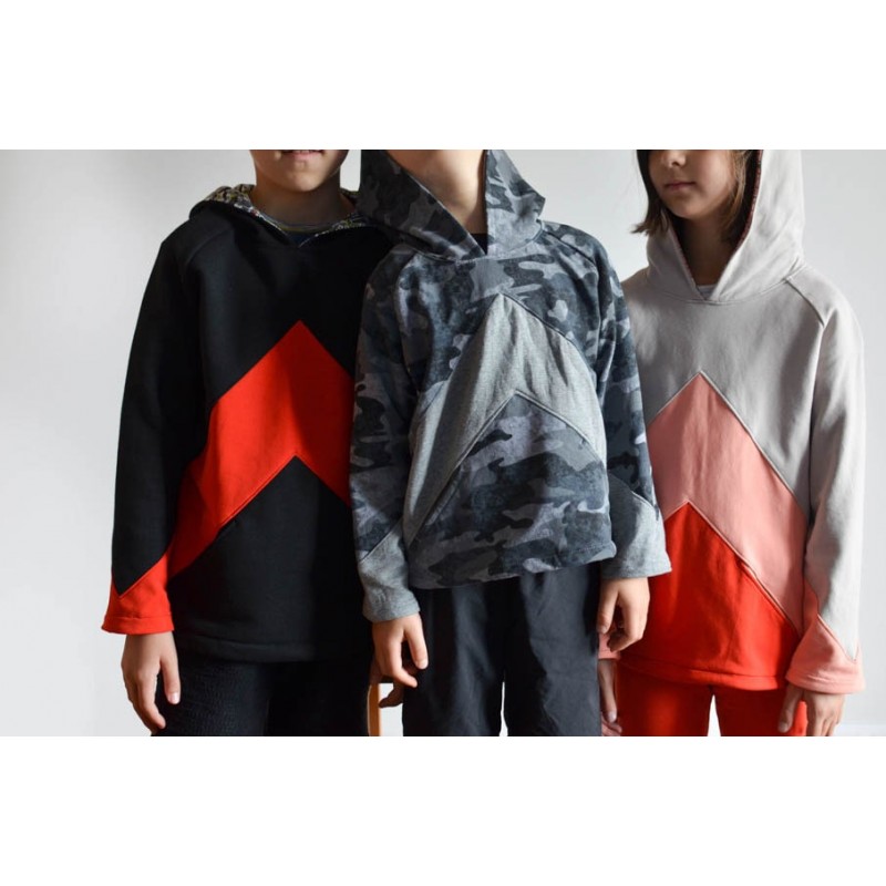 Patrón de la sudadera infantil Uvedoble. Sudadera con capucha y mangas raglán. Bolsillo frontal oculto tipo monje. Pareja perfecta de los Pantalones Uvedoble.