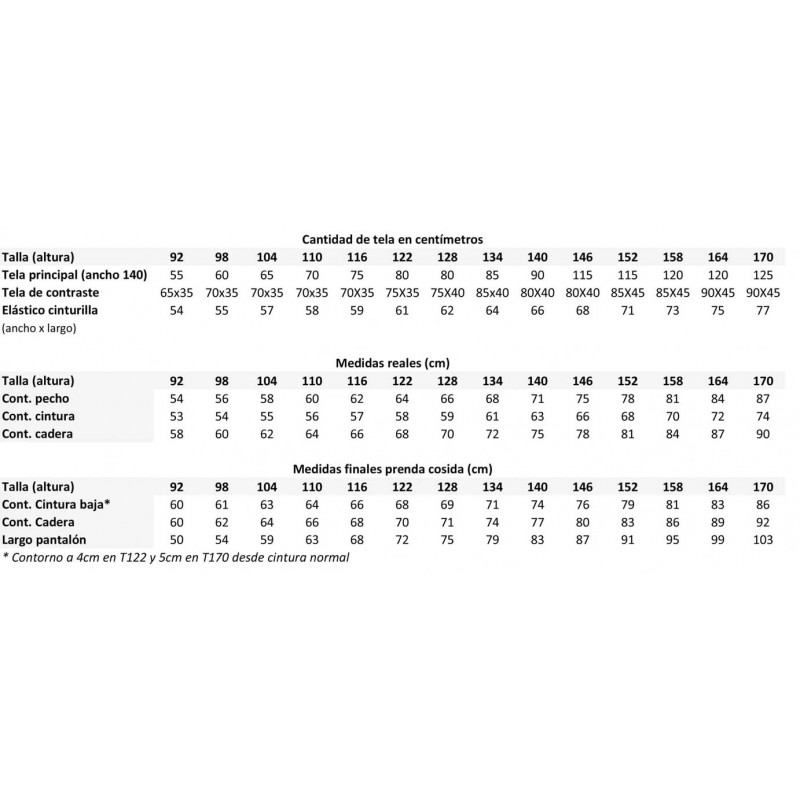 Para confeccionar este pantalón puedes usar de tela exterior y de contraste telas de sudadera con o sin elastan. Para la cinturilla un elástico de 2.5 a 3 cm de ancho.
