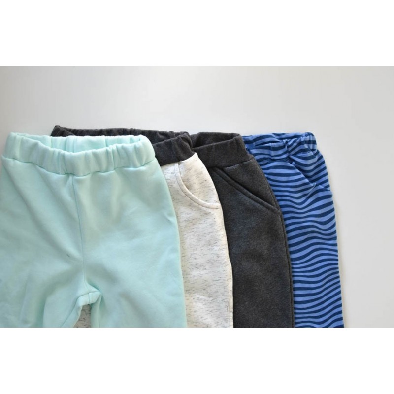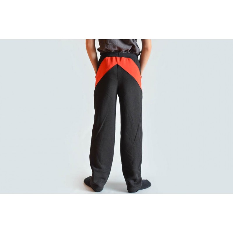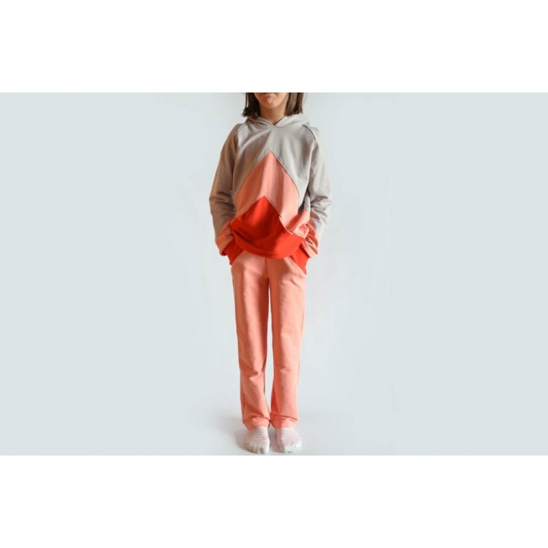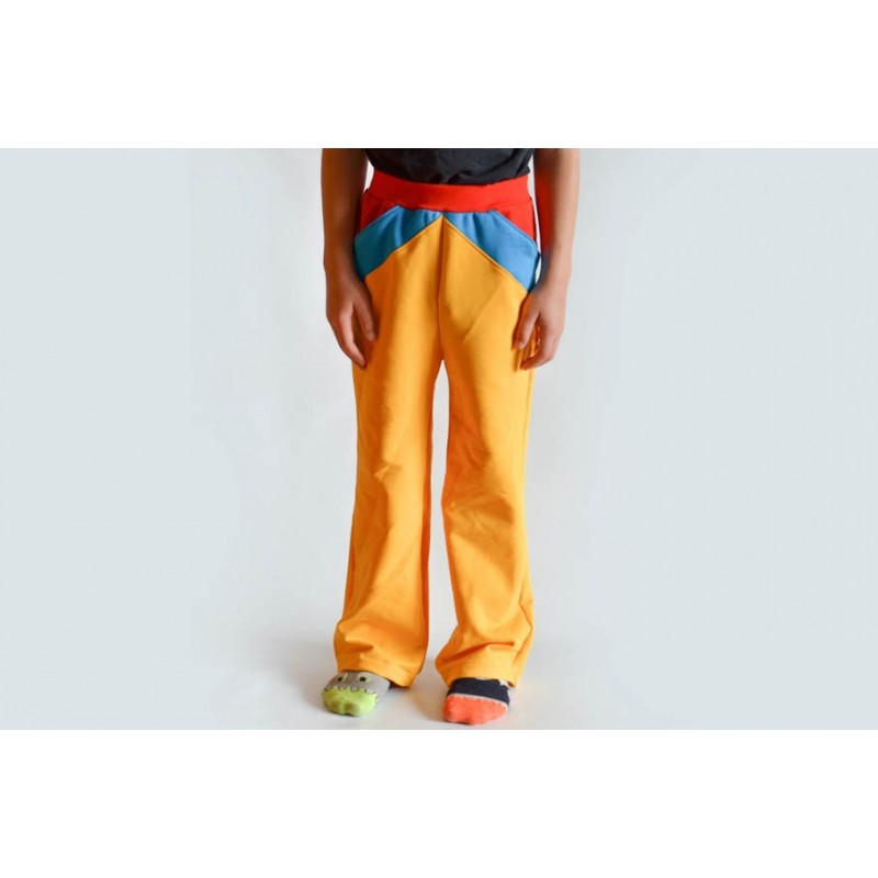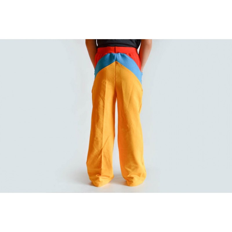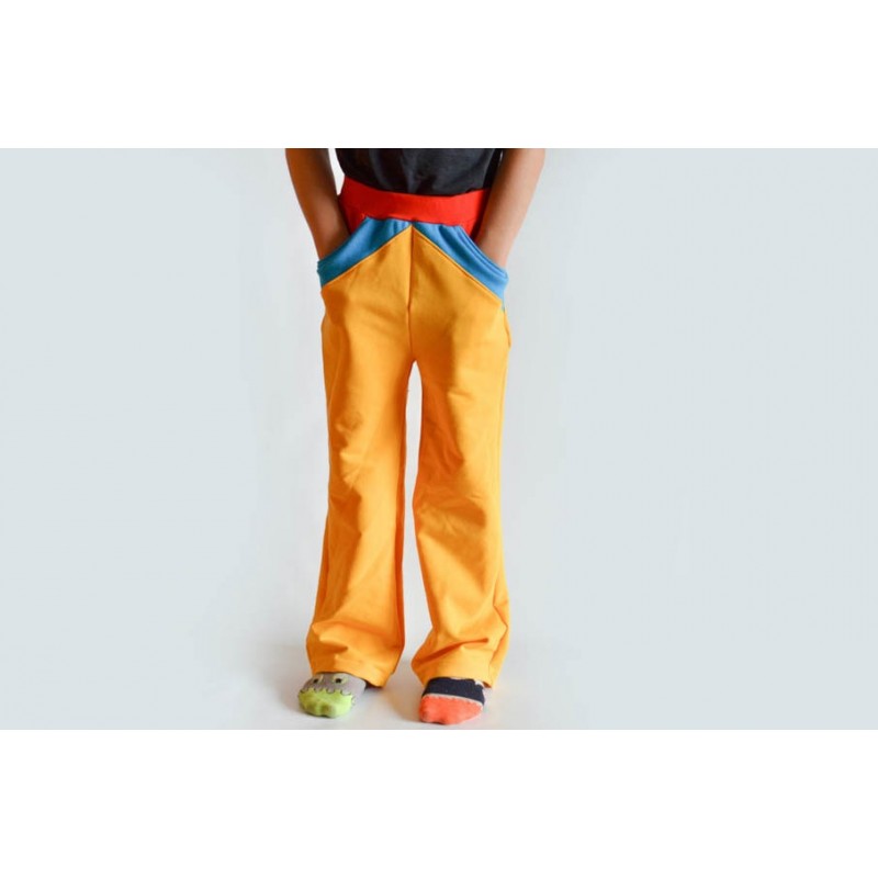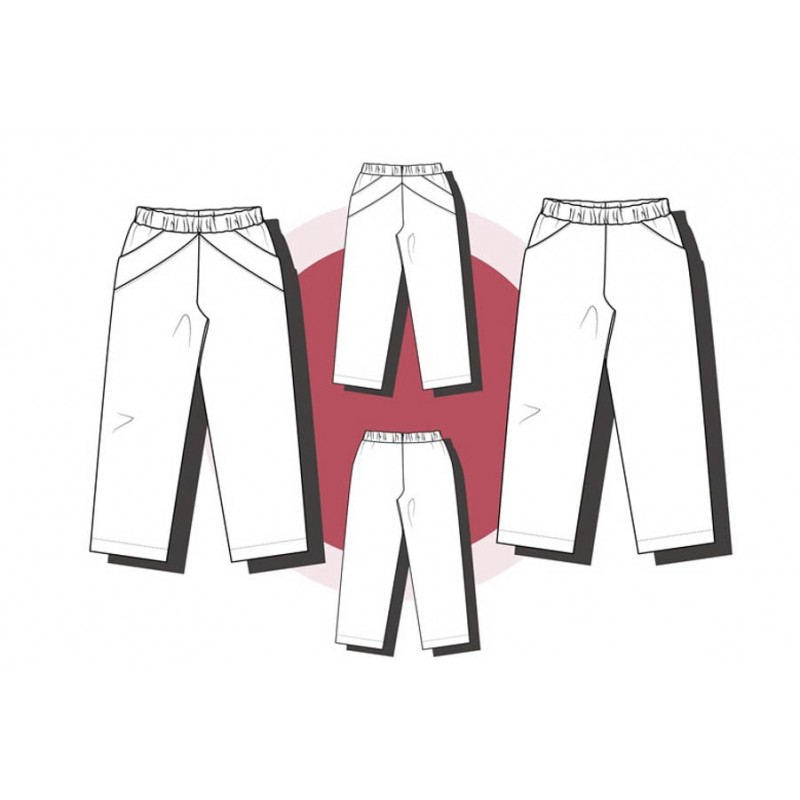 Patrón de pantalones infantiles Uvedoble. Perneras con corte recto, bolsillos diagonales en el delantero y bajo con dobladillo. Pareja de la Sudadera Uvedoble.