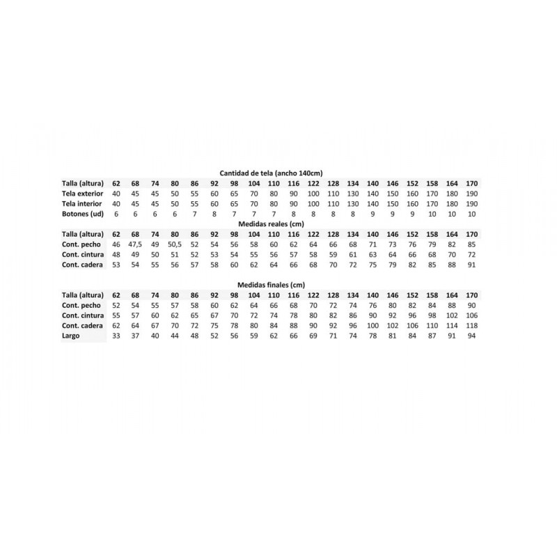 En tallas bebé desde 62 hasta 92 cm de altura e infantil desde 98 a 170 cm de altura.