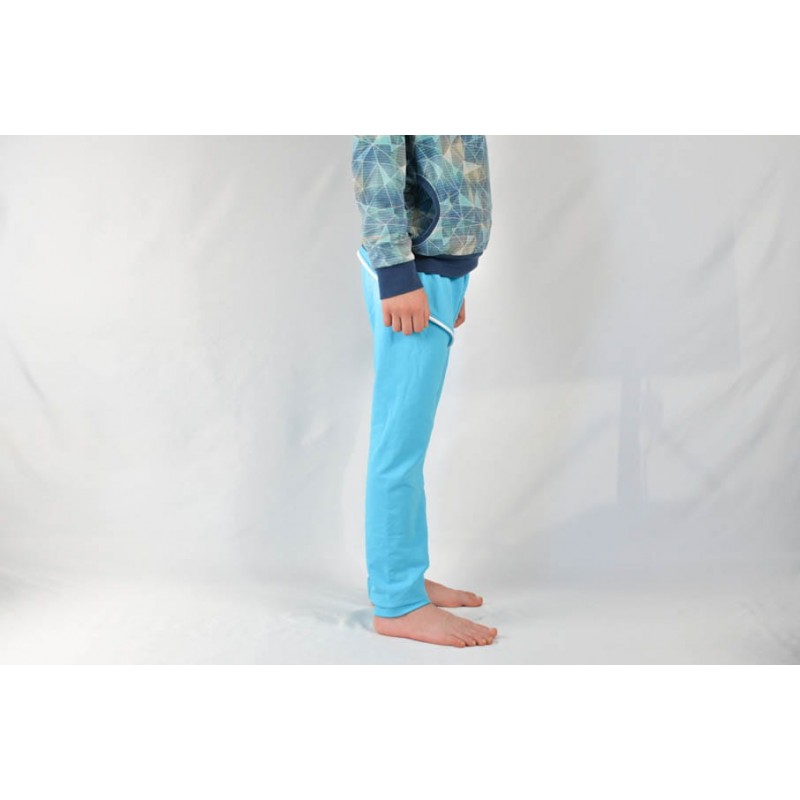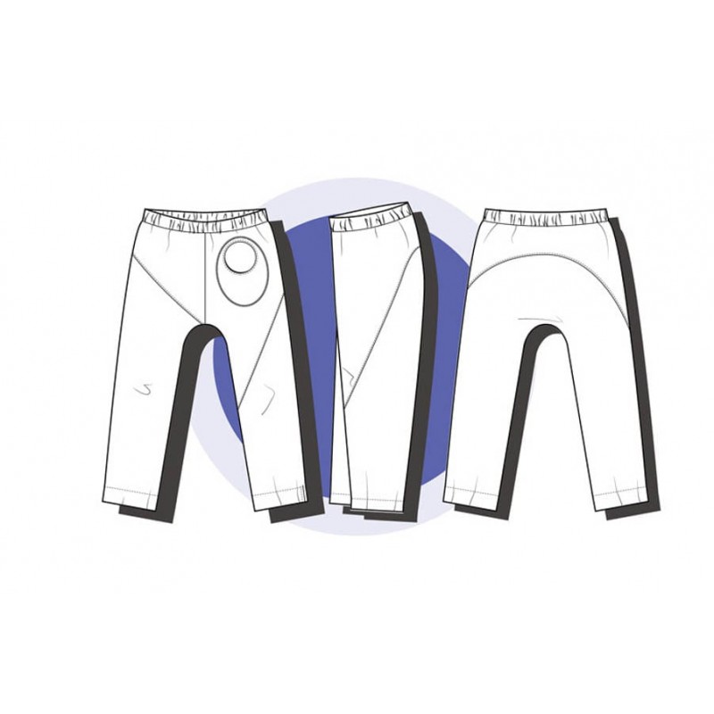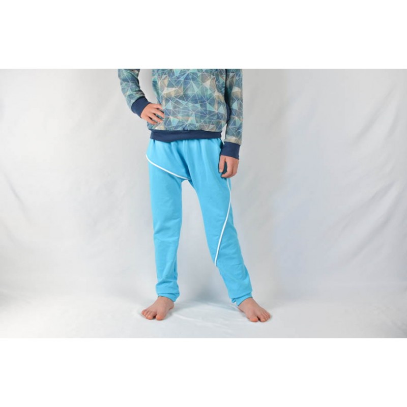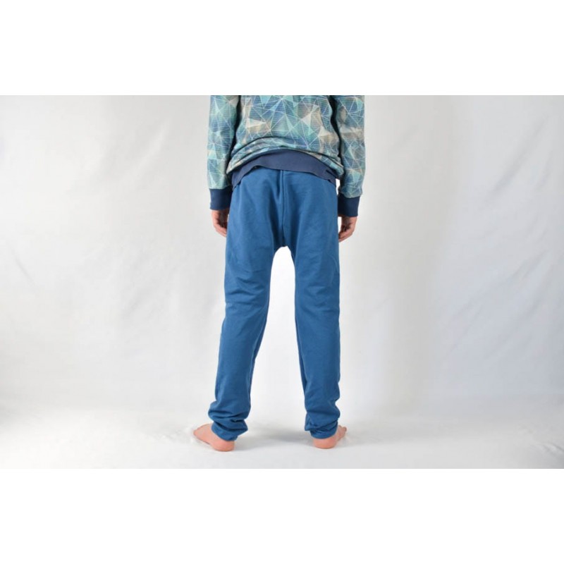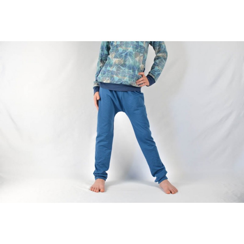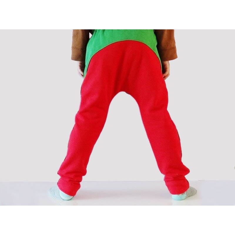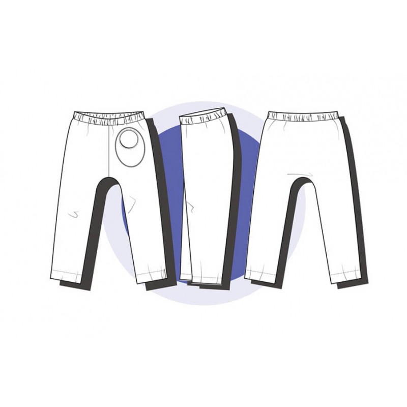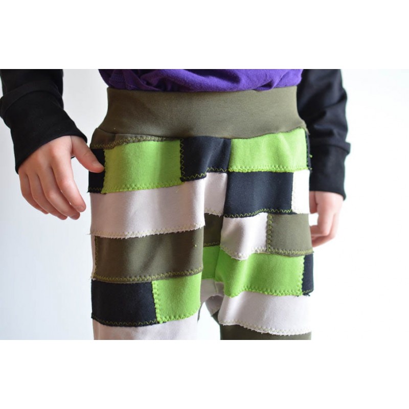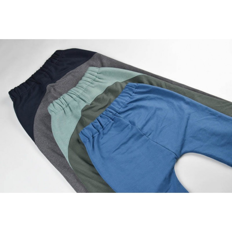 Patrón de pantalones 123 infantil. Pantalones tipo bombacho fáciles de coser y personalizar. Pernera ajustada con tres variantes para usar distintas telas, tiro redondeado y bolsillo frontal. Dobladillos en cinturilla y bajos.