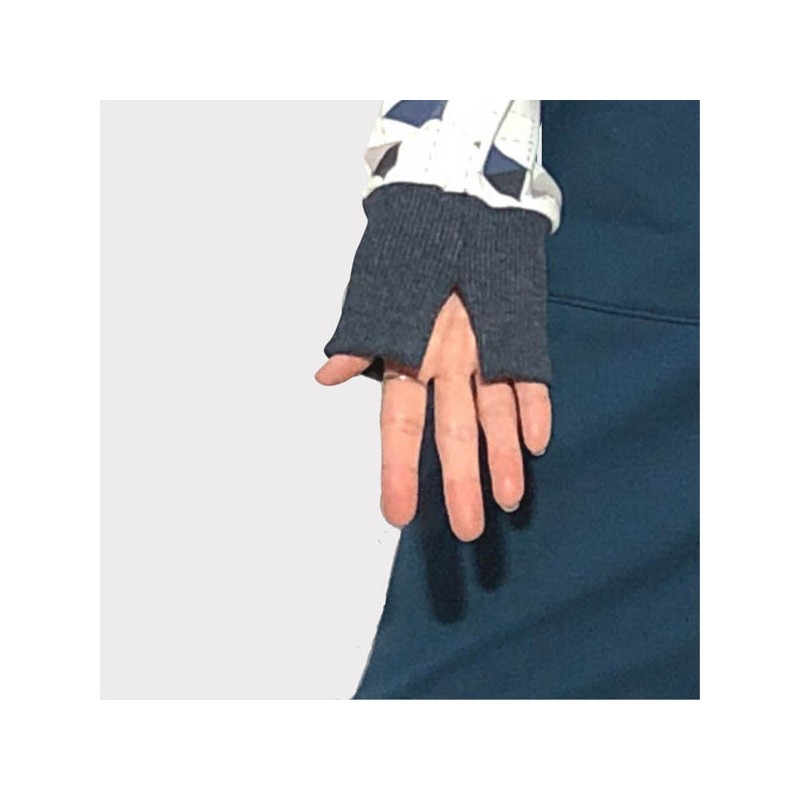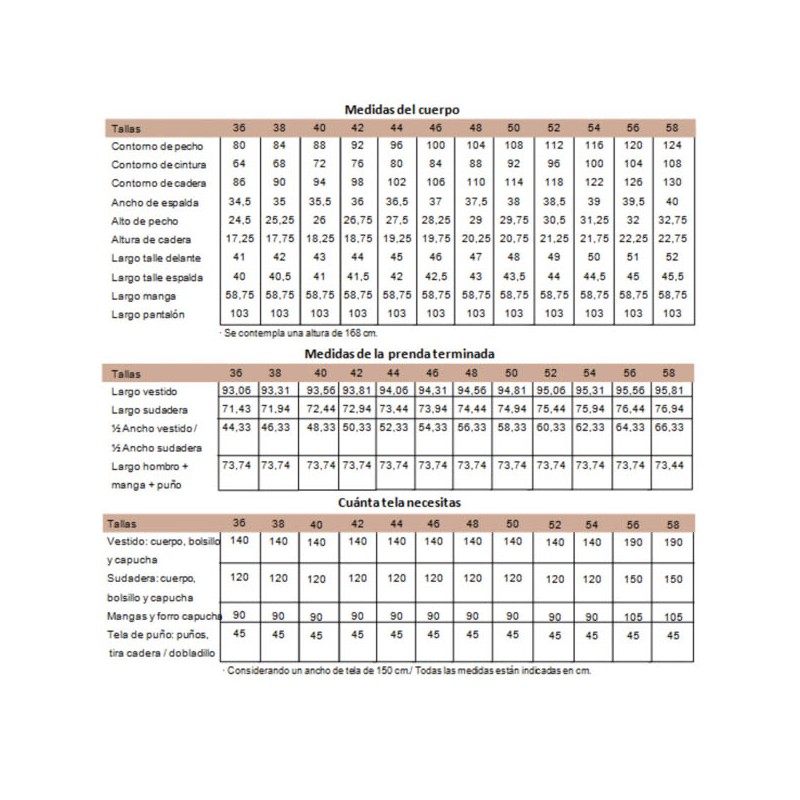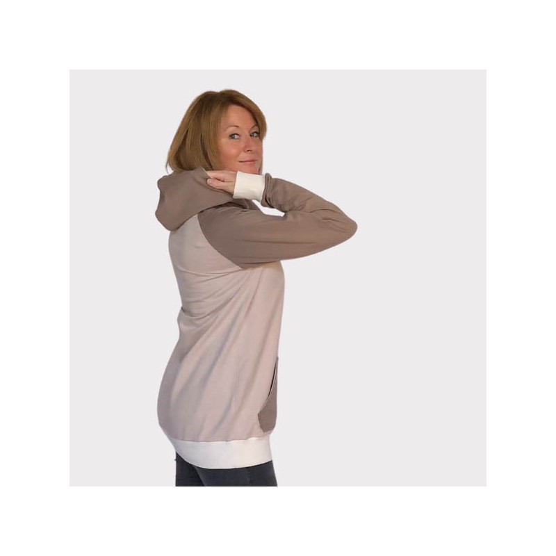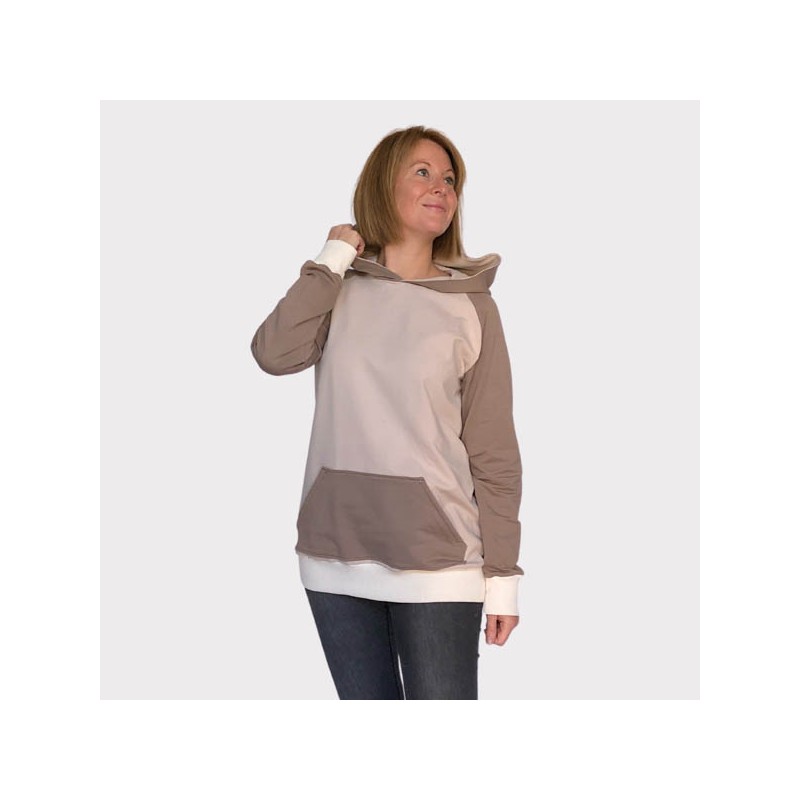 Para esta sudadera, puedes utilizar tela de sudadera, sweat o French Terry. Necesitarás tela de puño para los puños de las mangas y el bajo de la sudadera.