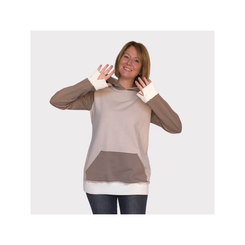 Este tipo de mangas es la preferida para la ropa deportiva por su comodidad. La sudadera / vestido también lleva bolsillo canguro, y abertura en el puño para mayor libertad de movimiento. Es ideal para combinar colores y estampados.
