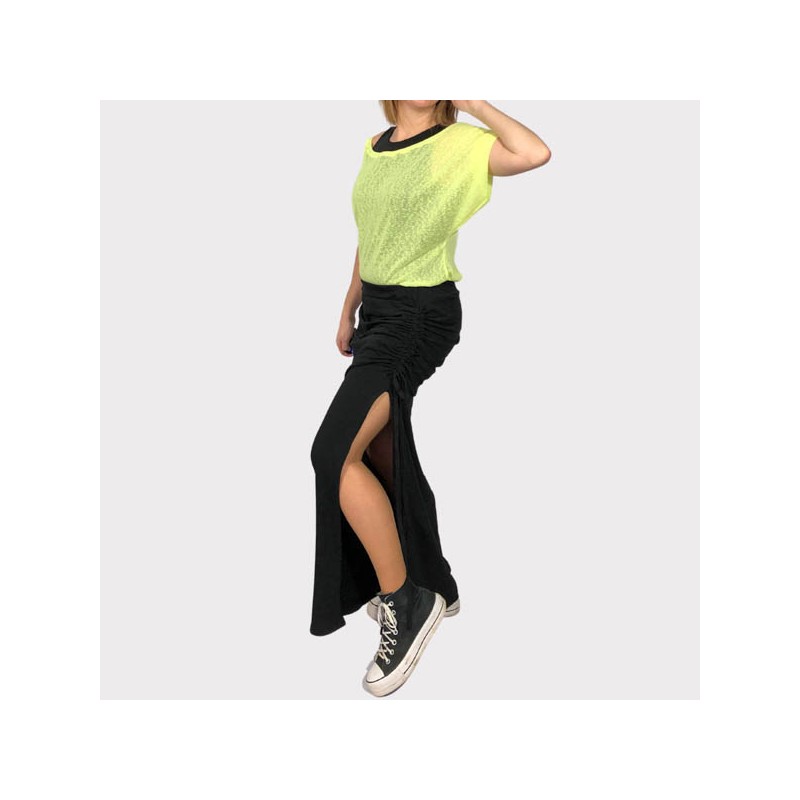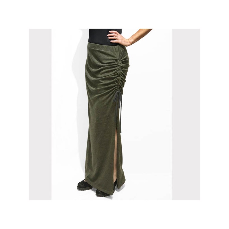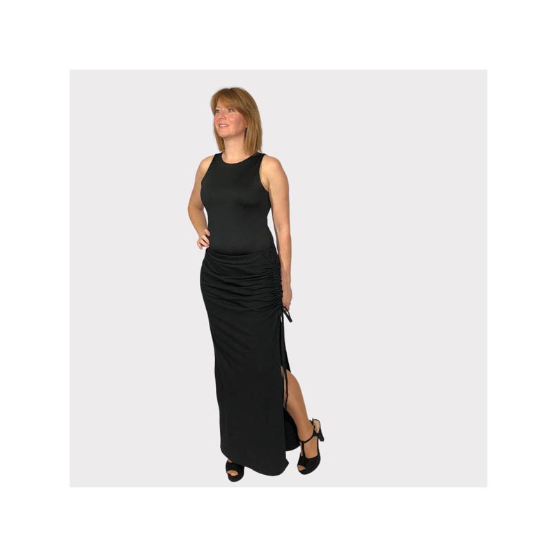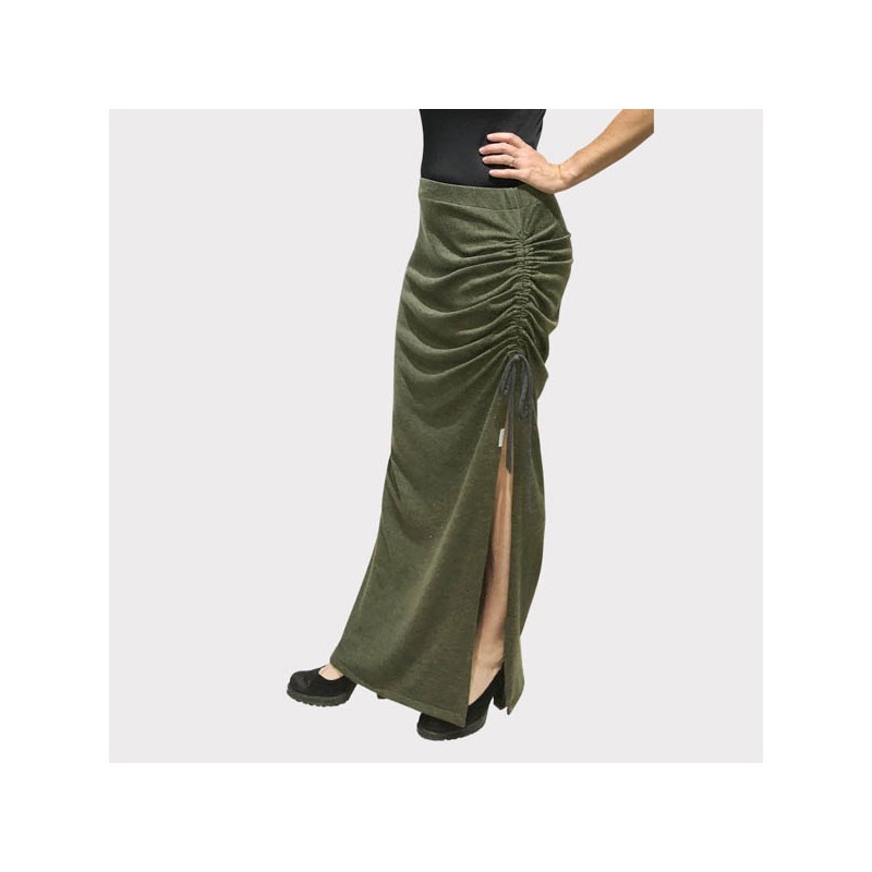 Patrón para coser una falda larga con un bonito fruncido en un costado y abertura lateral.