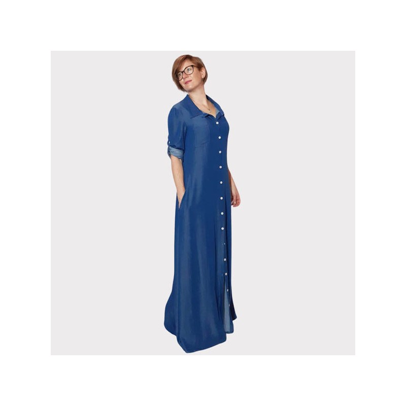 Estilo camisero, comodísimo, con bolsillos laterales escondidos, bolsillos en el pecho, mangas 3/4, con un tira en el interior para subirlas, frunces en las copas de la mangas, cuello camisero y canesú. Personaliza detalles como el tipo de tela, botones, cuello, corto o largo. Este patrón es tu lienzo en blanco. ¡Crea una prenda que sea verdaderamente tuya! Una costura avanzada, con un resultado espectacular.