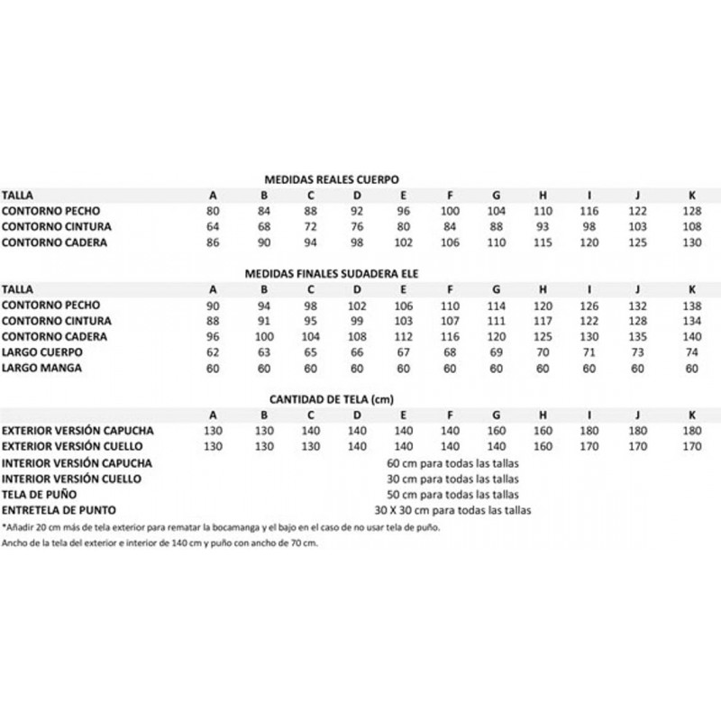 Para confeccionar esta sudadera puedes utilizar telas de sudadera, french terry, punto, jersey o similares para el exterior, interior capucha y fondo de bolsillo. Entretela para reforzar aberturas de bolsillo y hombro.