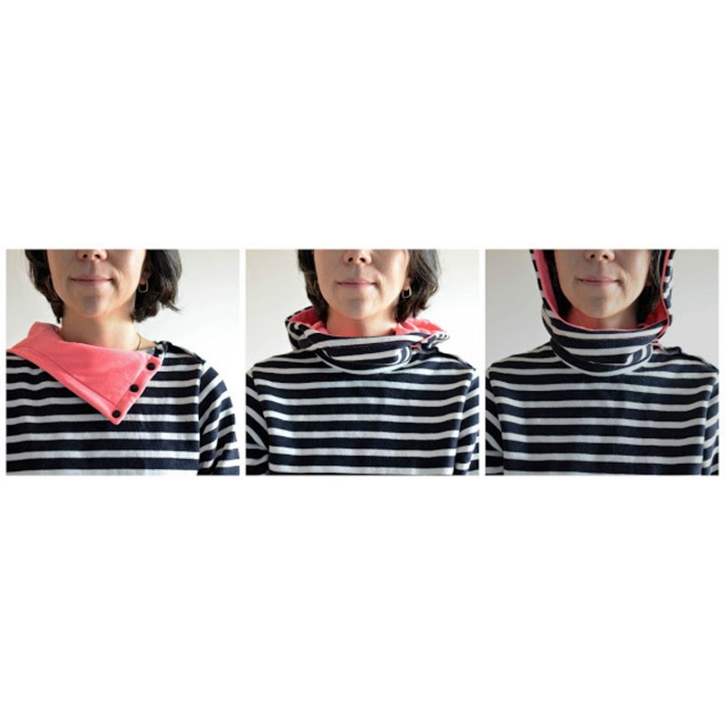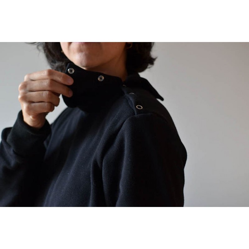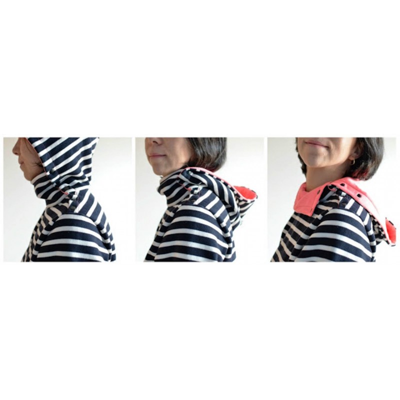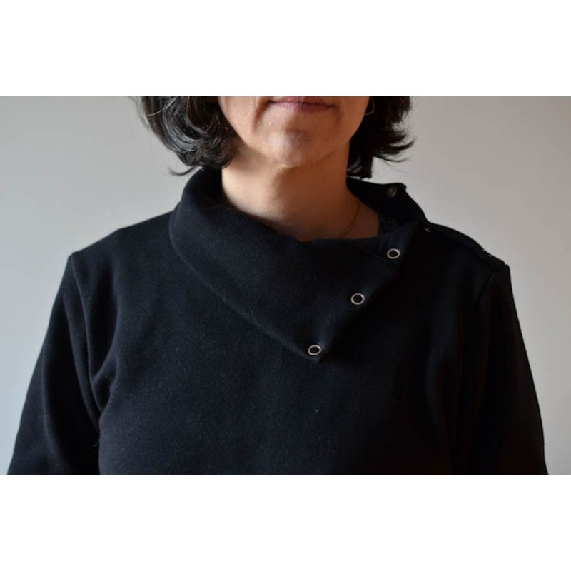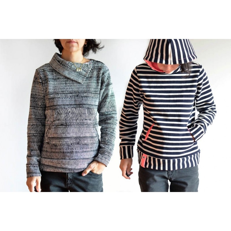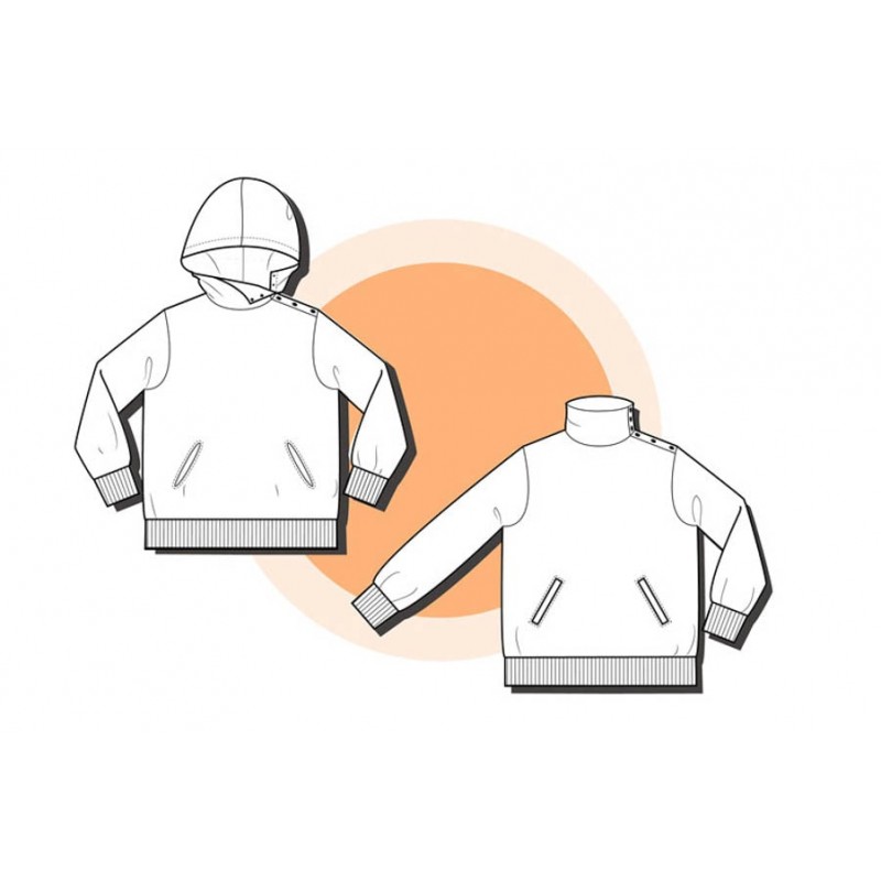 Patrón de sudadera adulto Ele. Sudadera holgada con uno de los hombros abierto con snaps o broches. Versión con cuello tortuga o capucha. Lleva bolsillo tipo monje en el delantero con abertura tipo solapa o abierta.