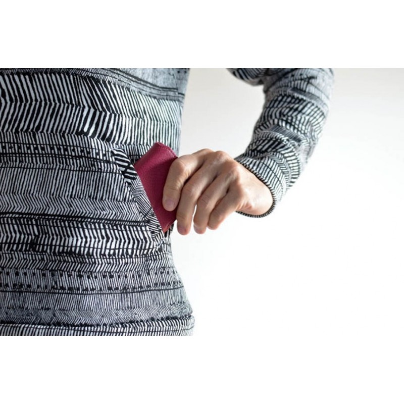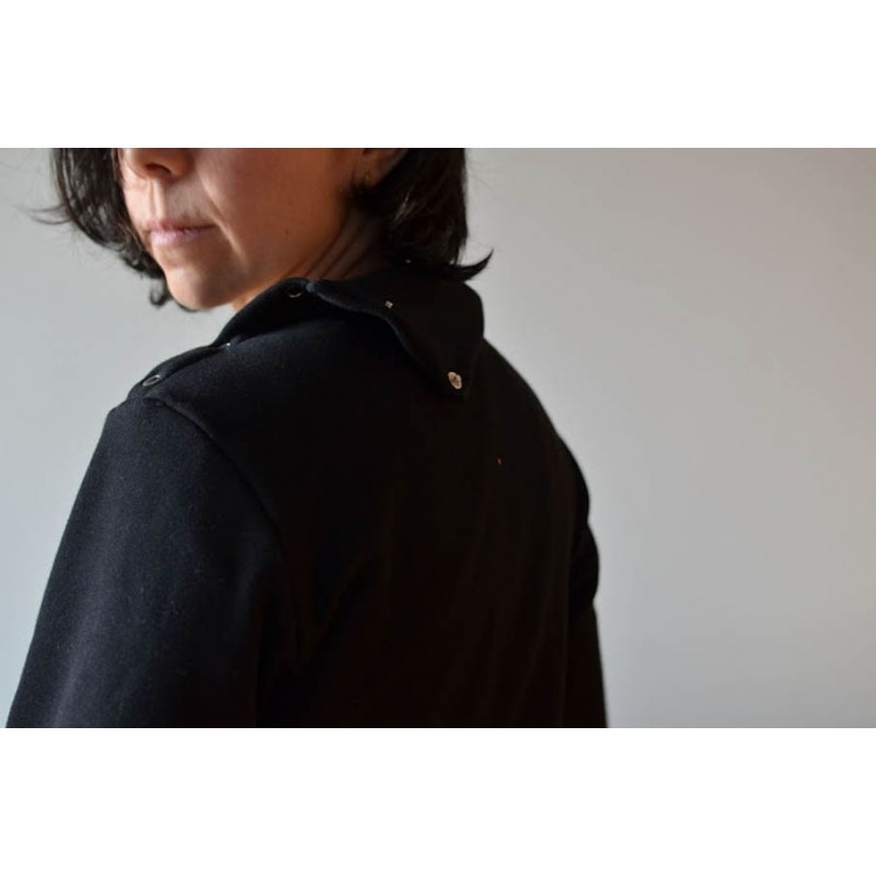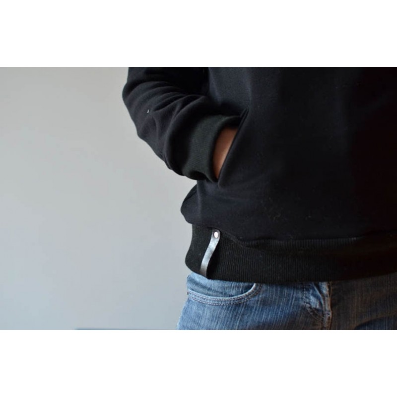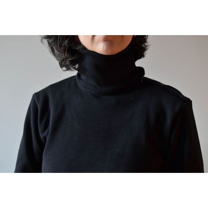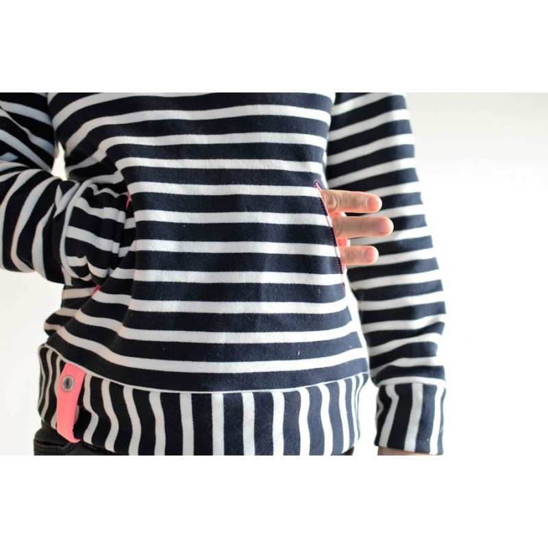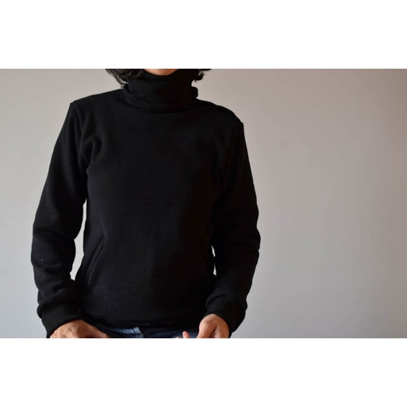 Patrón de sudadera adulto Ele. Sudadera holgada con uno de los hombros abierto con snaps o broches. Versión con cuello tortuga o capucha. Lleva bolsillo tipo monje en el delantero con abertura tipo solapa o abierta.