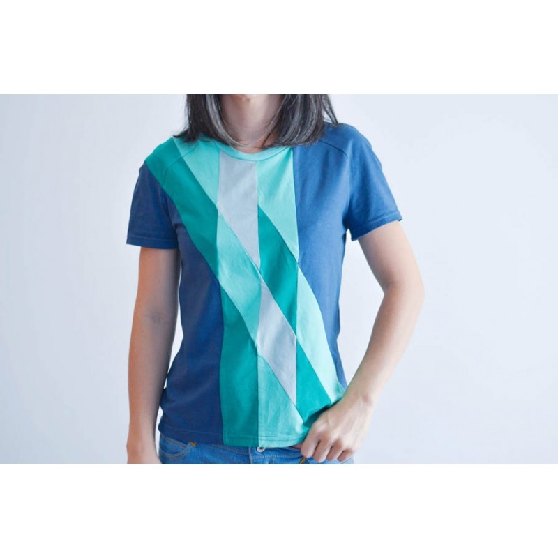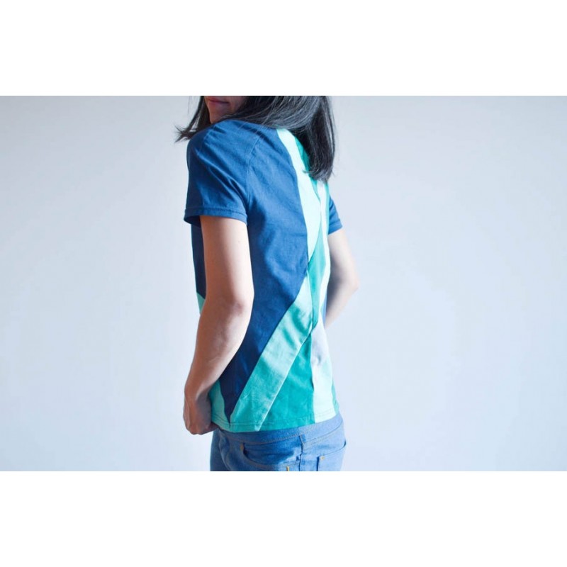 El patrón que recibes incluye el delantero, la espalda y las mangas en una pieza entera (la camiseta multicolor azul fue hecha dividiendo esas piezas y no están representadas en el patrón).