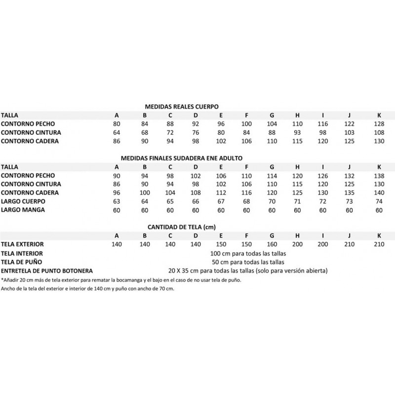 Las tallas incluidas en el patrón van desde el contorno de pecho 80 a 128 cm. Este patrón fue elaborado sobre un patrón base con características de cuerpos del sexo femenino y copa de pecho B.