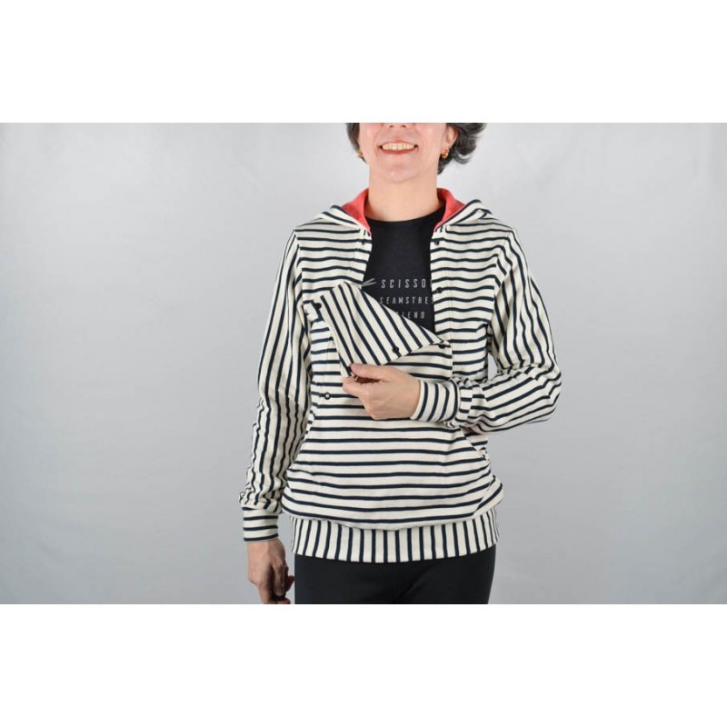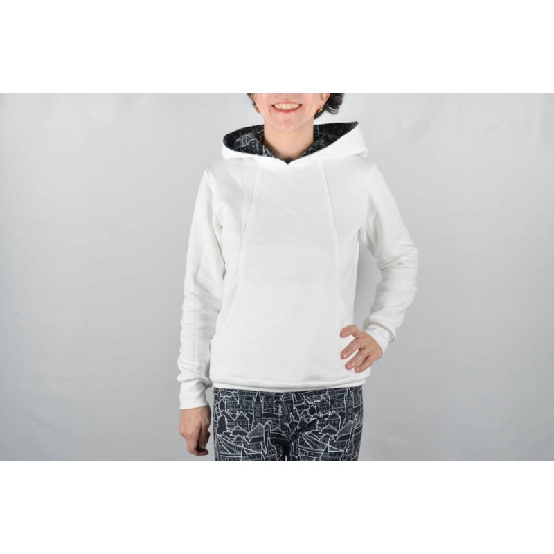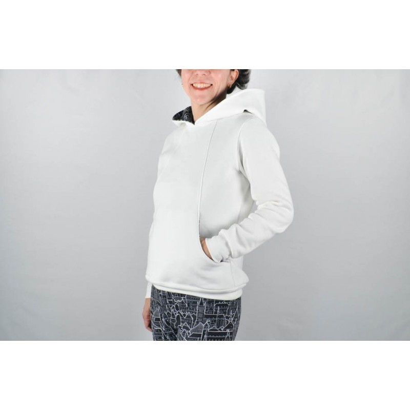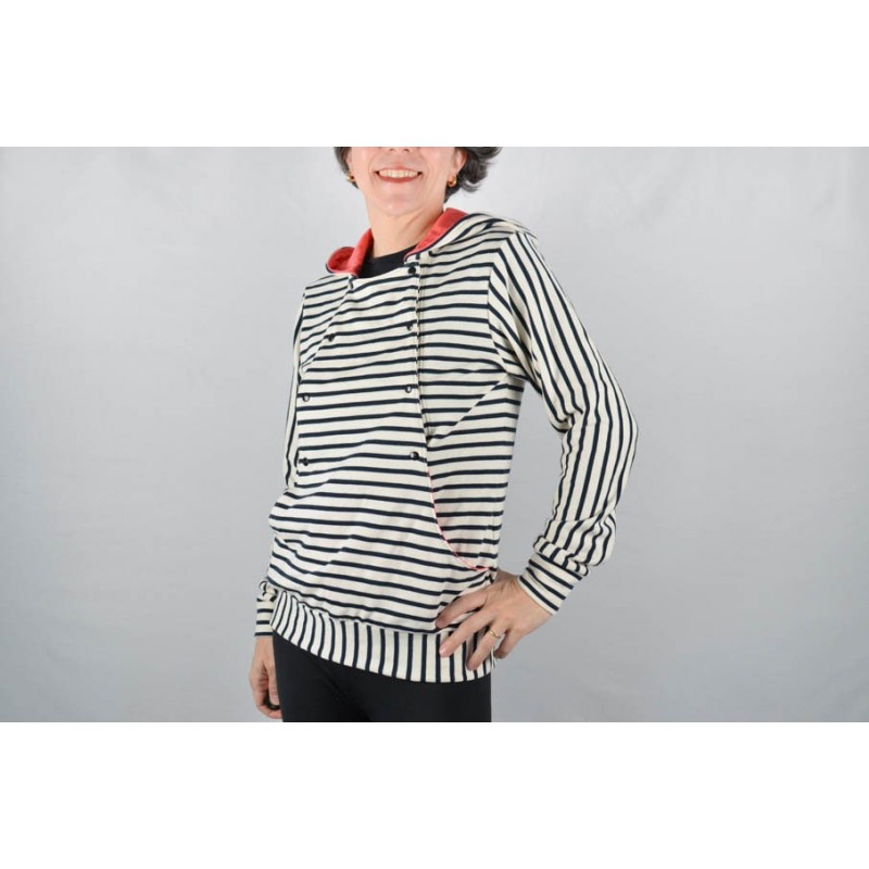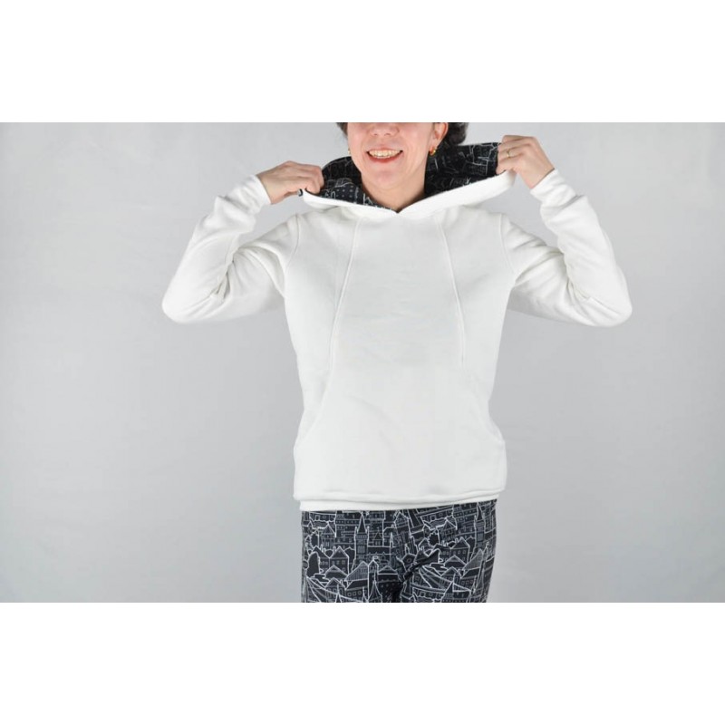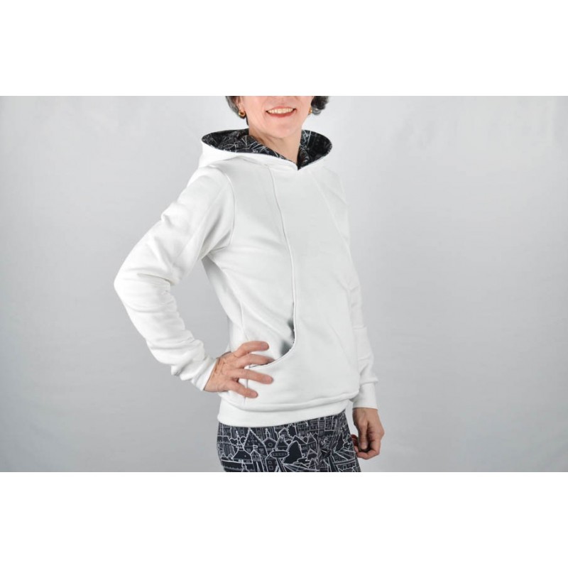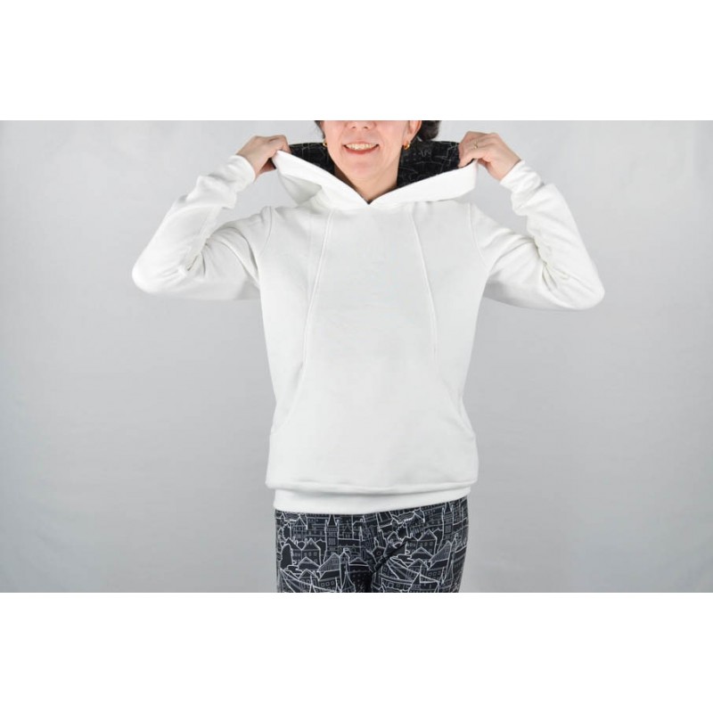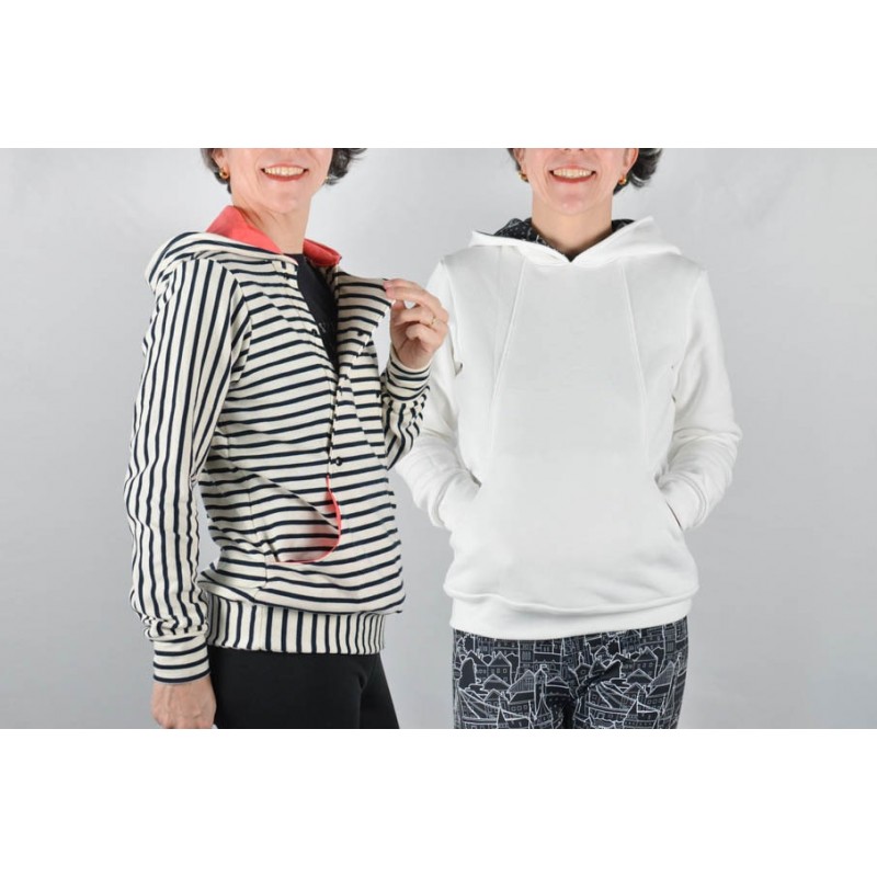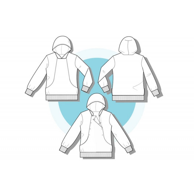 Patrón de sudadera de adulto Ene. Sudadera con capucha y bolsillo tipo monje. Opción cerrada o abierta con snaps hasta el pecho (ideal para lactancia).