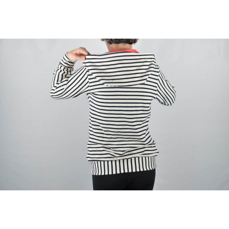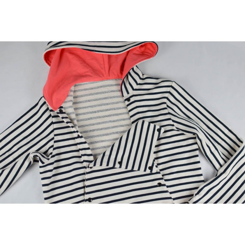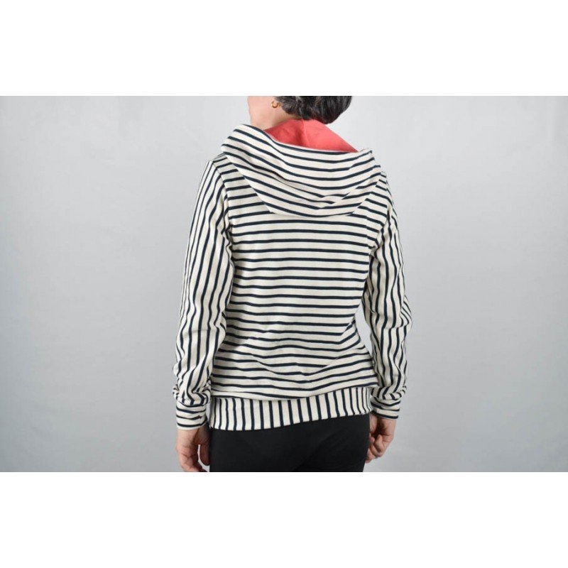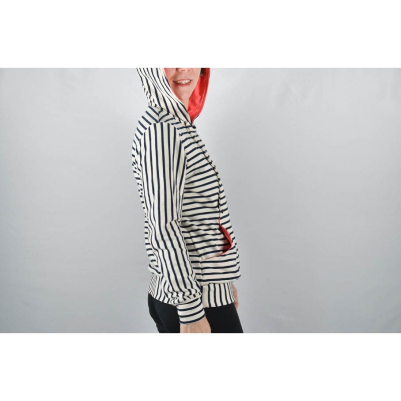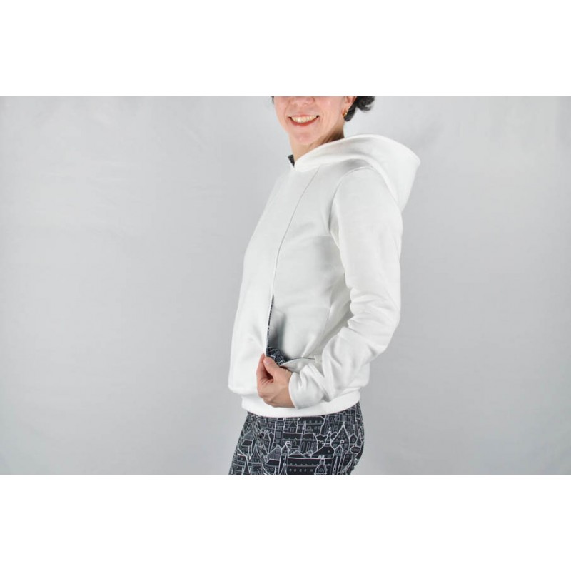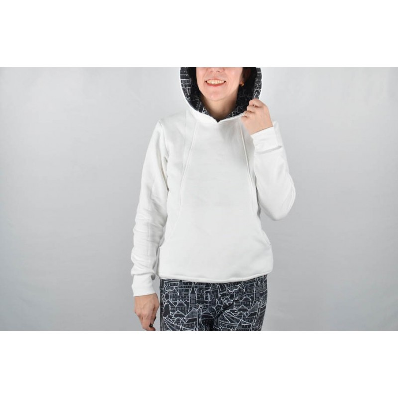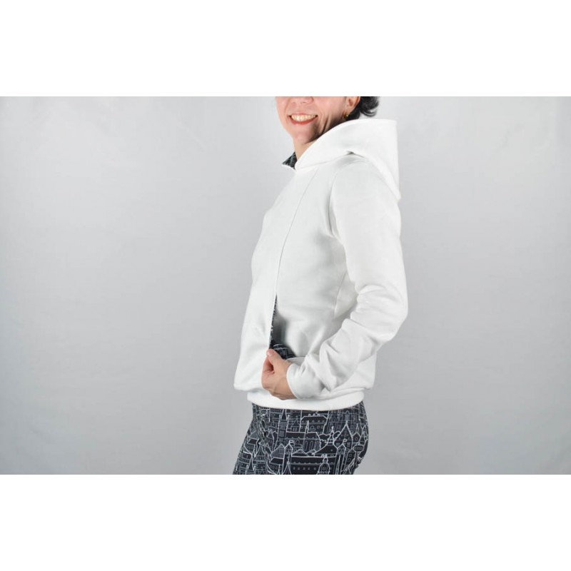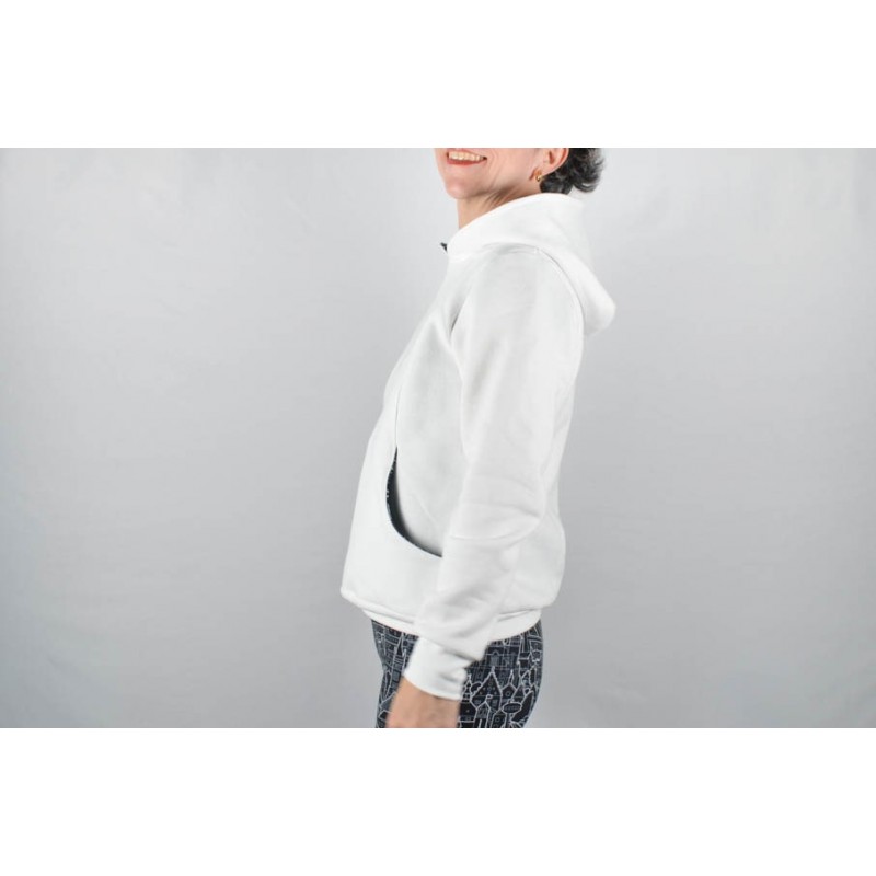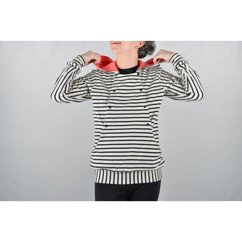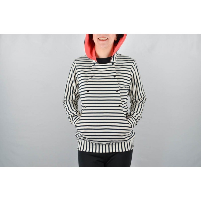 Patrón de sudadera de adulto Ene. Sudadera con capucha y bolsillo tipo monje. Opción cerrada o abierta con snaps hasta el pecho (ideal para lactancia).
