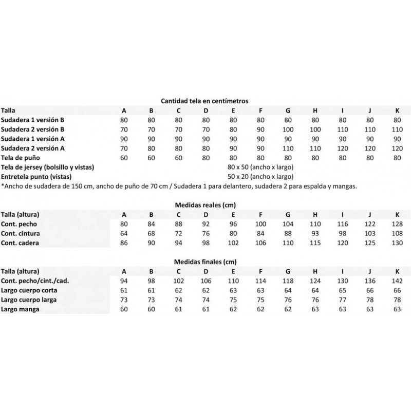 Para confeccionar esta sudadera puedes utilizar telas de sudadera, jersey para vistas y bolsillos, puño y entretela de punto.