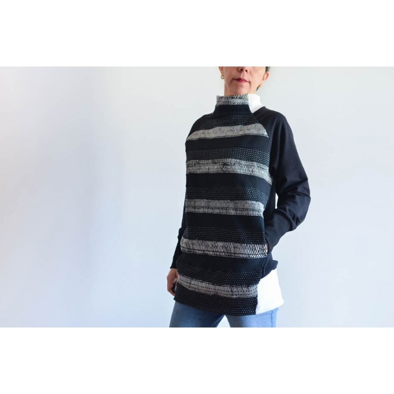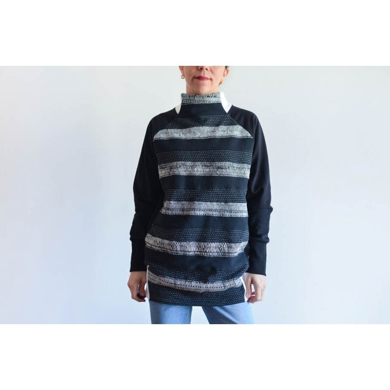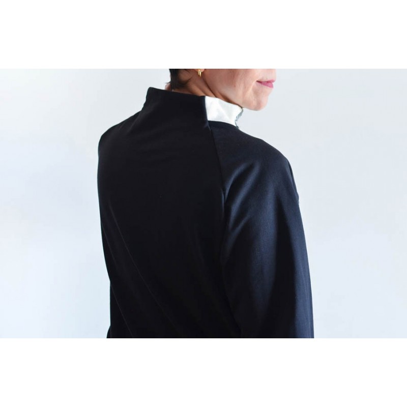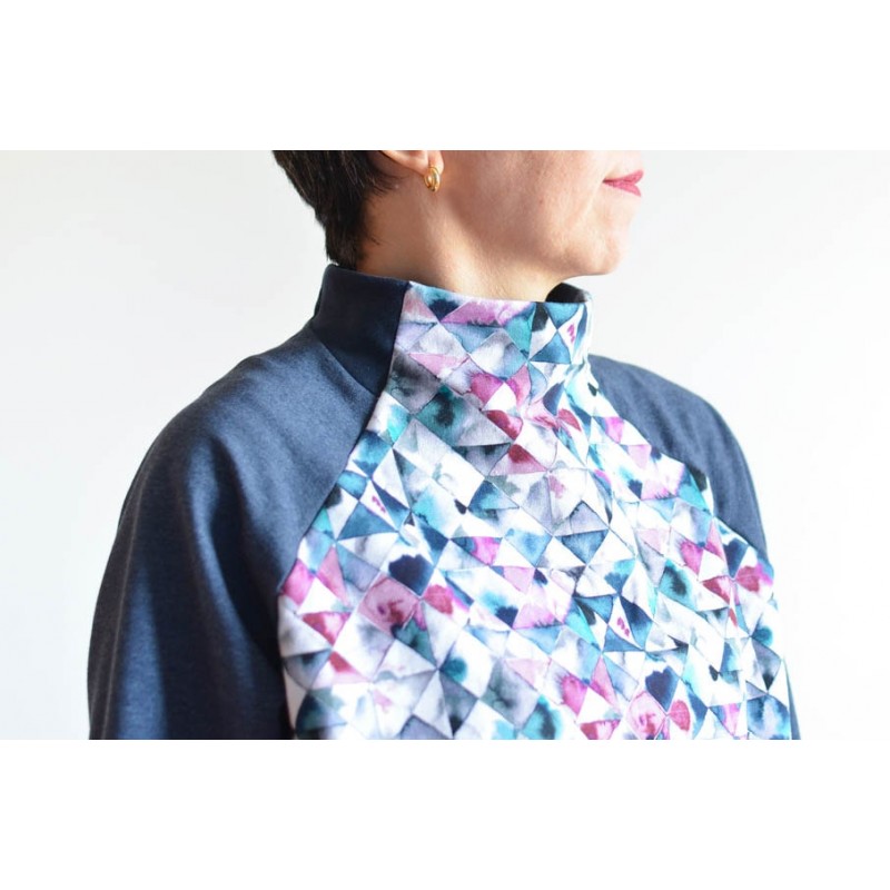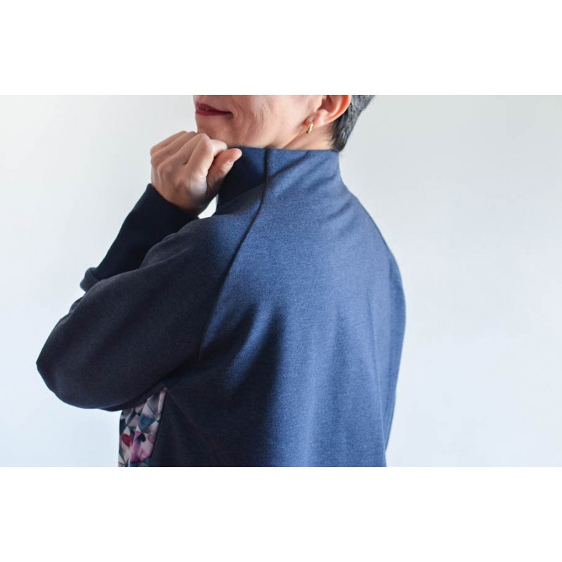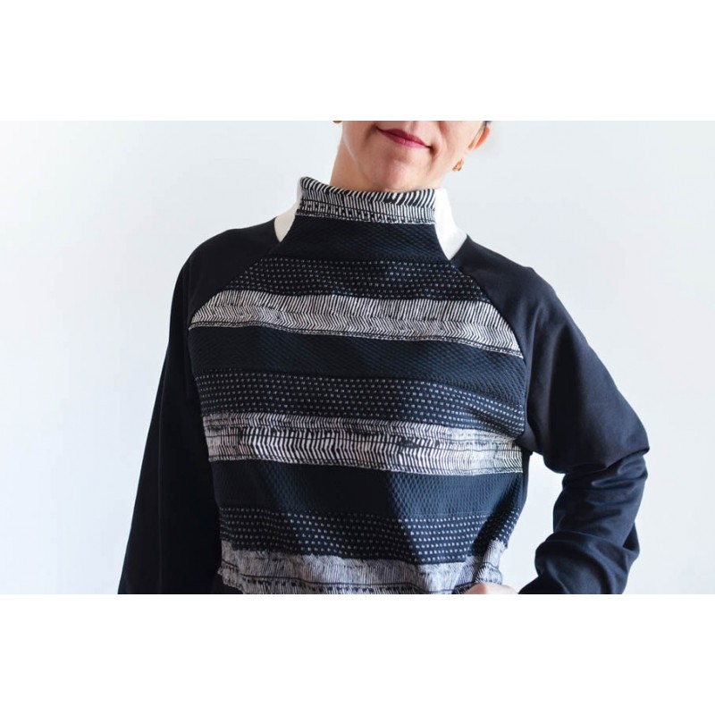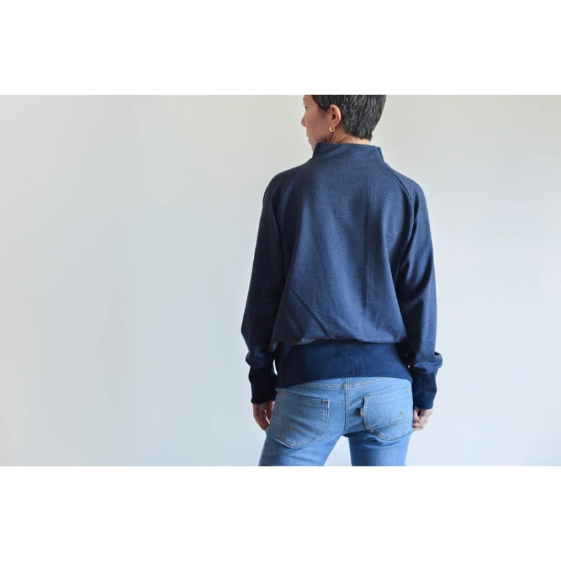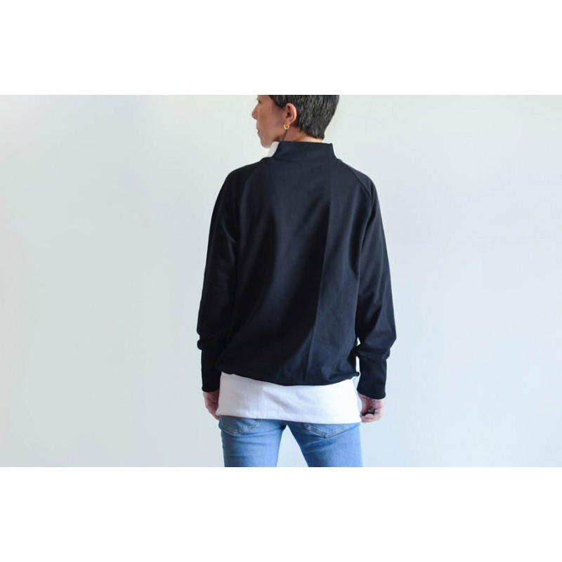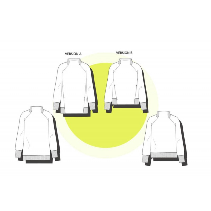 Patrón de la sudadera Vega. Sudadera básica de adulto, con cuello alto, bolsillos y manga raglán. Tiene dos opciones de largo. Está rematada con mezcla de puño y dobladillo en bajo. Bocamanga con puños anchos y detalle en contraste en cuello.