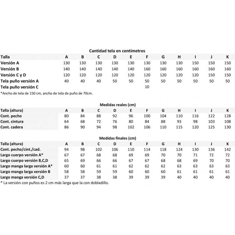 Las tallas incluidas en el patrón van desde el contorno de pecho 80 a 128 cm. Este patrón fue elaborado sobre un patrón base con características de cuerpos del sexo femenino y copa de pecho B.