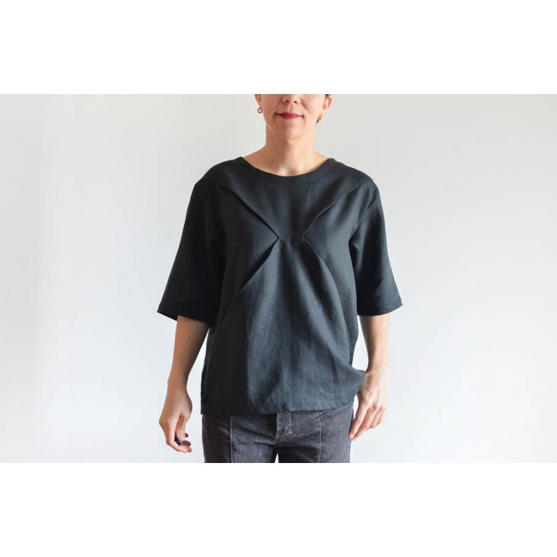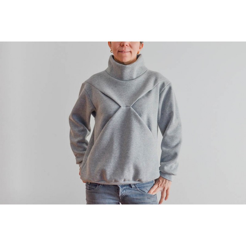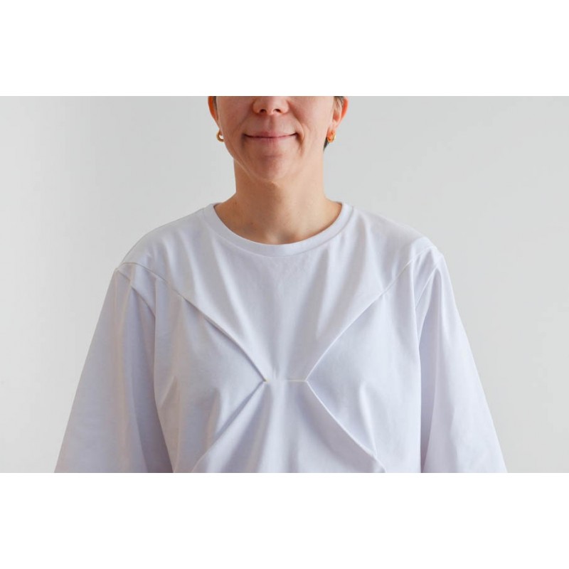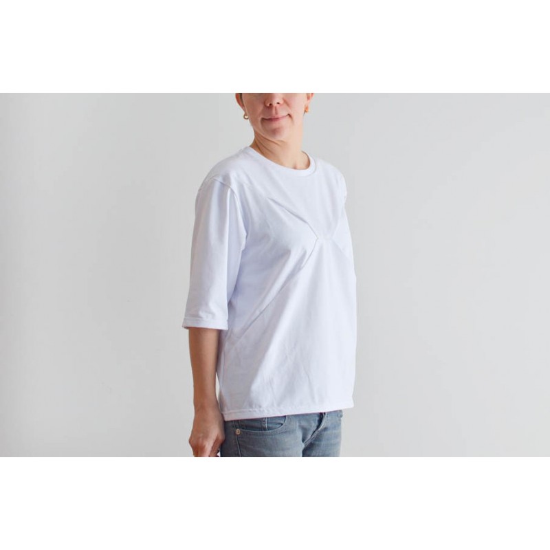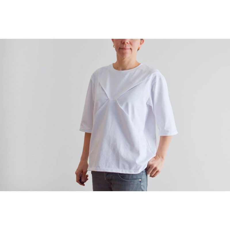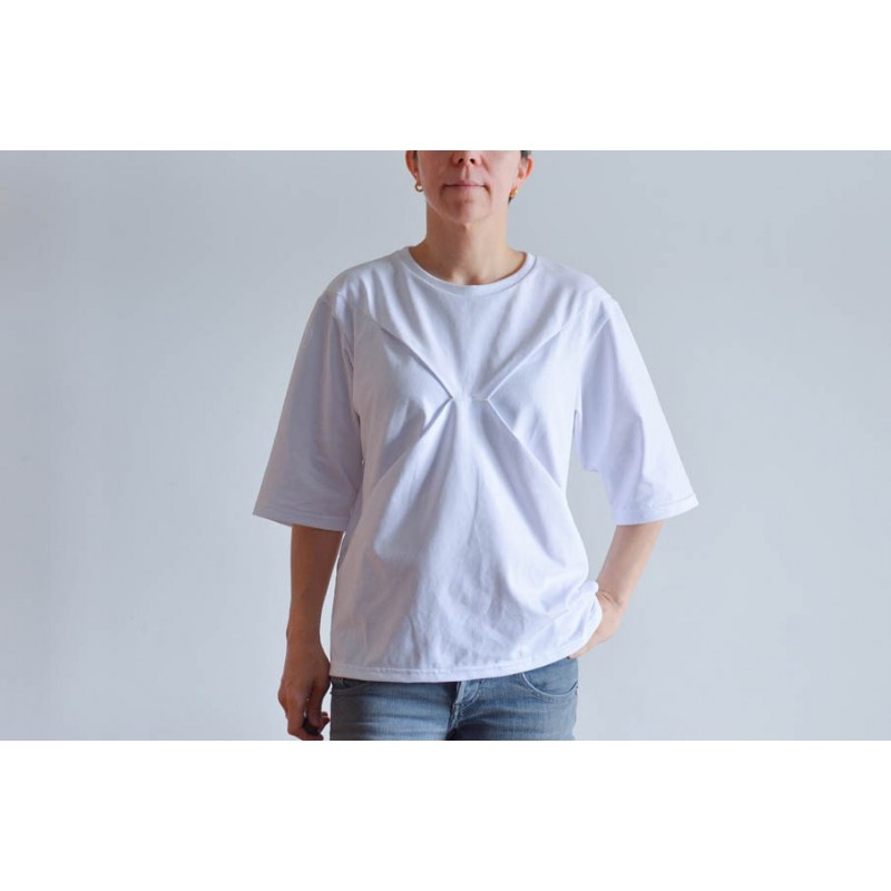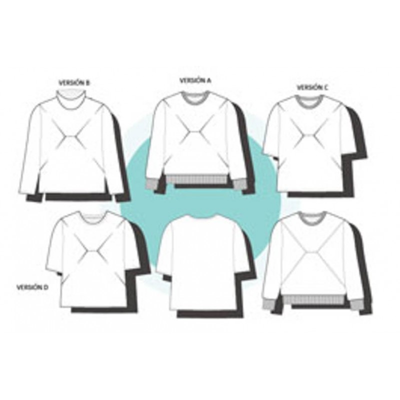 Patrón de adulto Crucis: sudadera y camiseta con manga caída y detalle geométrico formado por pliegues o piezas individuales en el delantero.