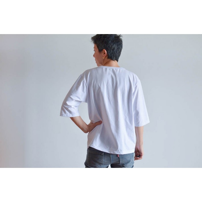 Cose la versión C en tela de punto con cuello normal, manga tres cuartos y remates con dobladillos.