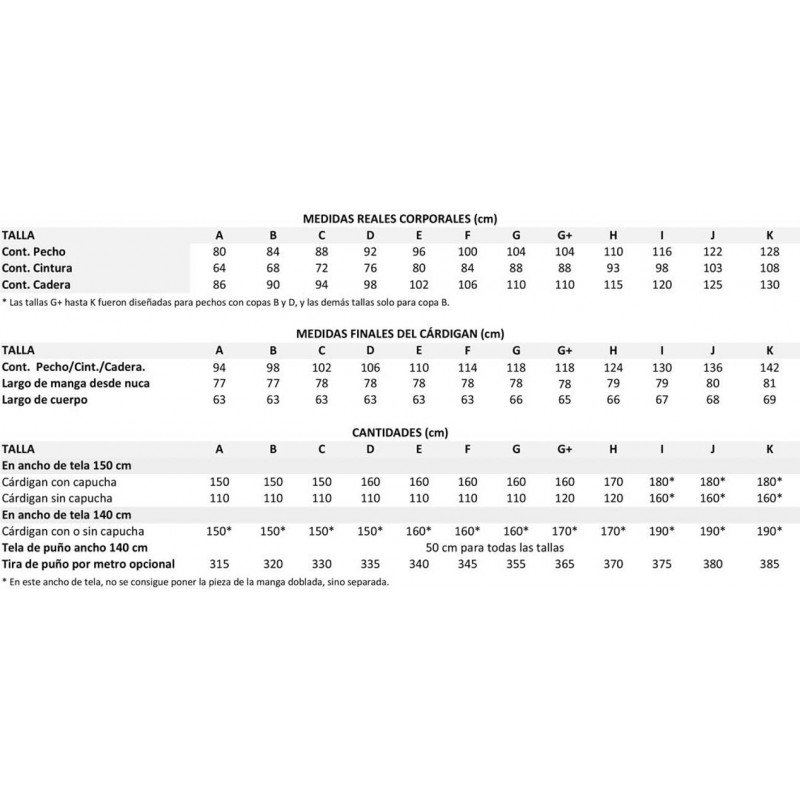 El patrón incluye 11 tallas que van desde 80 hasta 128 cm de contorno de pecho para una persona adulta de 170 cm de estatura. Las tallas A hasta la F han sido elaboradas para contornos de pecho con copa B, las tallas G/G+ hasta la K para copas B y D.
