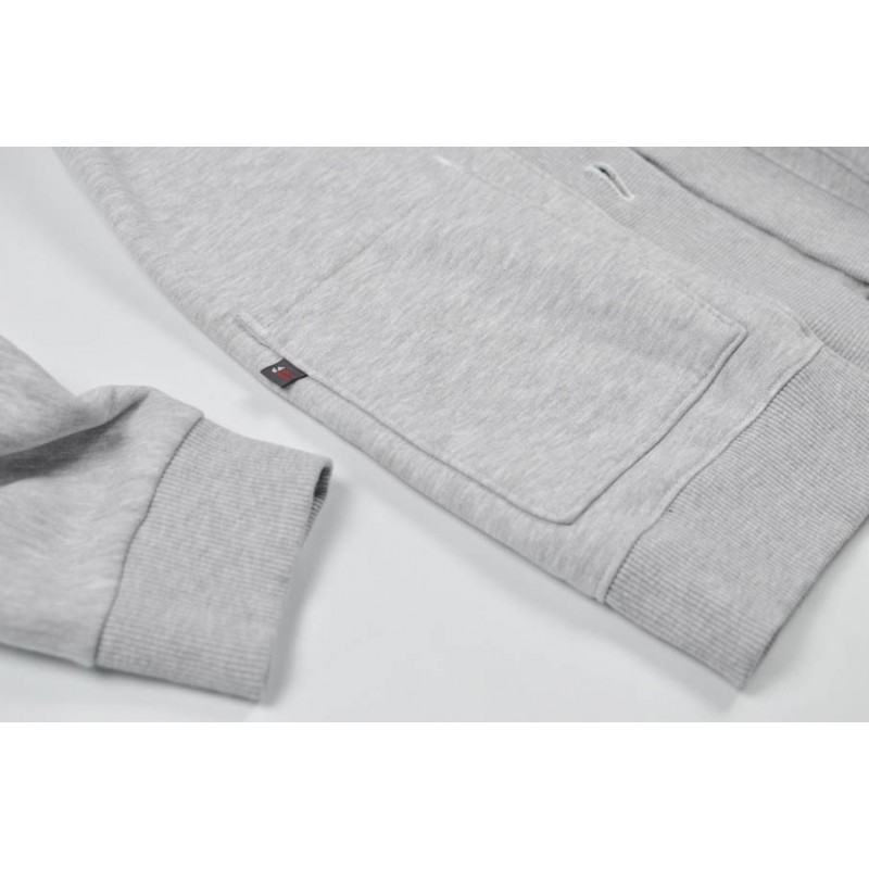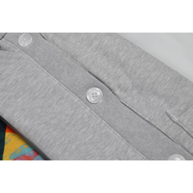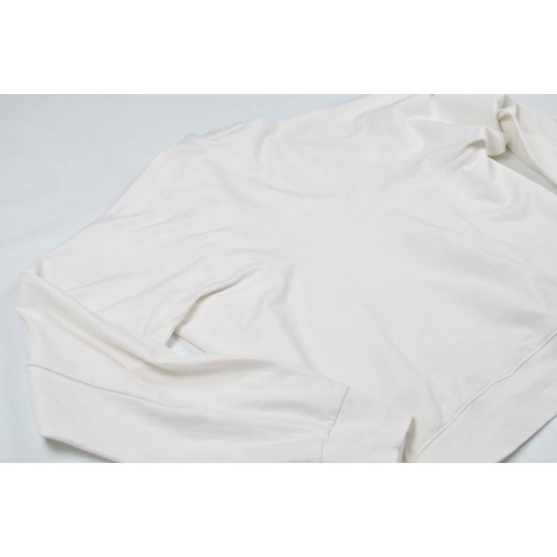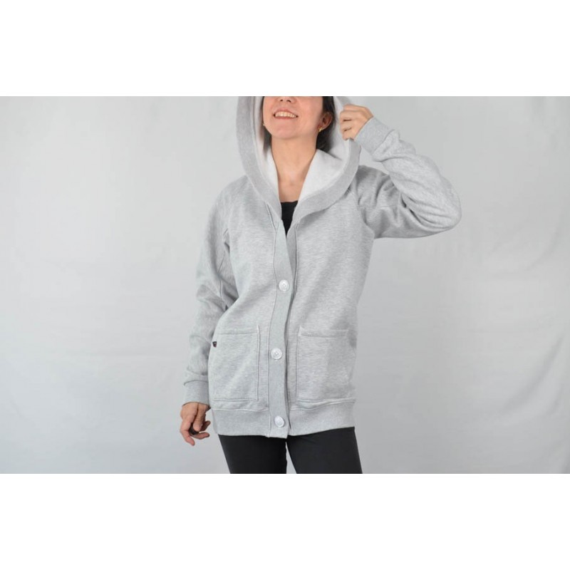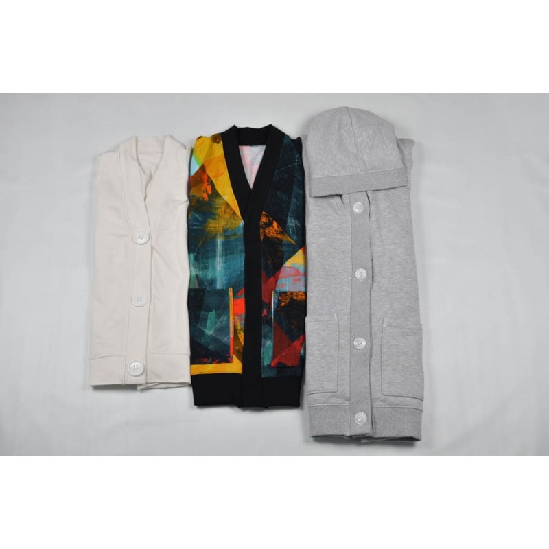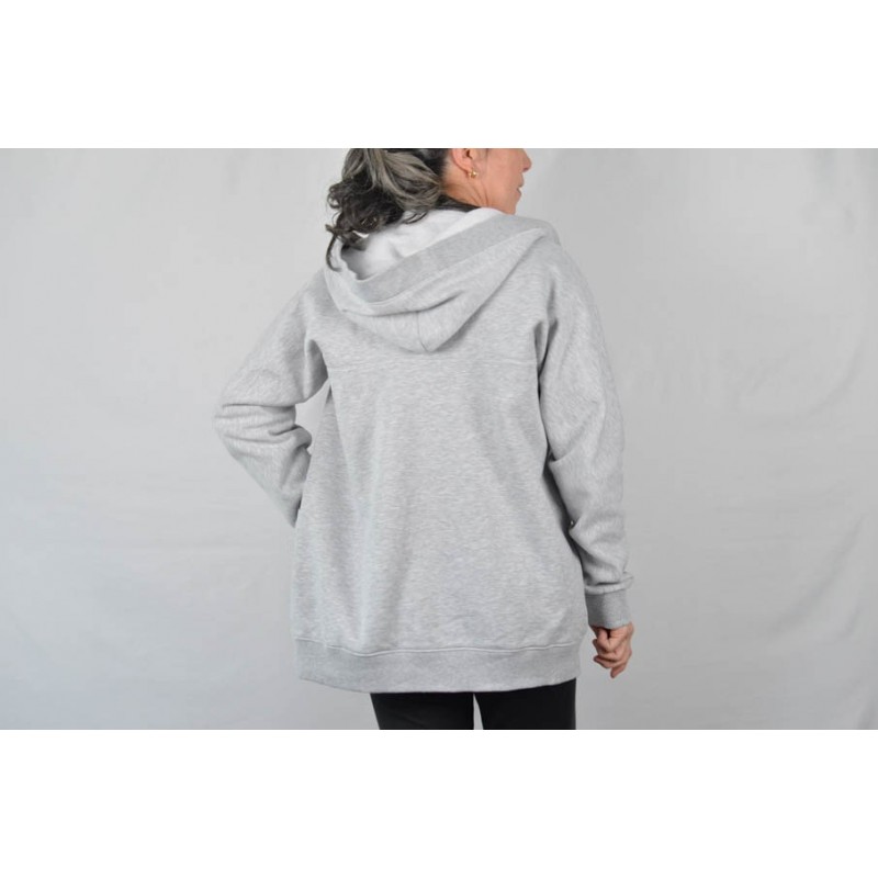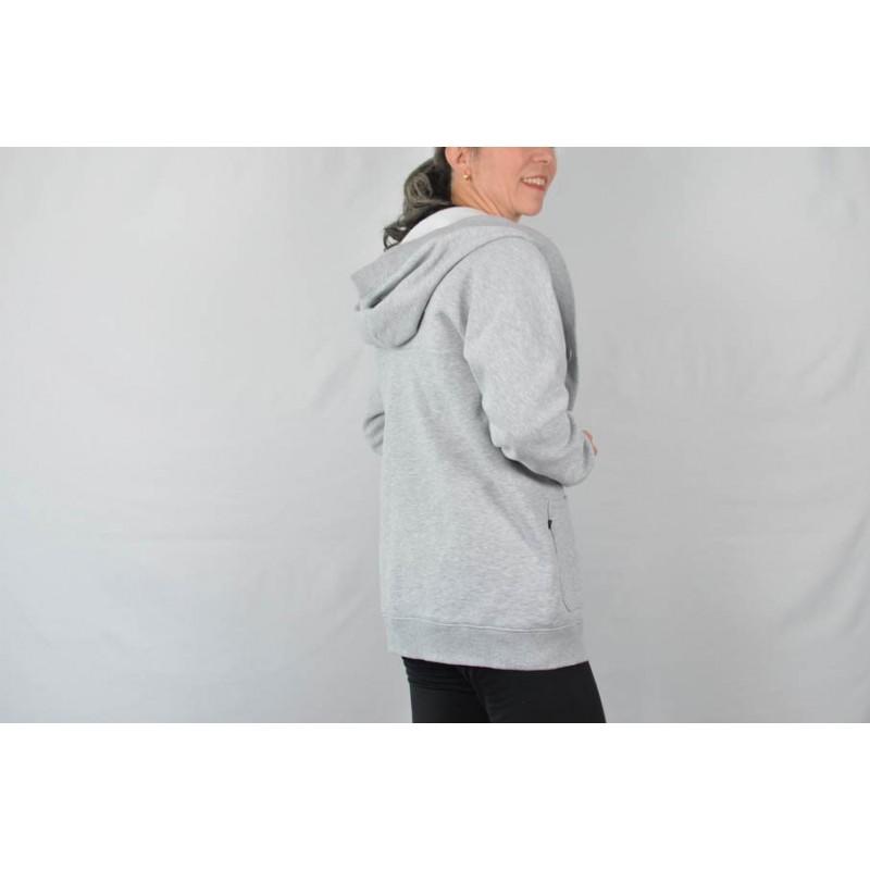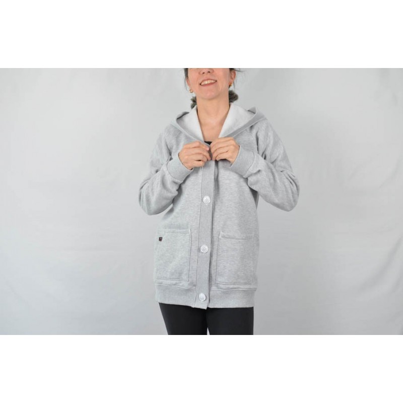 Telas para cuerpo y capucha: tela de punto o jersey con elasticidad. Tela de puño para la botonera, bocamanga y bajo. Botones y trozo de entretela.