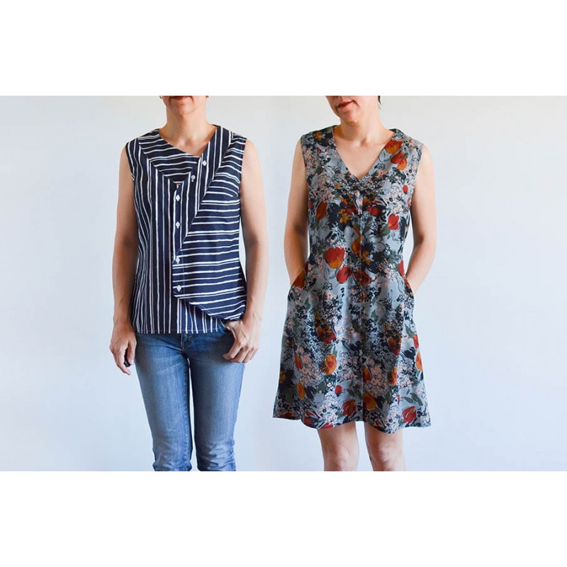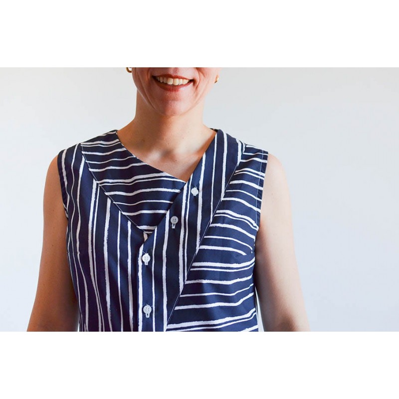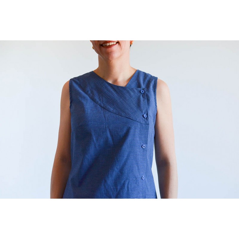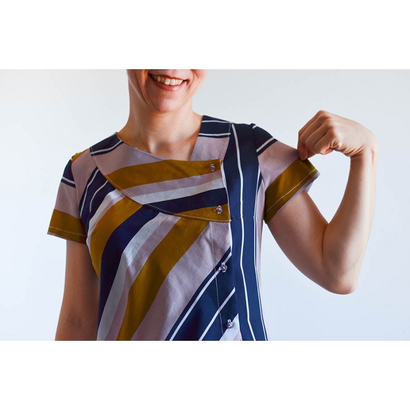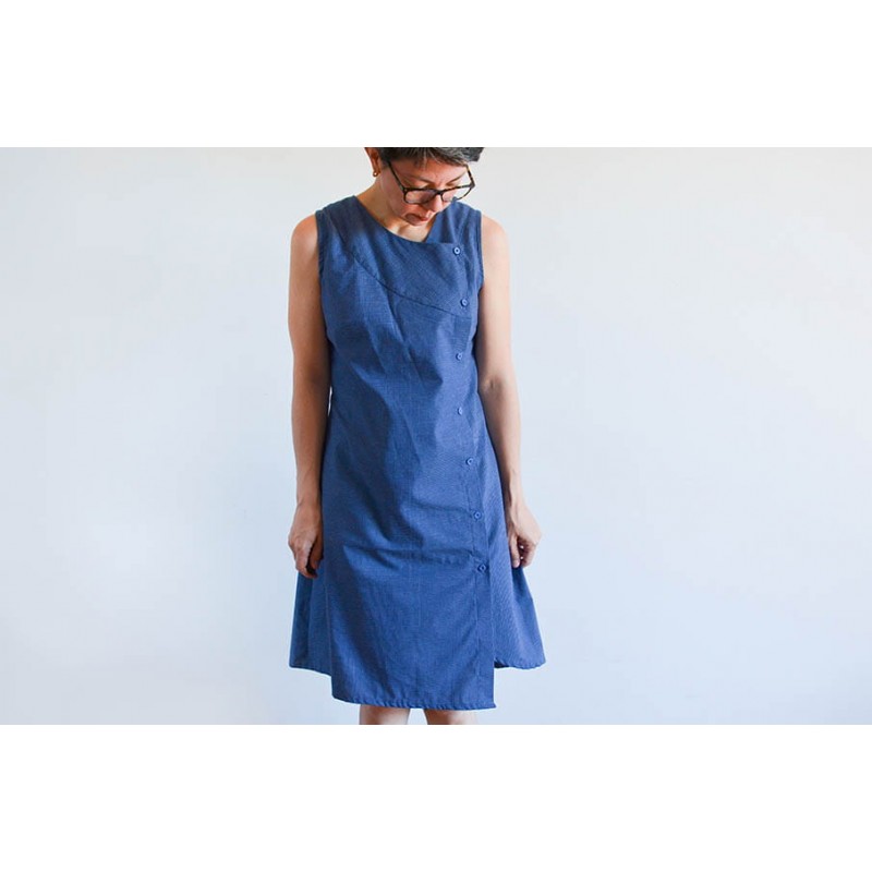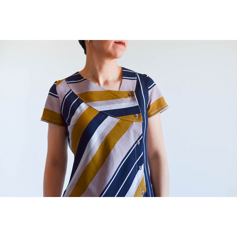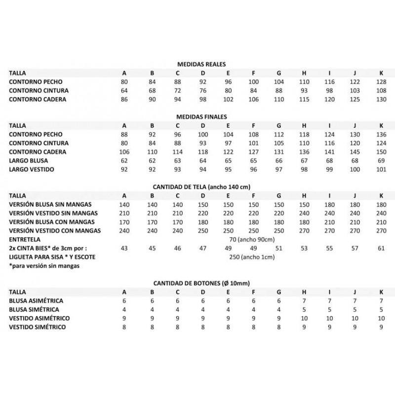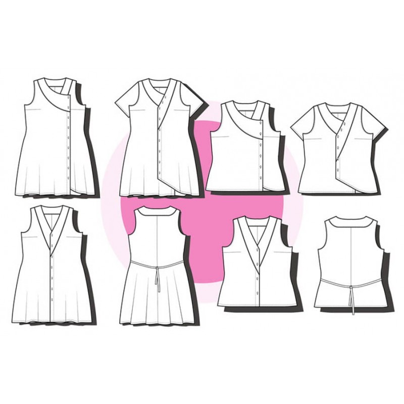 Patrón de vestido y blusa de adulto Iris. Vestido y blusa con botonera asimétrica o simétrica. Incluye instrucciones para hacer vestido simétrico sin botones. Con mangas, cinta de atar en la cintura y bolsillos laterales.