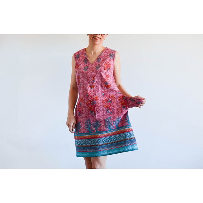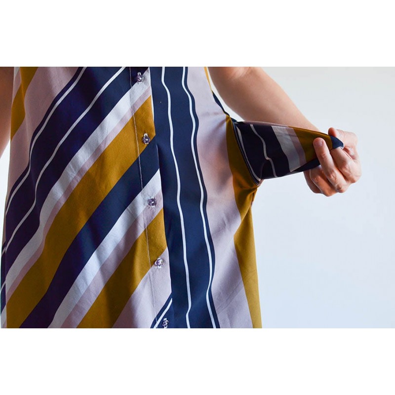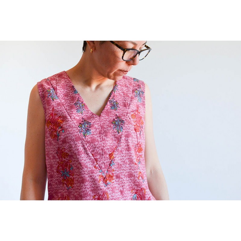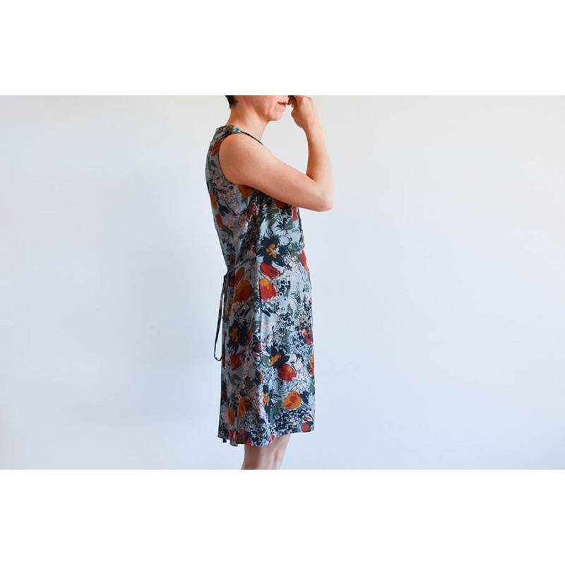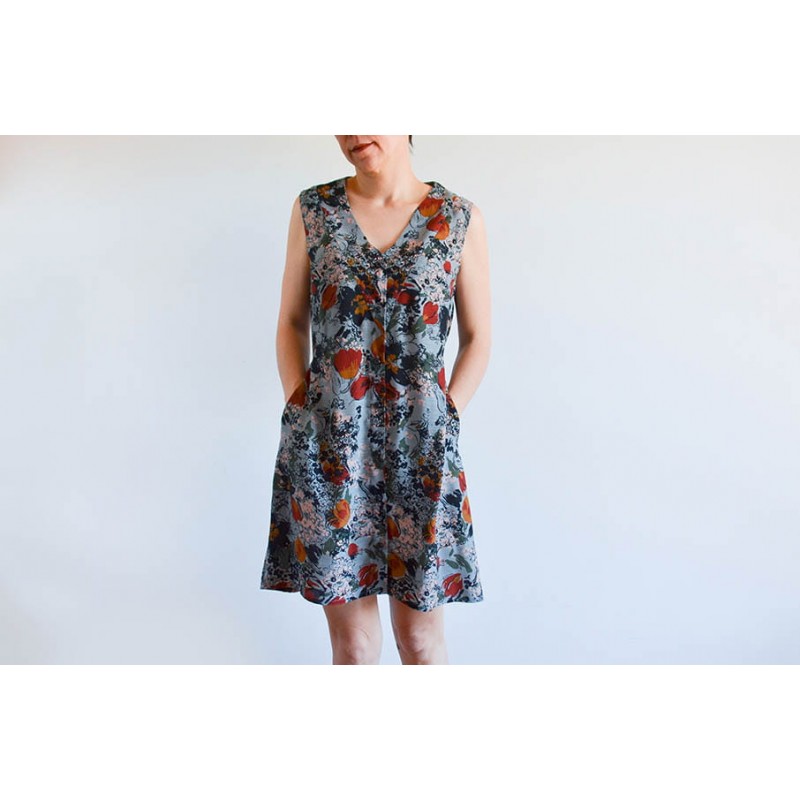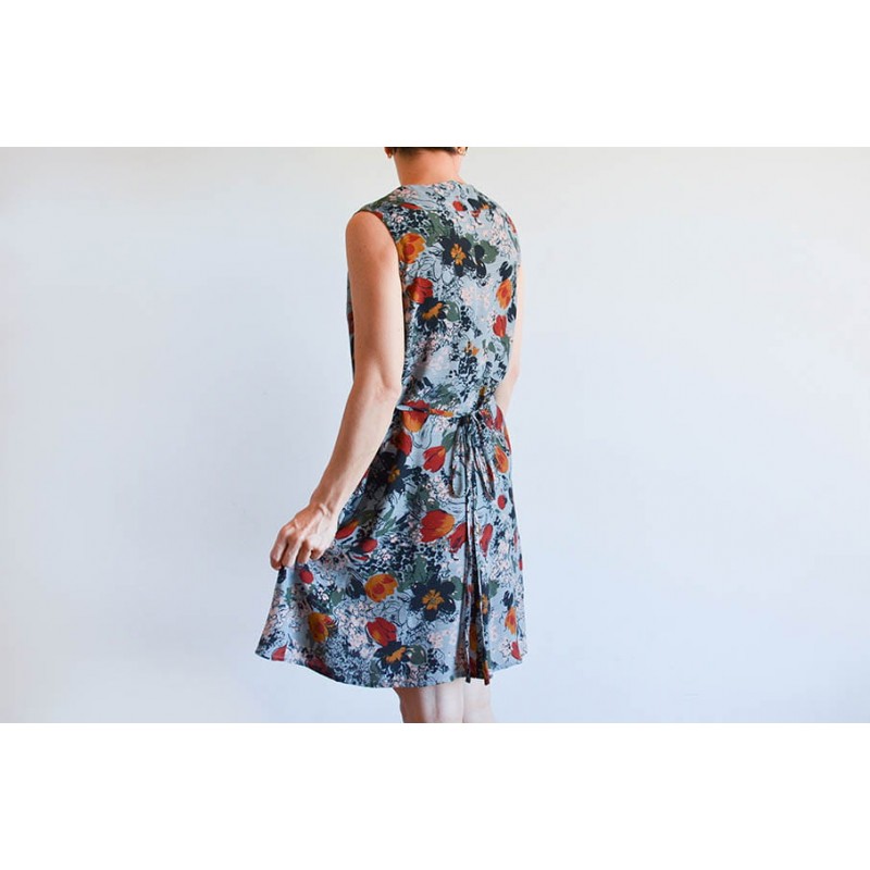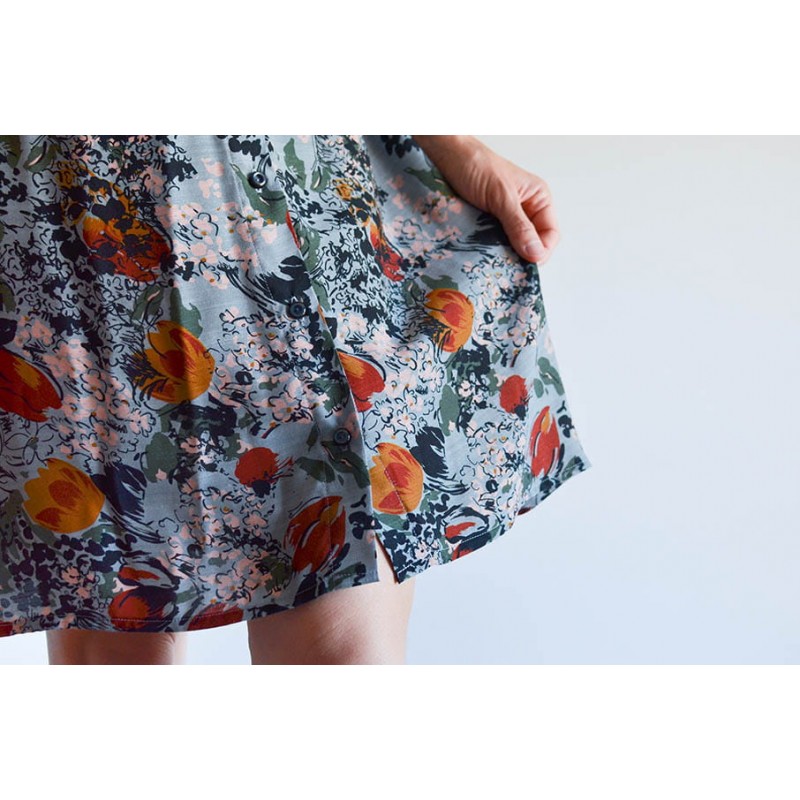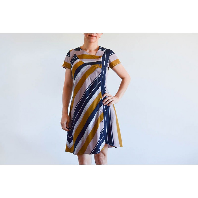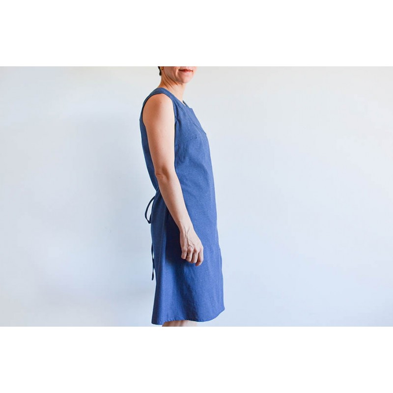Patrón de vestido y blusa de adulto Iris. Vestido y blusa con botonera asimétrica o simétrica. Incluye instrucciones para hacer vestido simétrico sin botones. Con mangas, cinta de atar en la cintura y bolsillos laterales.