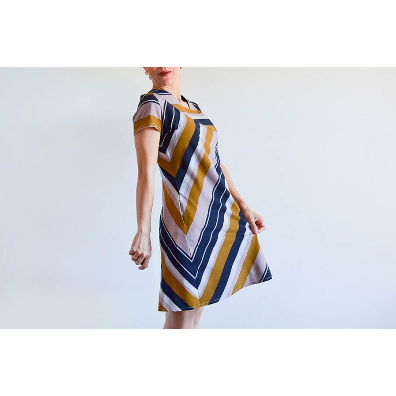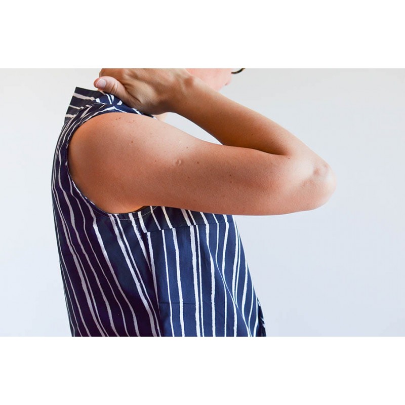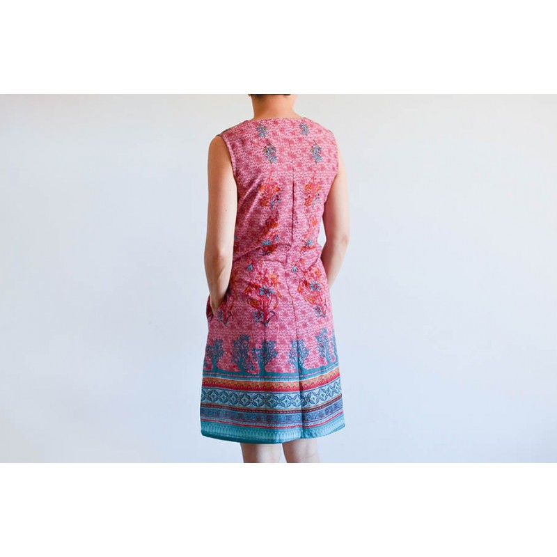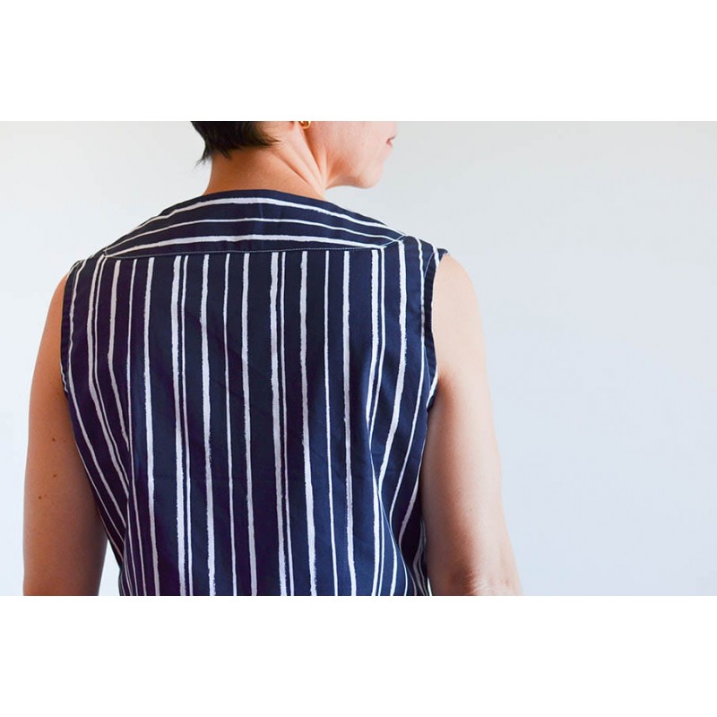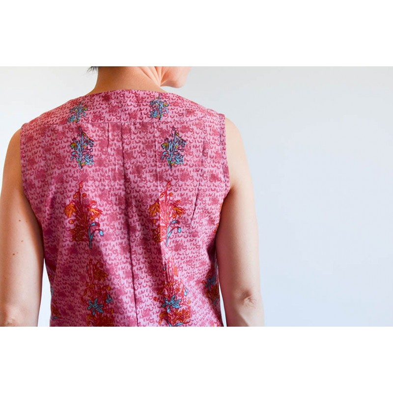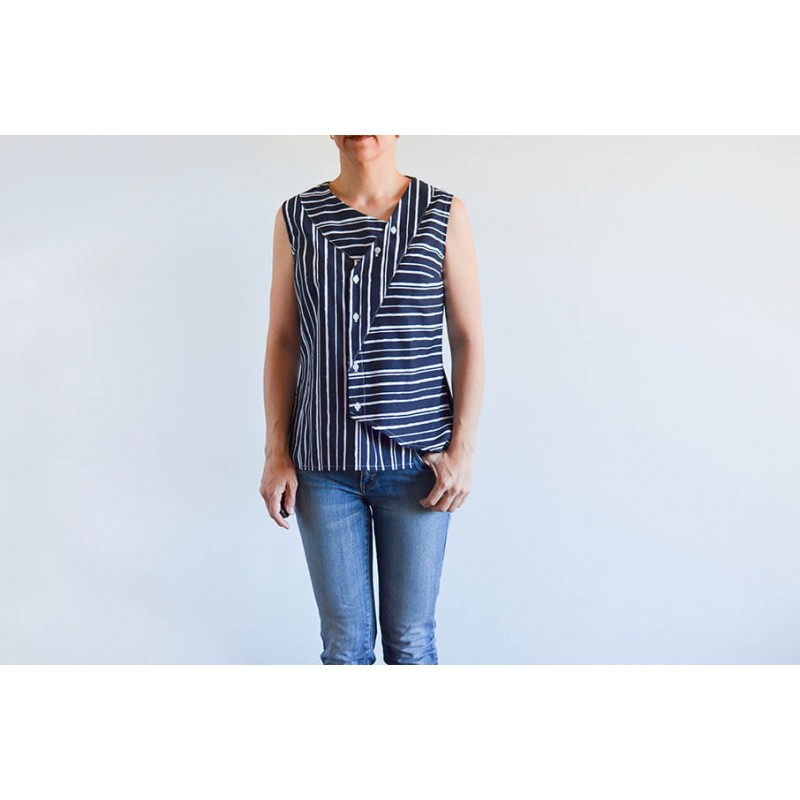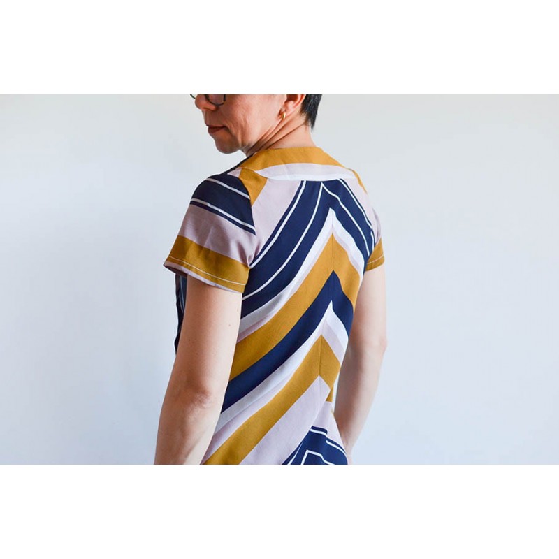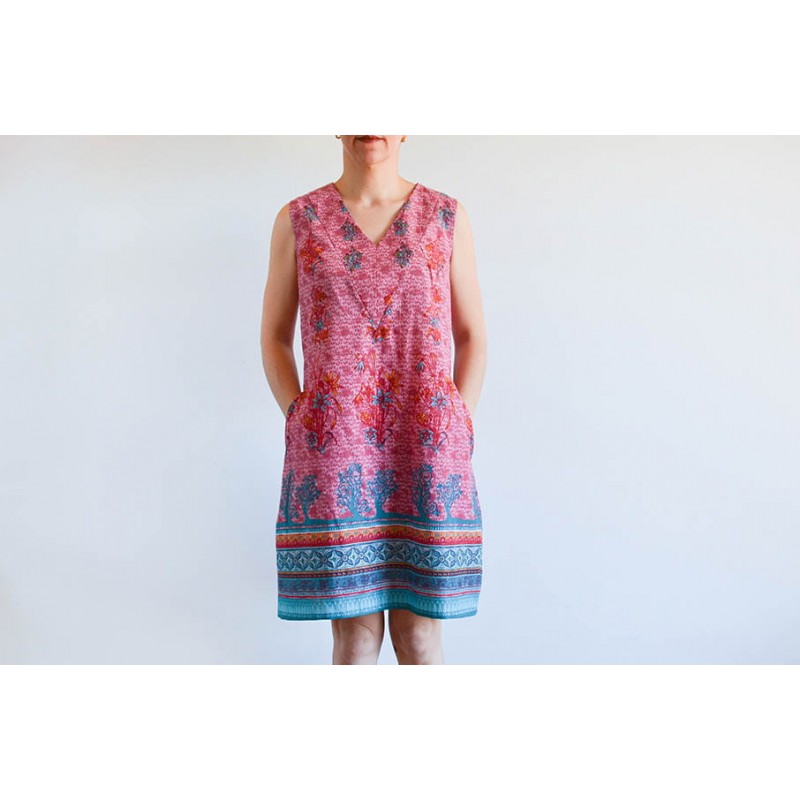Patrón de vestido y blusa de adulto Iris. Vestido y blusa con botonera asimétrica o simétrica. Incluye instrucciones para hacer vestido simétrico sin botones. Con mangas, cinta de atar en la cintura y bolsillos laterales.