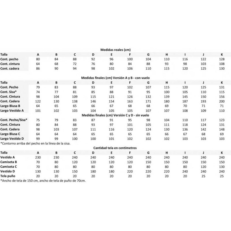 Las tallas incluidas en el patrón van desde el contorno de pecho 80 a 128 cm. Este patrón fue elaborado sobre un patrón base con características de cuerpos del sexo femenino y copa de pecho B.