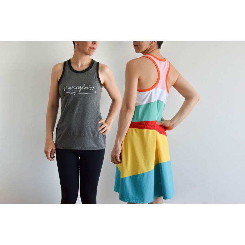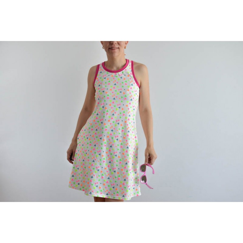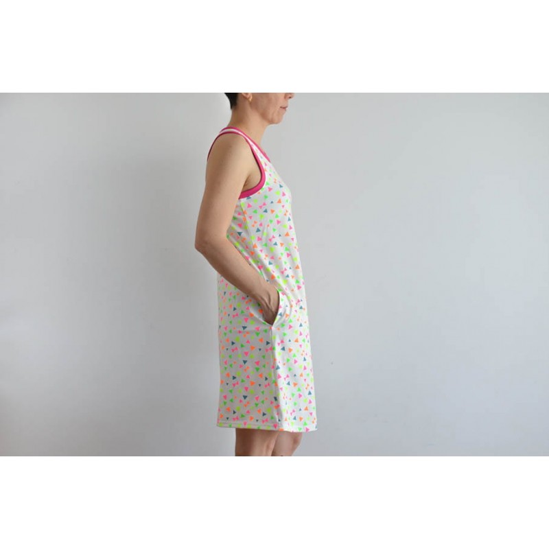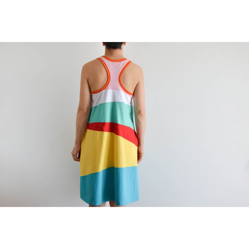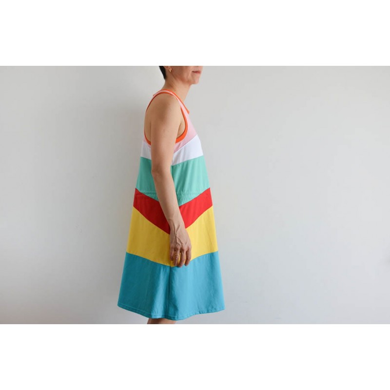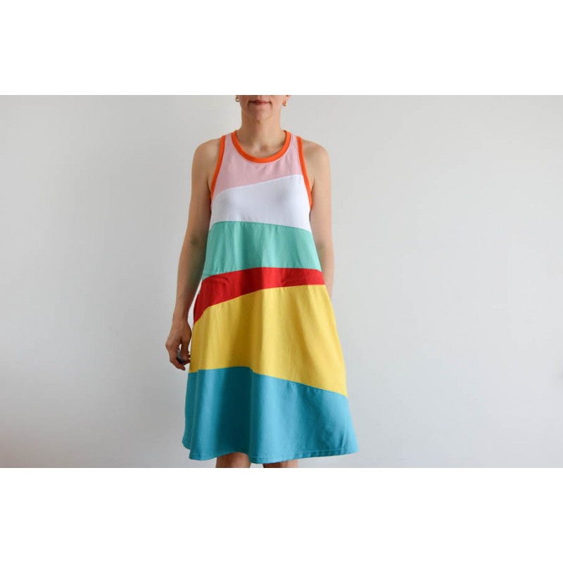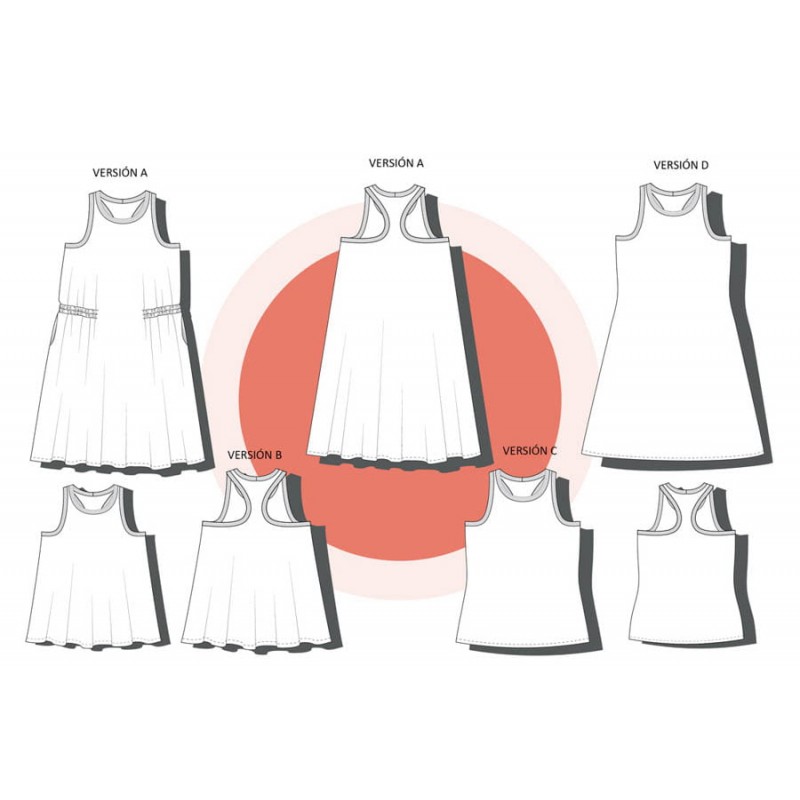 Patrón de adulto Lilium: vestido y camiseta con espalda nadador. Versión con vuelo con ajuste en la cintura y sin vuelo con falda evasé. Dobladillo en bajo, sisas y cuello rematados con tela de puño. Vestido con bolsillos en los costados. *El delantero y la espalda son una pieza entera en el patrón. Puedes hacer combinaciones diversas a tu gusto dividiendo las piezas. El vestido de colorines fue hecho cortando las piezas del delantero y espalda en varios colores, el patrón no incluye esta opción.