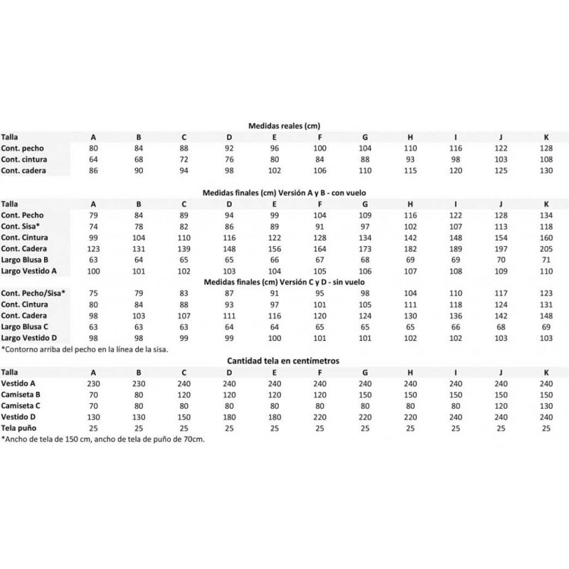 Las tallas incluidas en el patrón van desde el contorno de pecho 80 a 128 cm. Este patrón fue elaborado sobre un patrón base con características de cuerpos del sexo femenino y copa de pecho B.