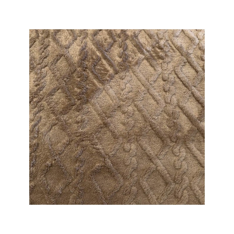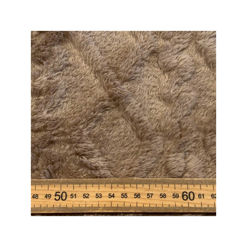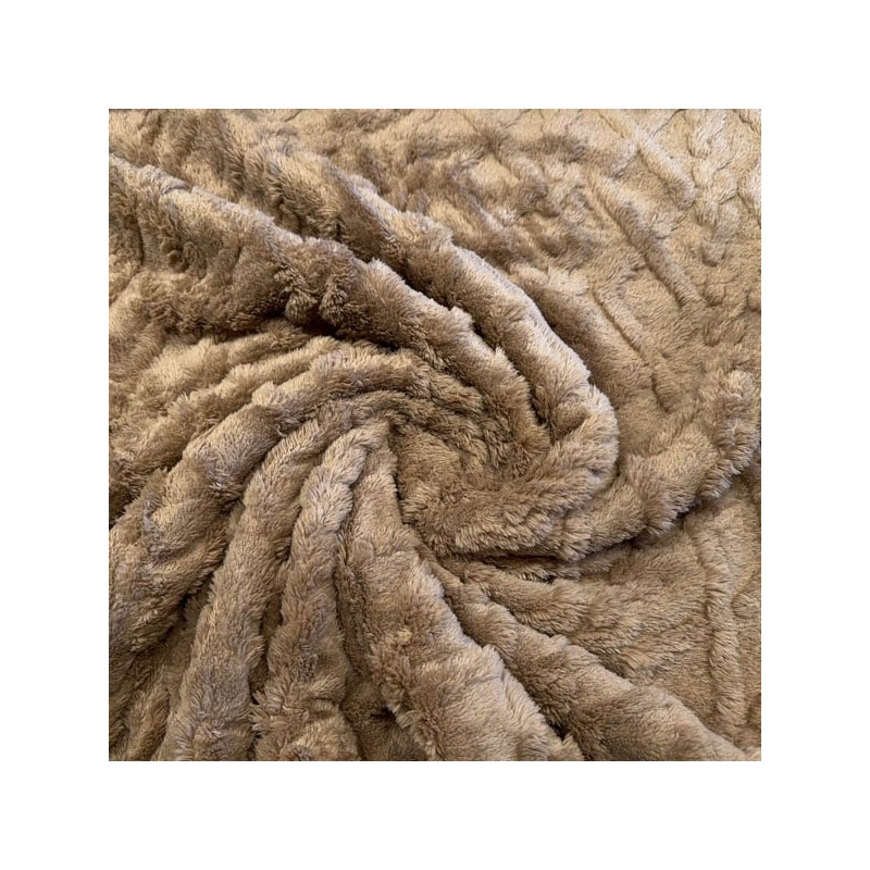 Tela de coralina con relive en trenzado con una composición 100% poliéster y un ancho de entre 140-150 cm. La coralina es una tela con grosor de manta pero con aspecto y tacto de terciopelo. Un lado suele tener pelo más largo y otro más corto.