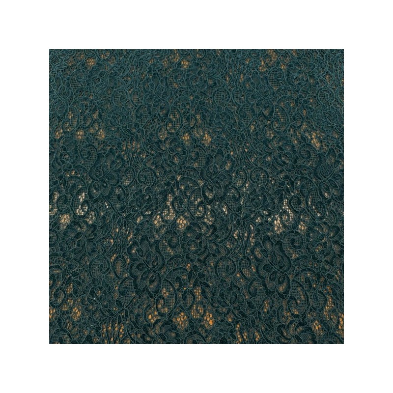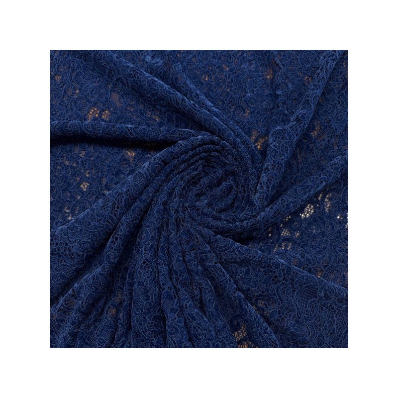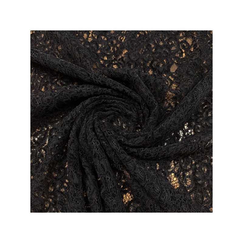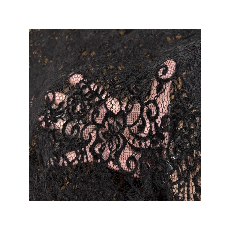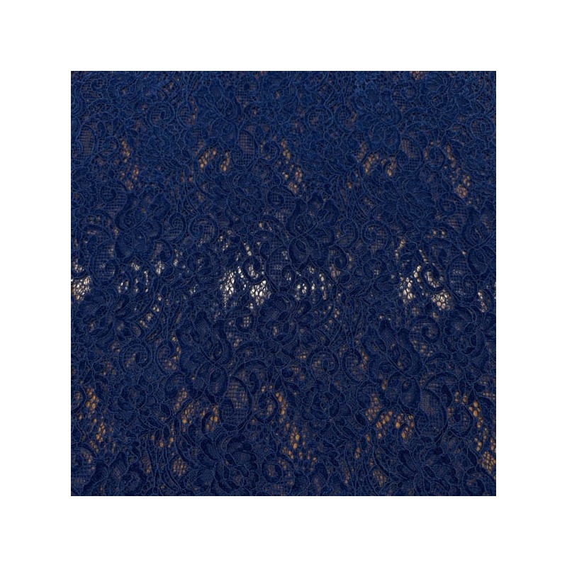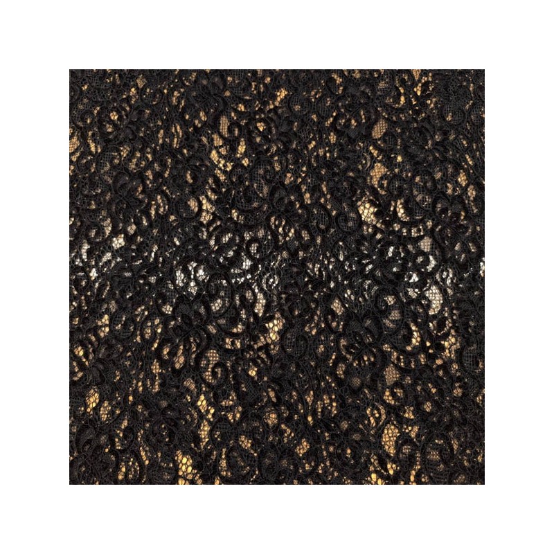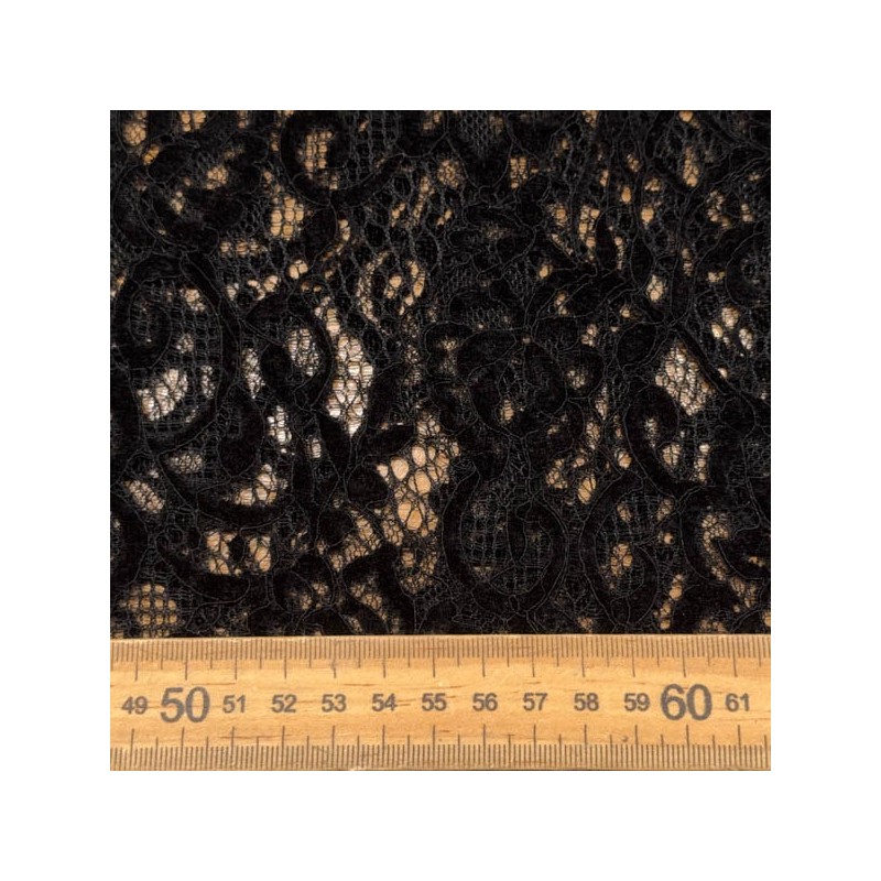 Tela de blonda con aplicaciones de suave chenilla con una composición 55% poliéster, 45% poliamida y un ancho de 150 cm. Esta tela es calada, con acabdo de onda en el lateral y nada tiesa. Ideal para blusas, mantillas, tops, chaquetas ...