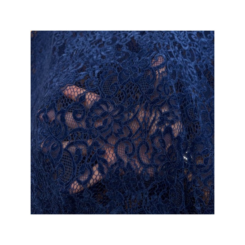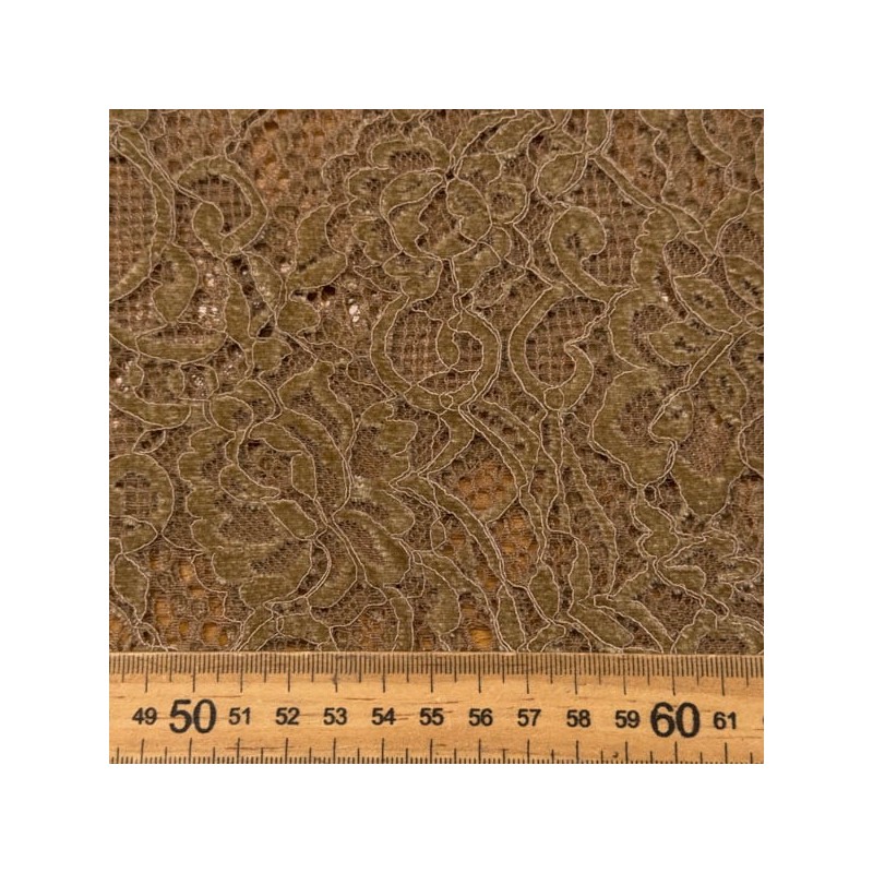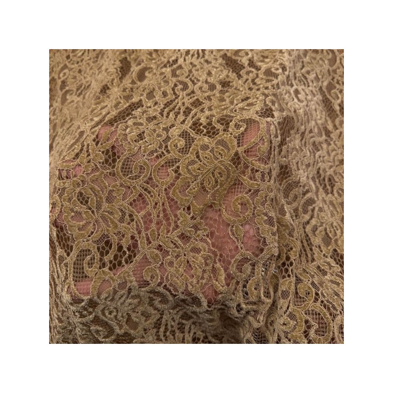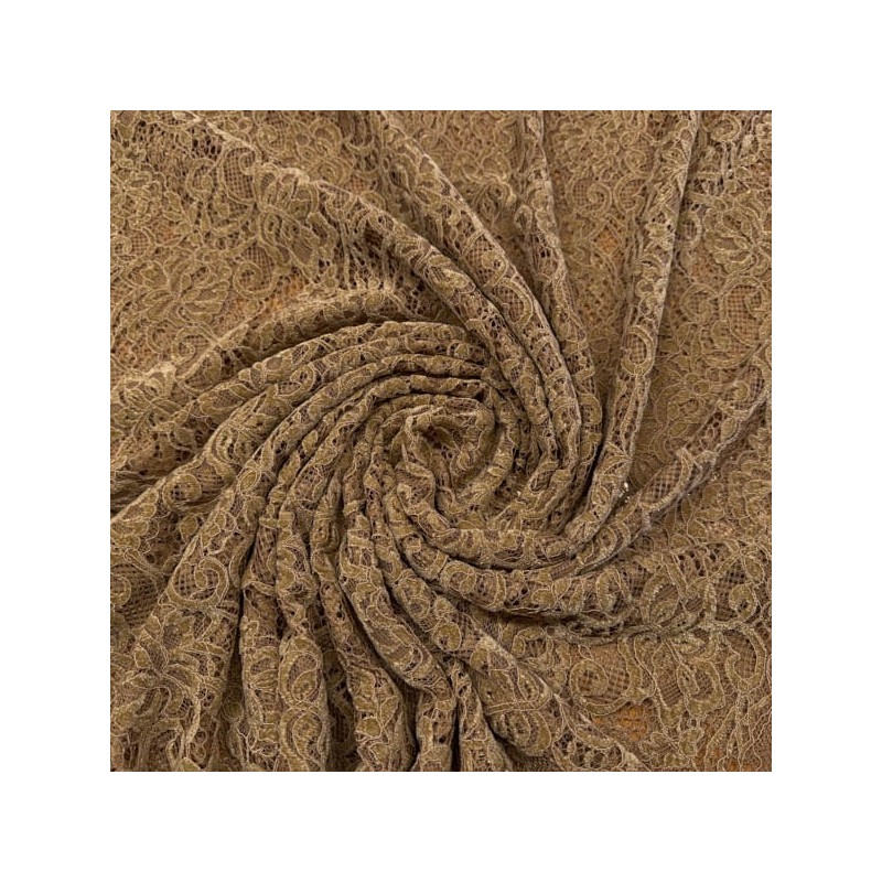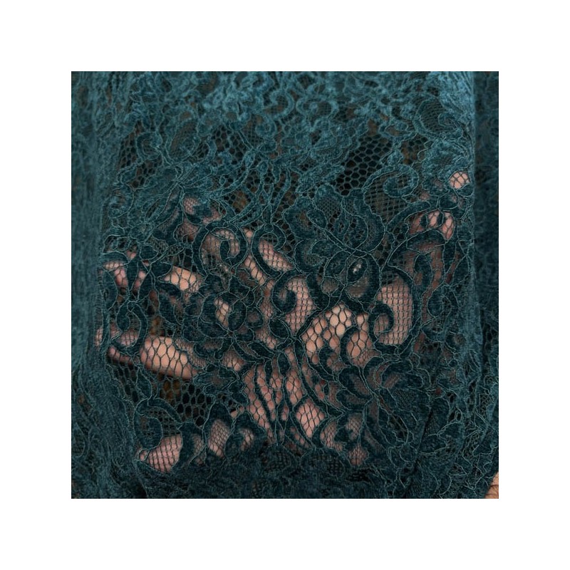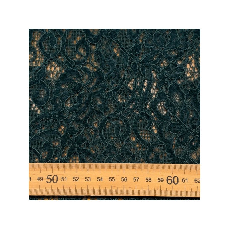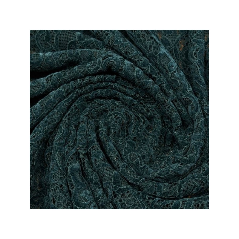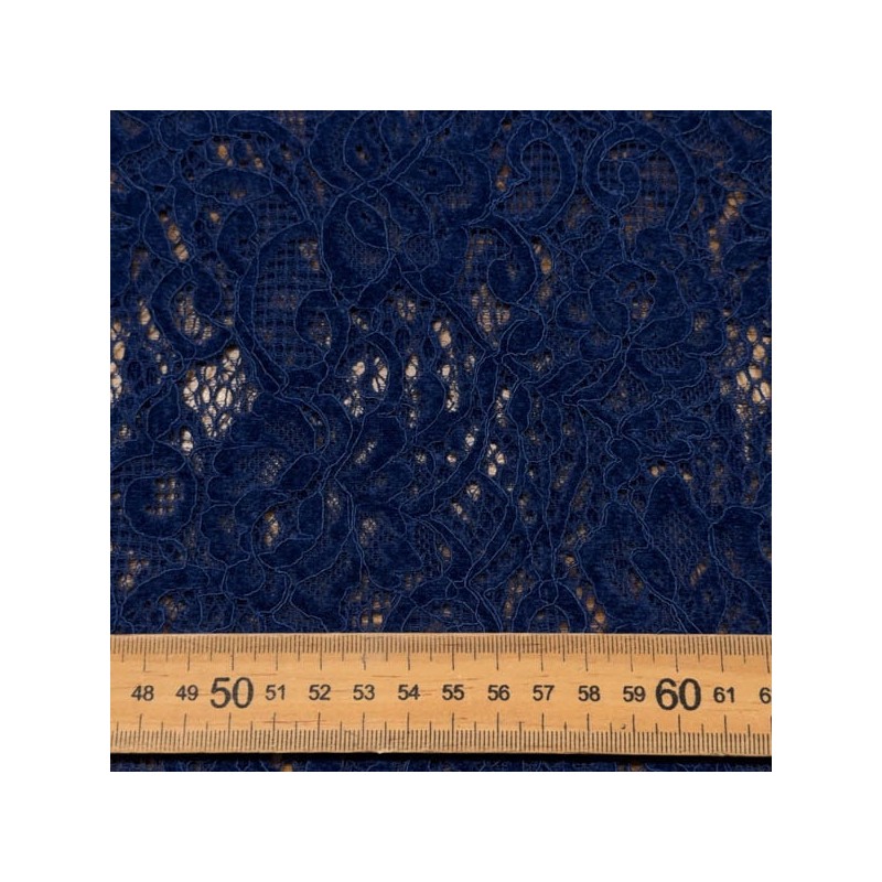 Tela de blonda con aplicaciones de suave chenilla con una composición 55% poliéster, 45% poliamida y un ancho de 150 cm. Esta tela es calada, con acabdo de onda en el lateral y nada tiesa. Ideal para blusas, mantillas, tops, chaquetas ...